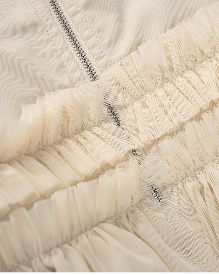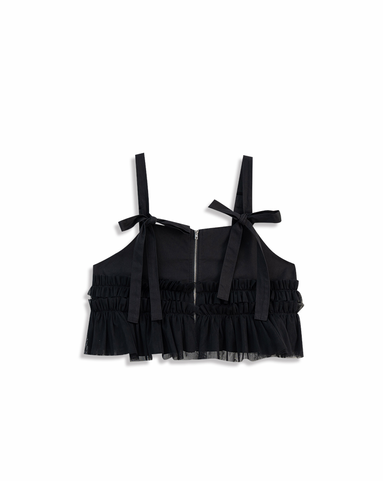 多層網紗剪接綁帶拉鍊背心-黑 S/M