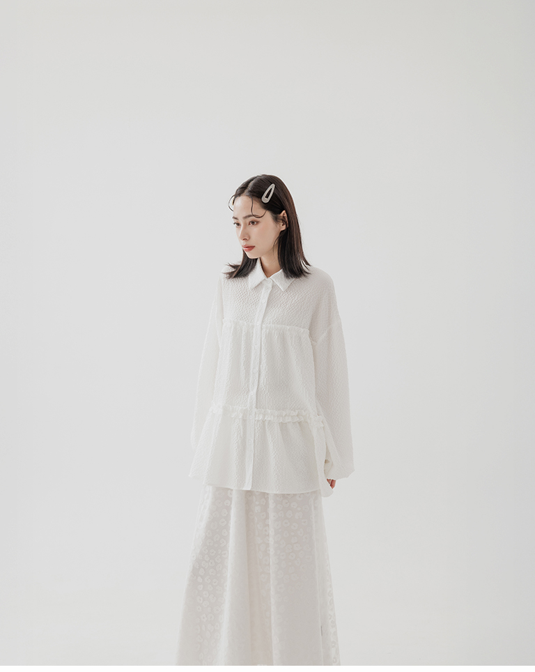 S~L身形實測!分尺寸皺皺木耳邊透膚高領長袖上衣