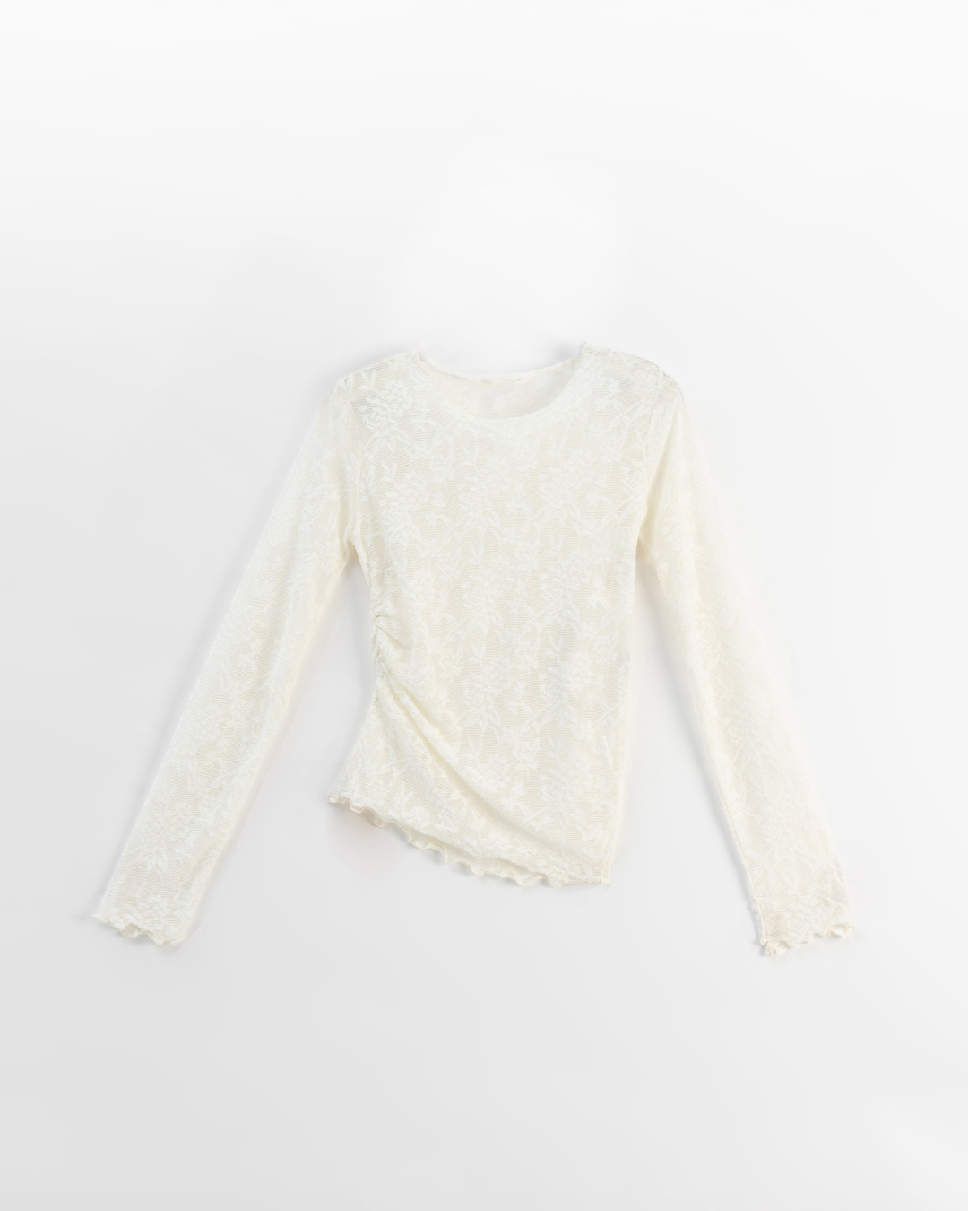 S~L身形實測!分尺寸皺皺木耳邊透膚高領長袖上衣