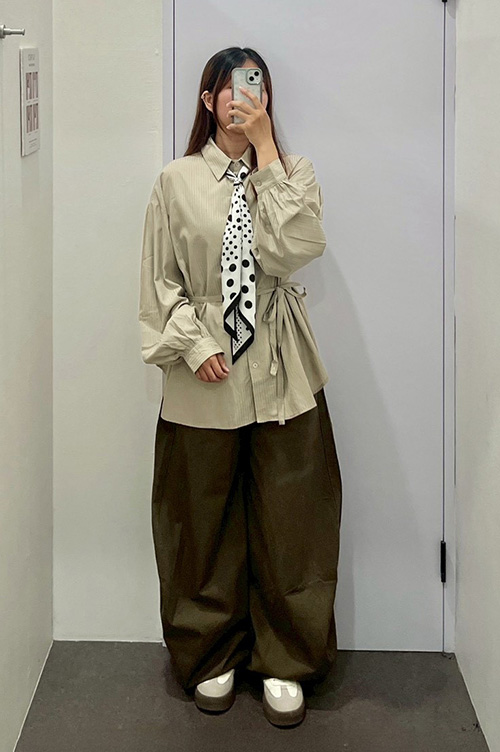 直條細格打褶附綁帶設計襯衫-卡其