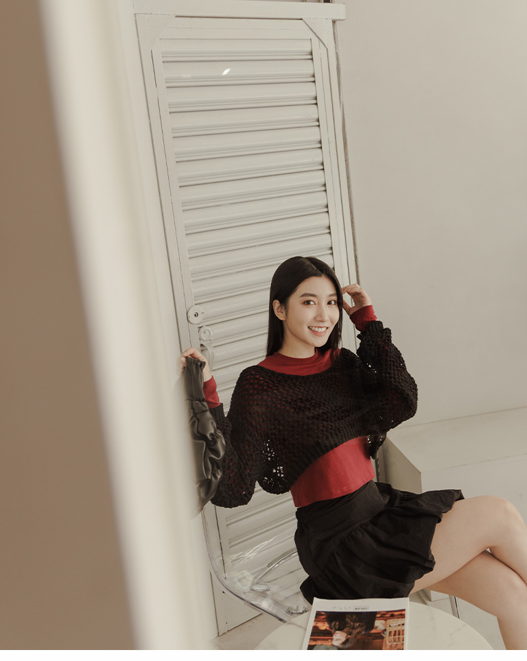S~L身形實測!分尺寸皺皺木耳邊透膚高領長袖上衣