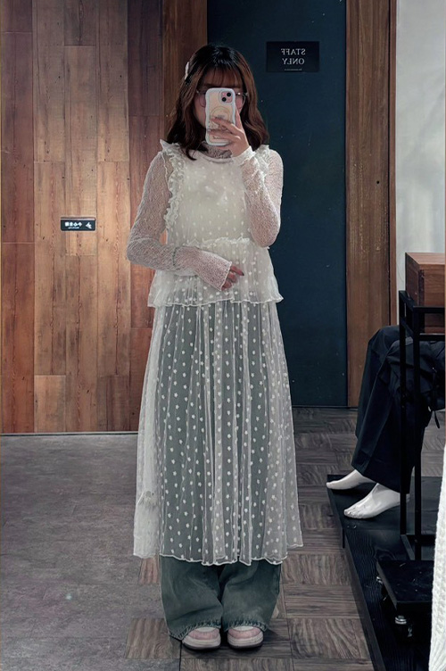 S~L身形實測!分尺寸皺皺木耳邊透膚高領長袖上衣