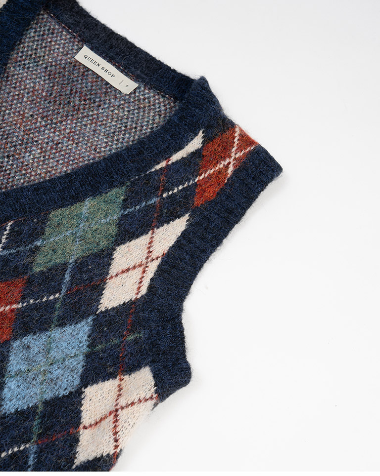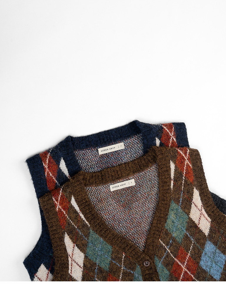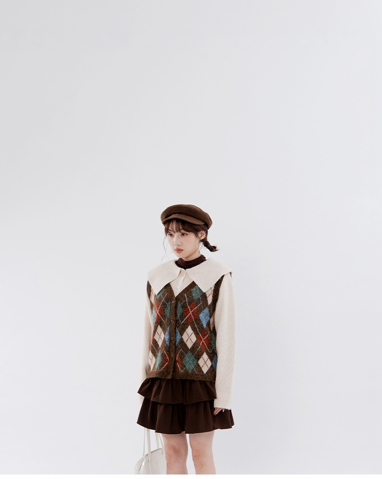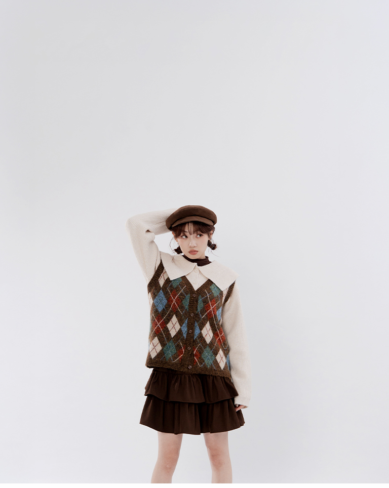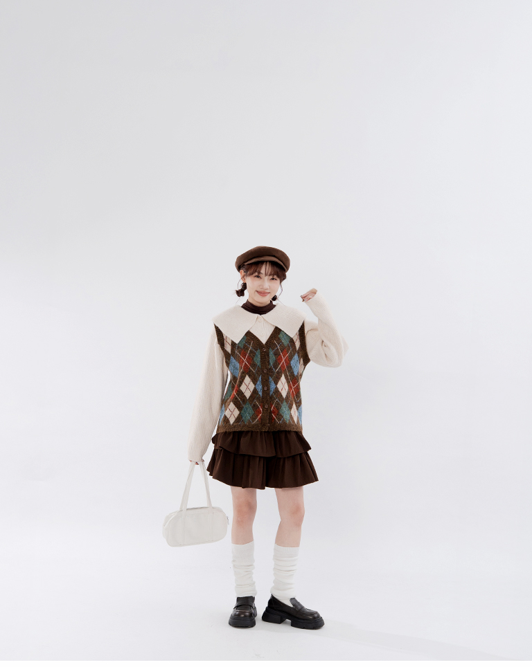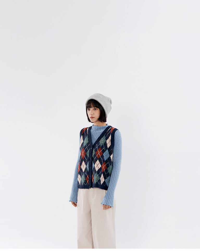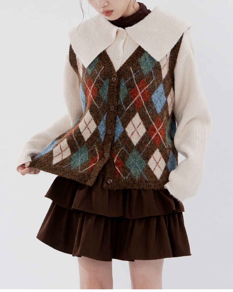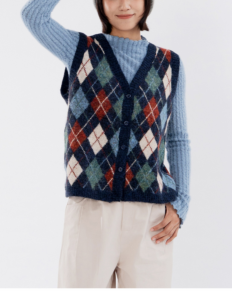 配色菱格紋V領針織背心 兩色售
