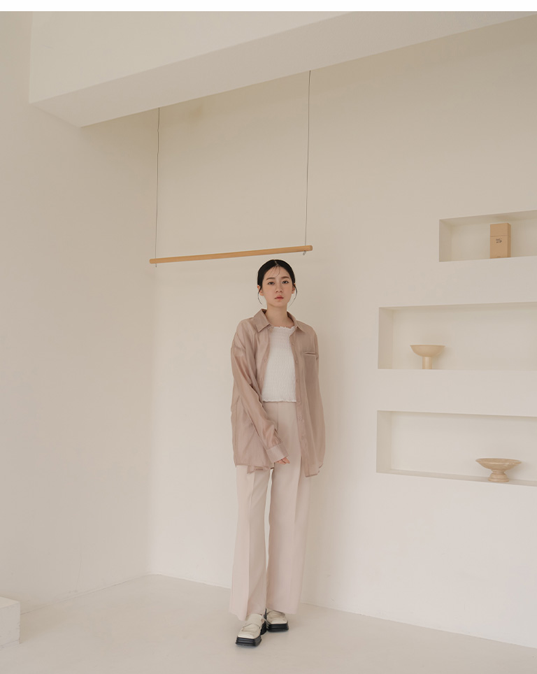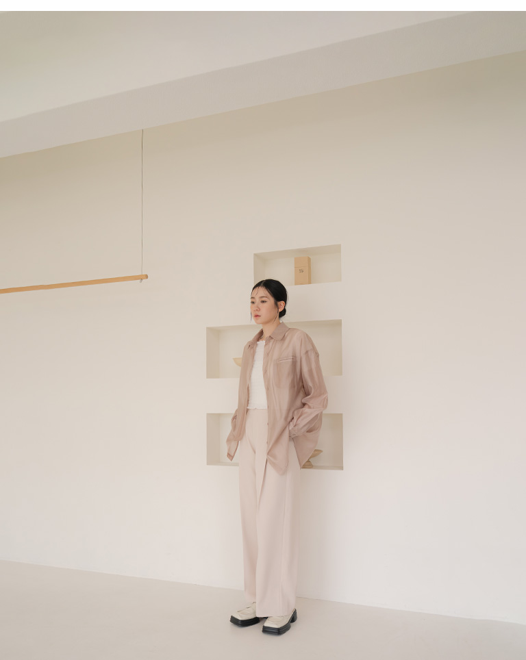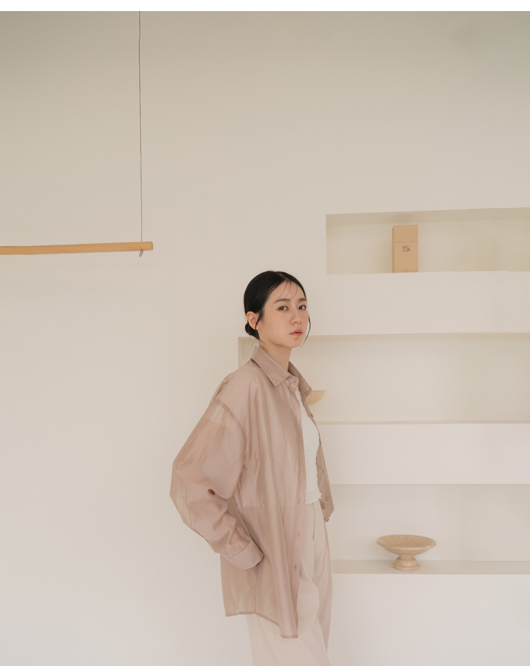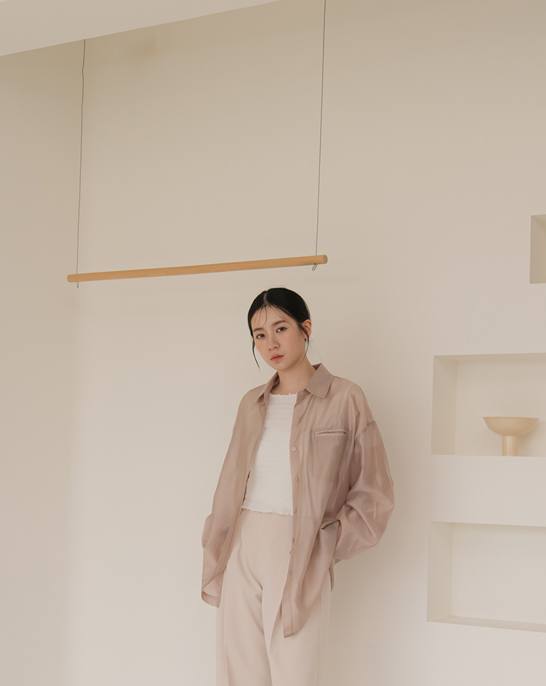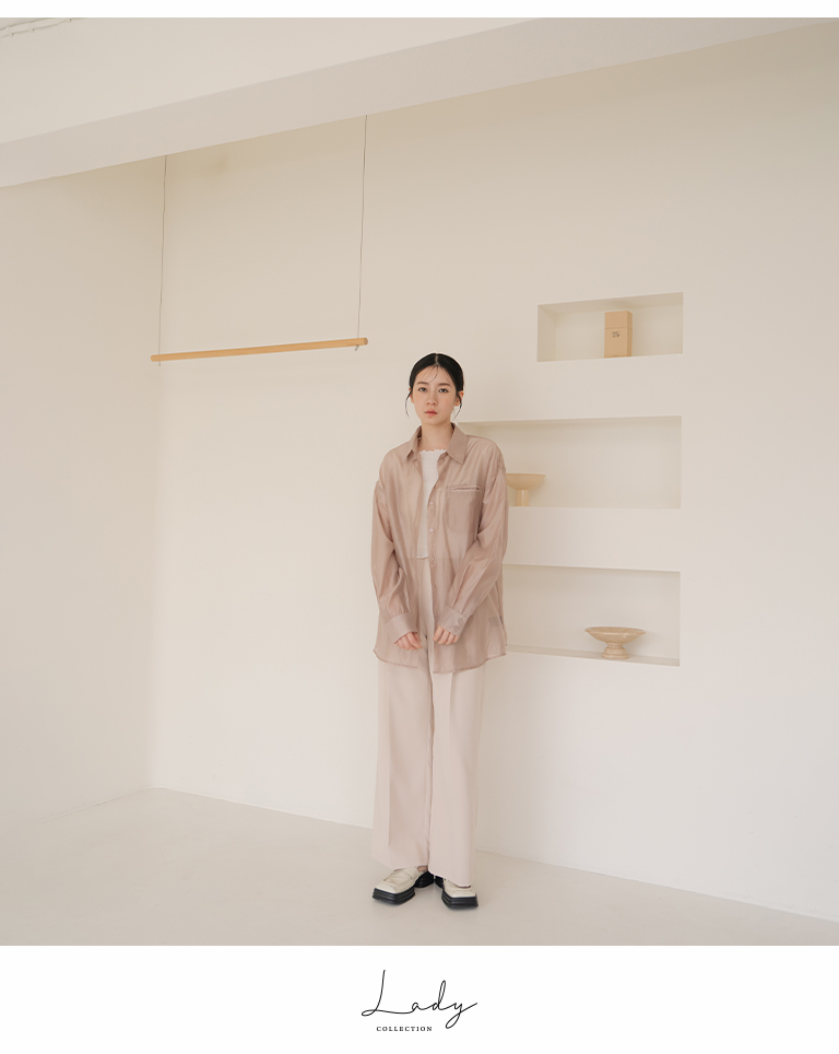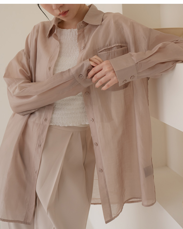質感光澤單口袋透膚襯衫-卡其