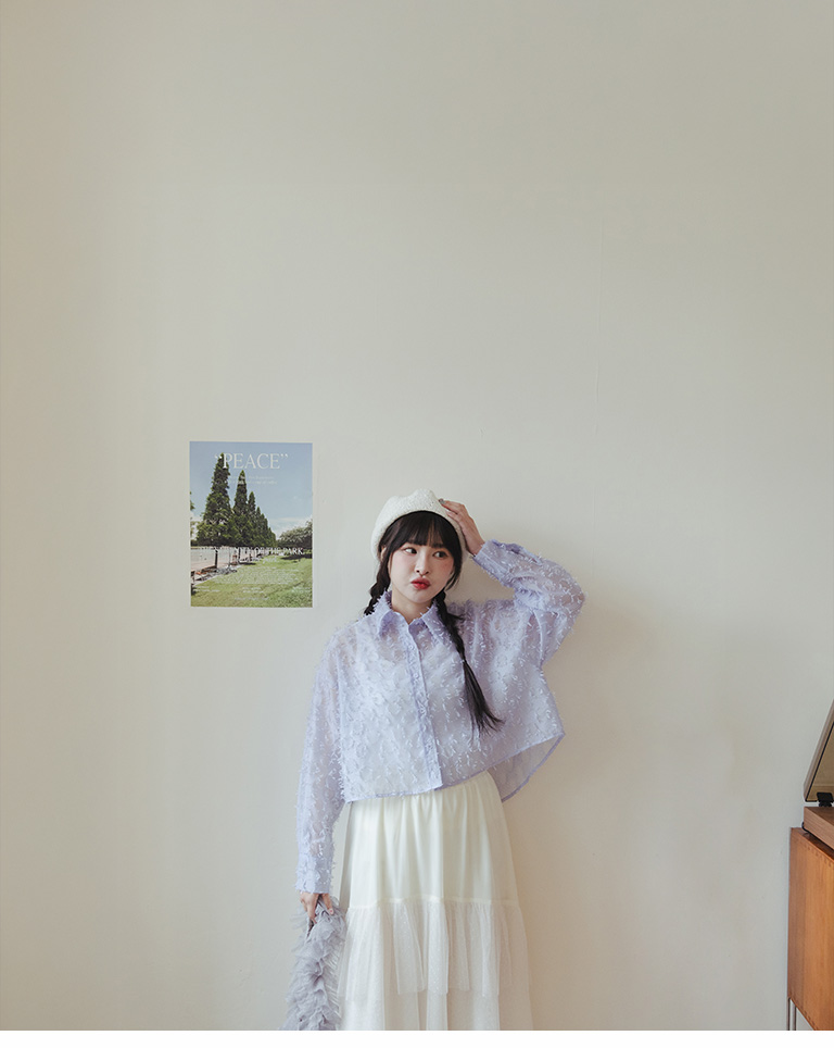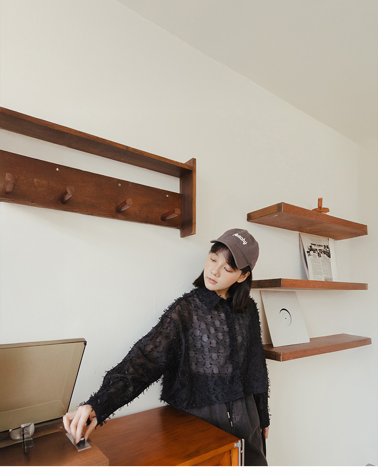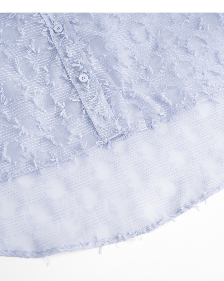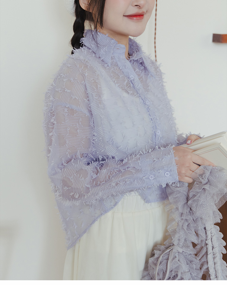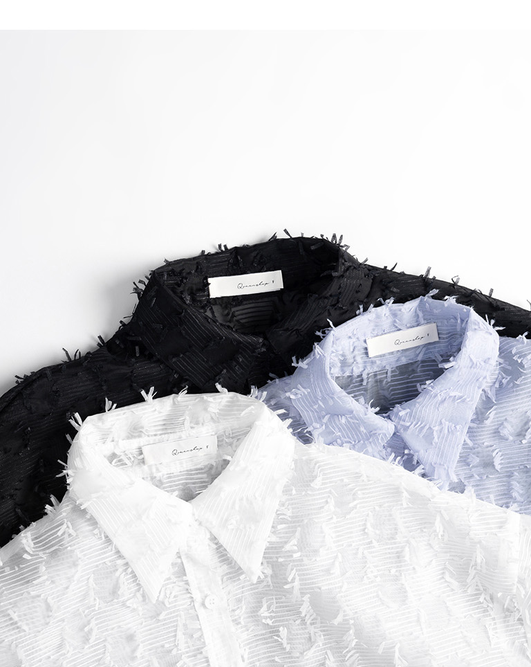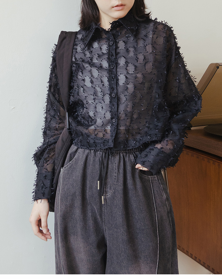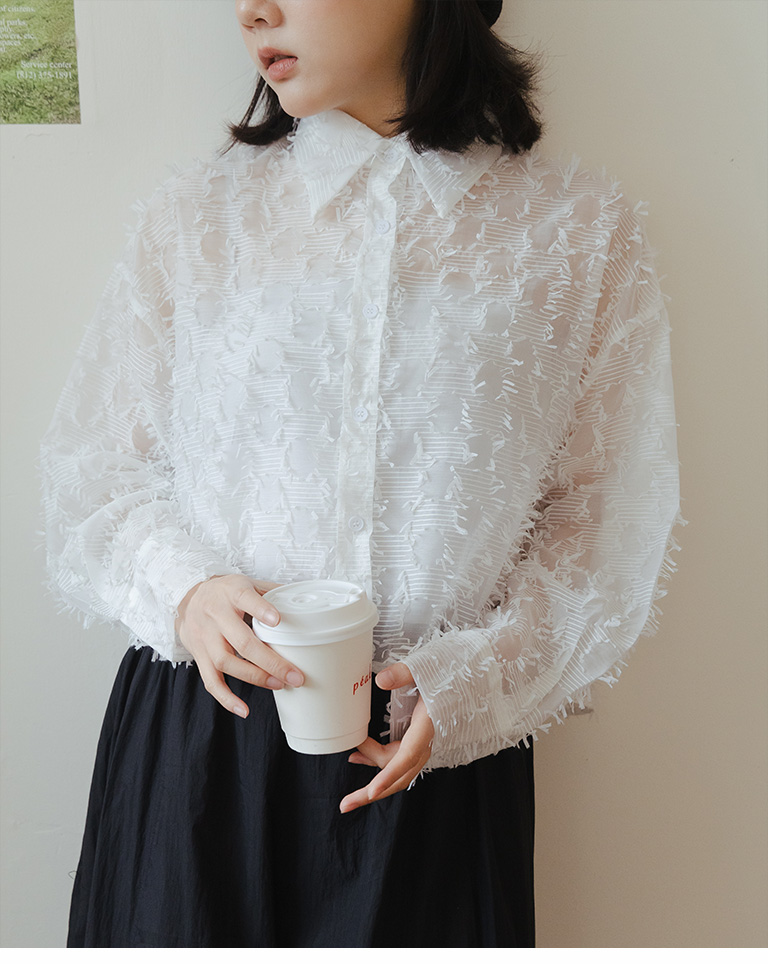 立體羽毛鬚設計透膚短版襯衫 三色售