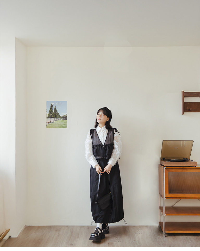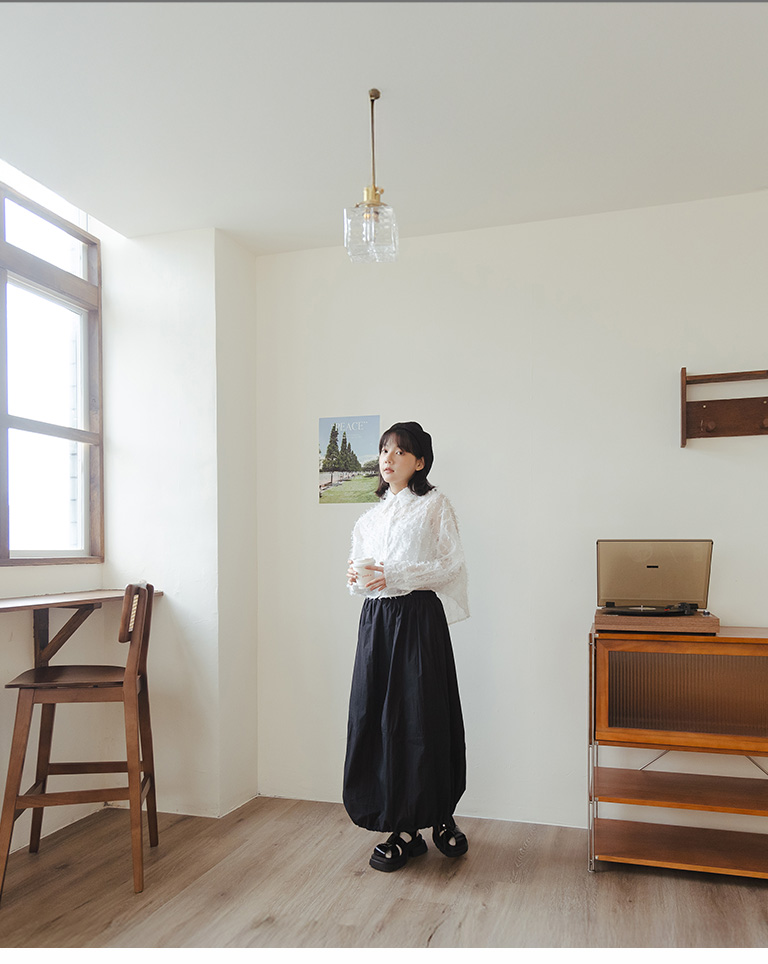 S~L身形實測!分尺寸皺皺木耳邊透膚高領長袖上衣