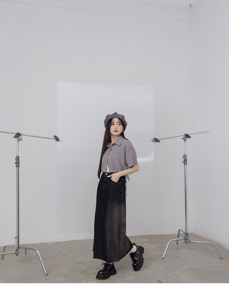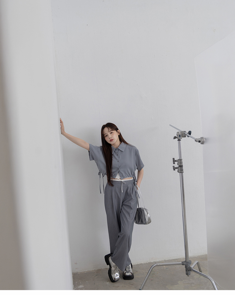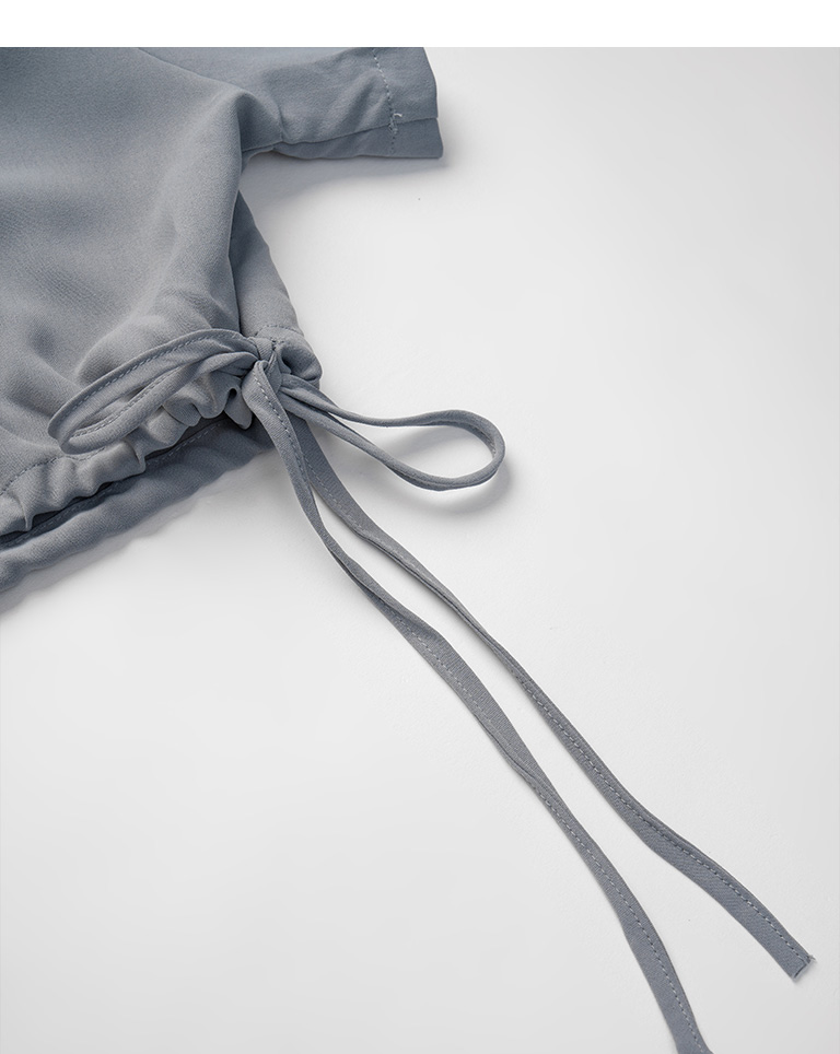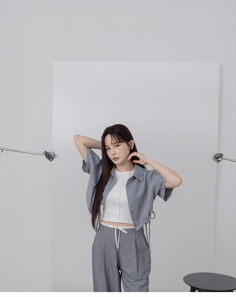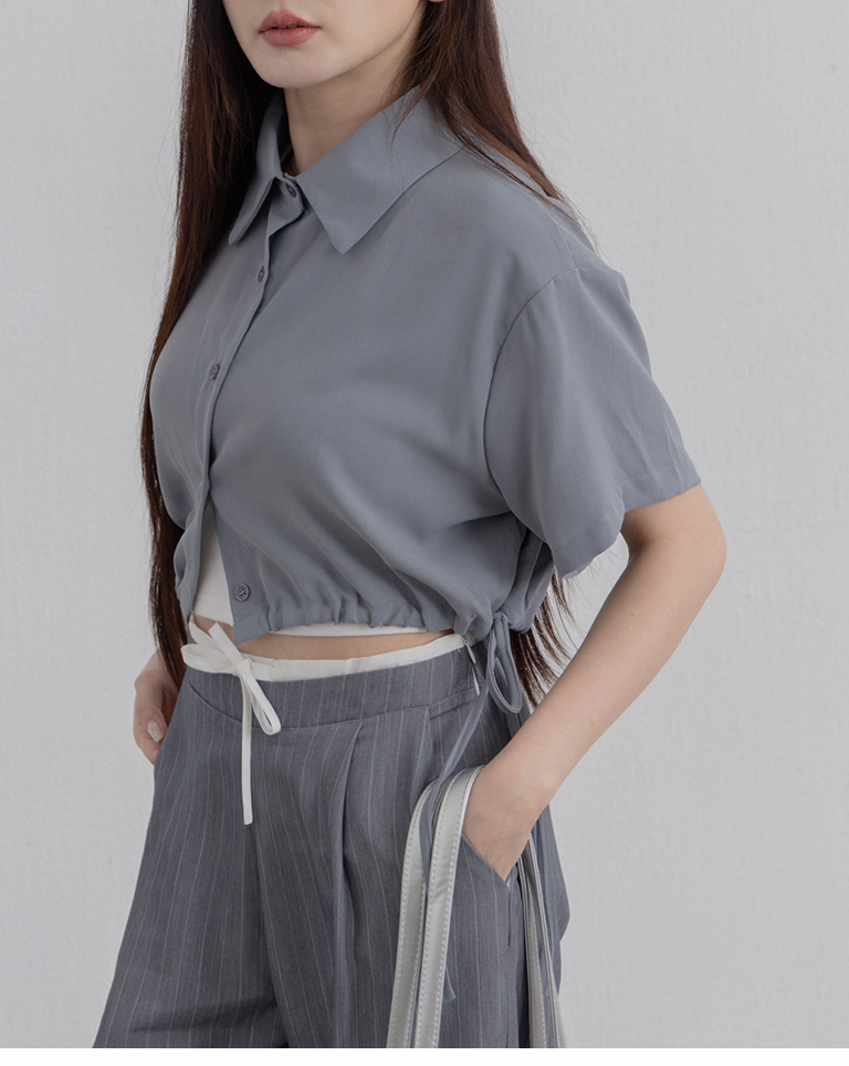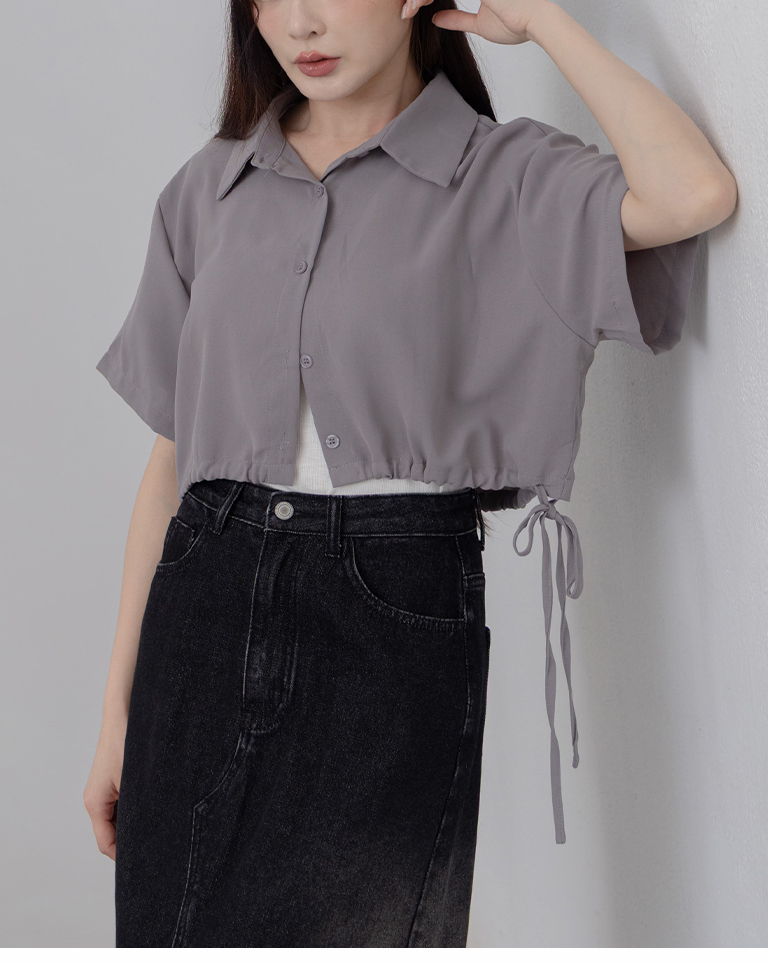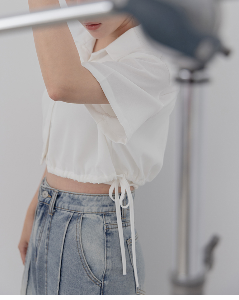 側抽繩綁帶設計短版短袖襯衫