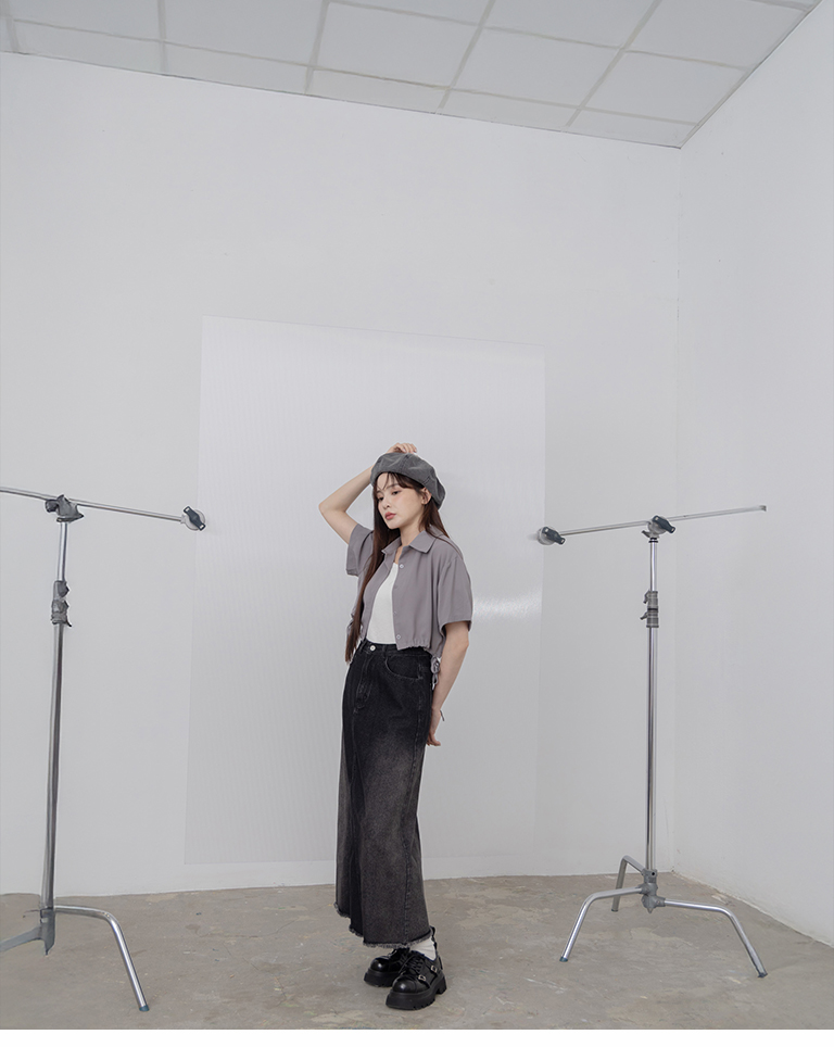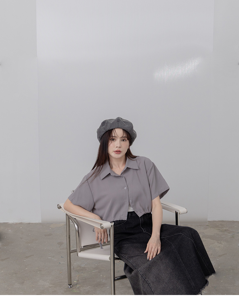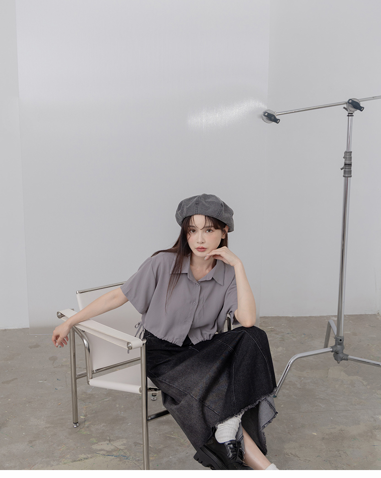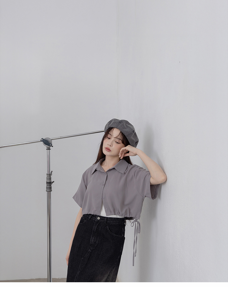 側抽繩綁帶設計短版短袖襯衫 三色售
