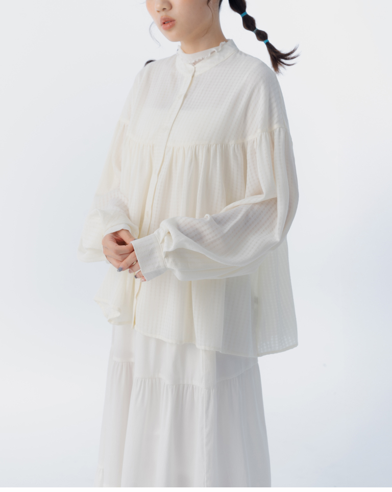 S~L身形實測!分尺寸皺皺木耳邊透膚高領長袖上衣