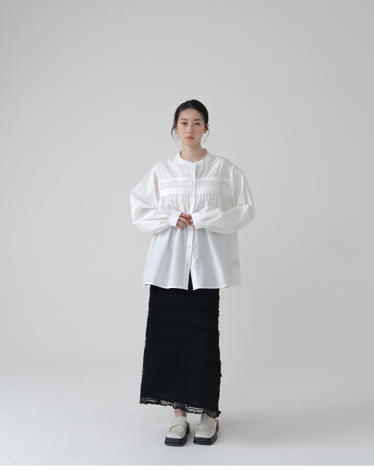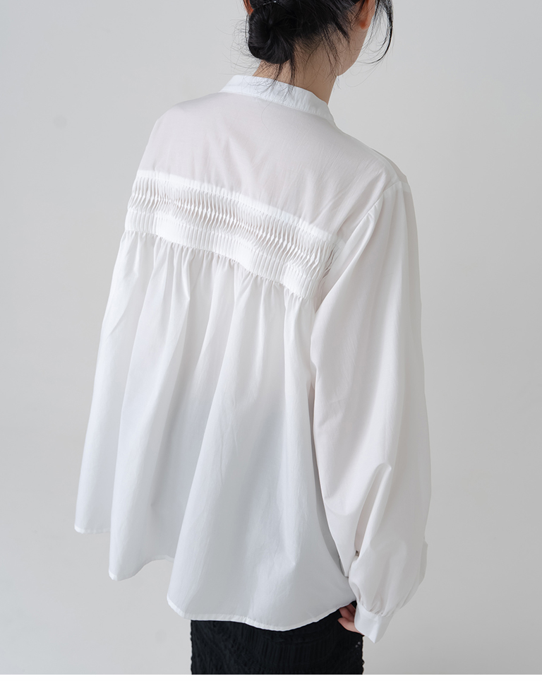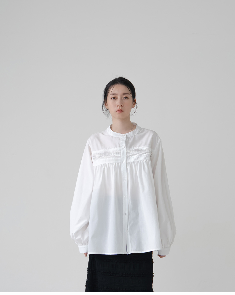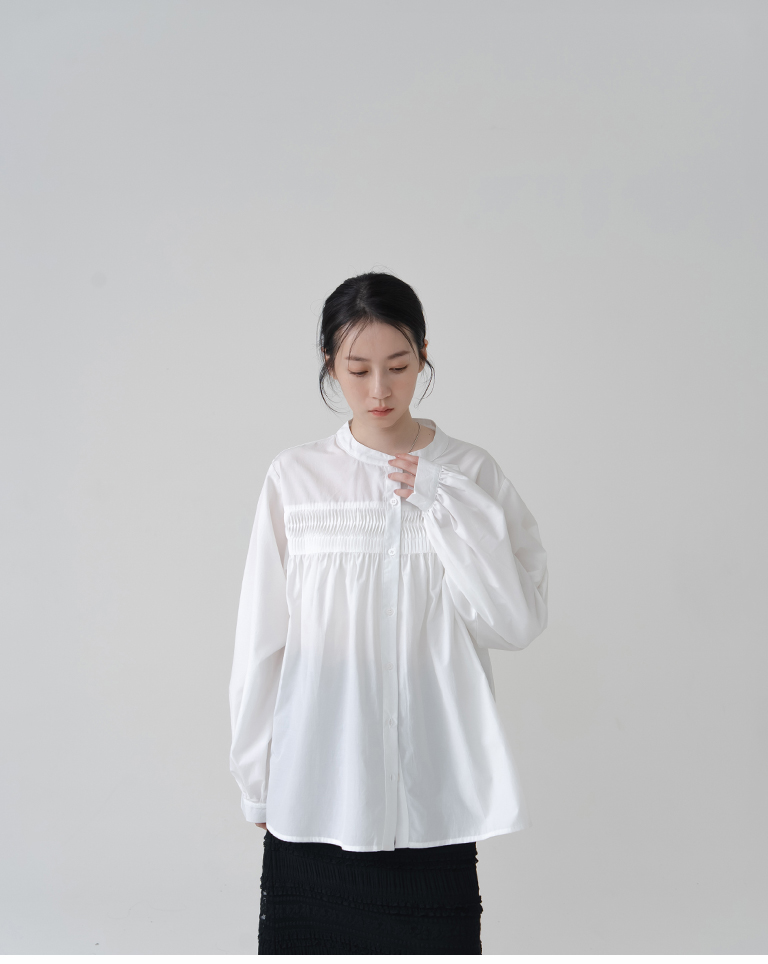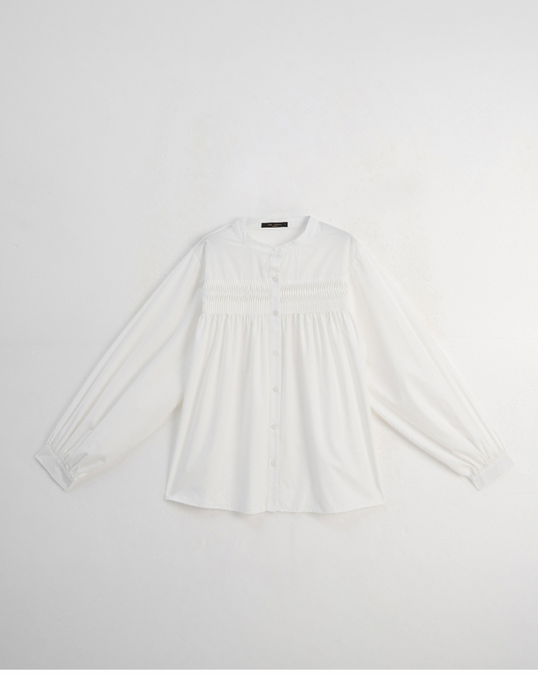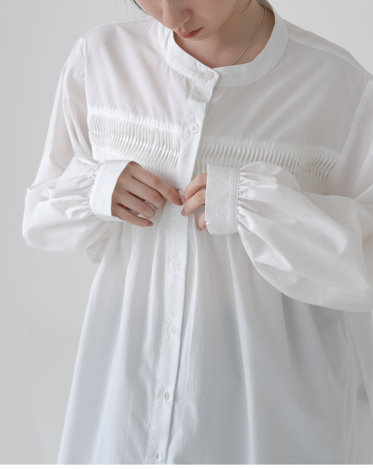 立體壓摺設計中山領長袖襯衫-白
