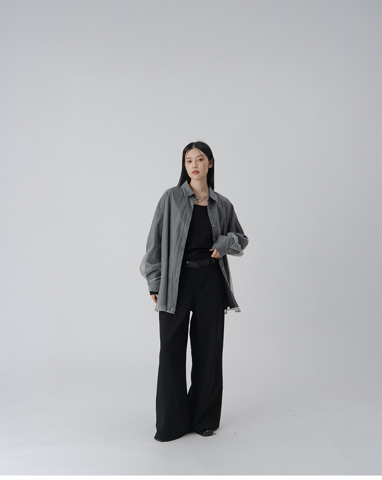雙層透紗條紋設計襯衫-黑