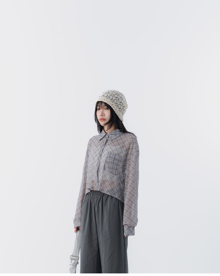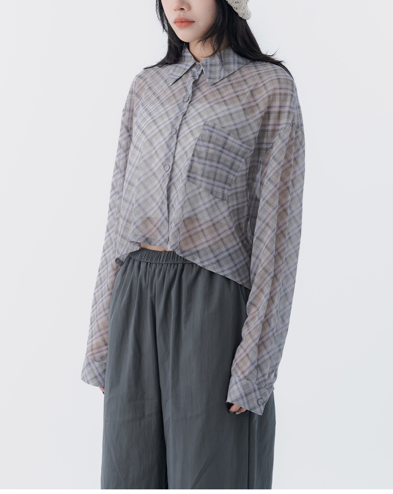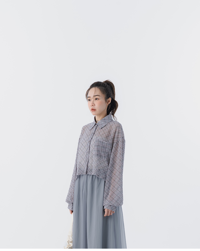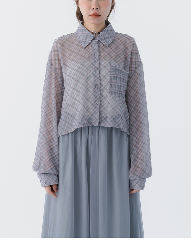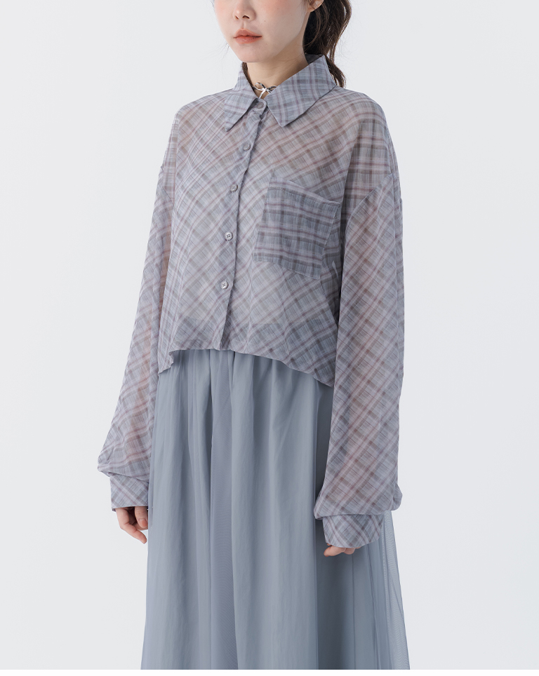 格紋透膚長袖短版襯衫