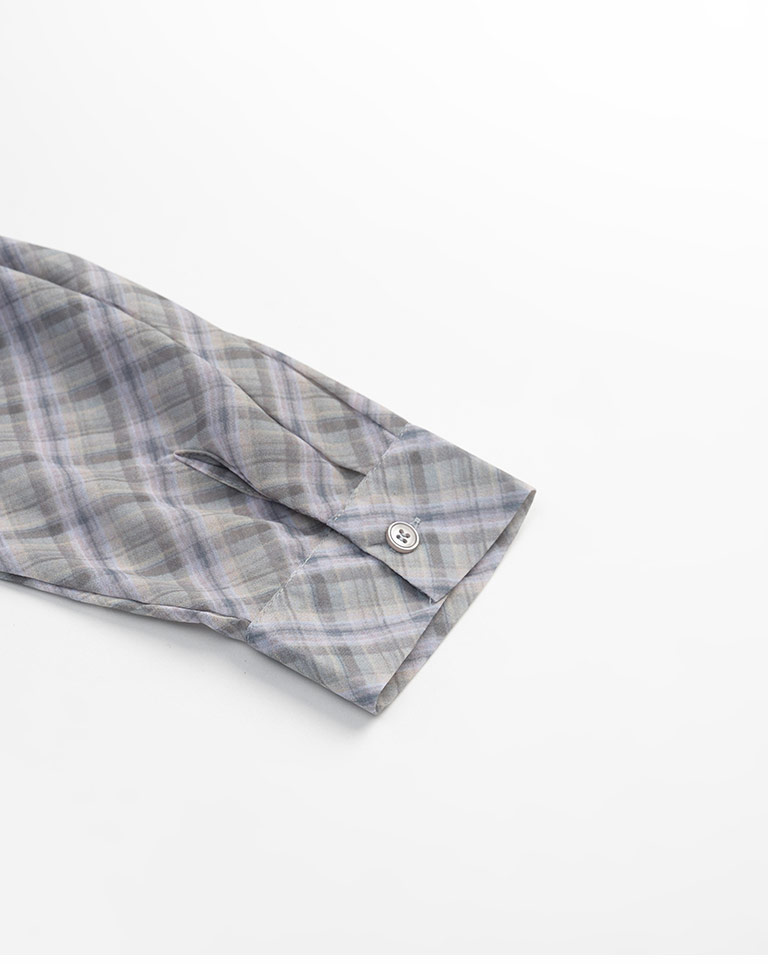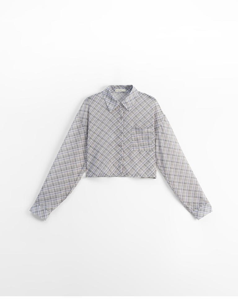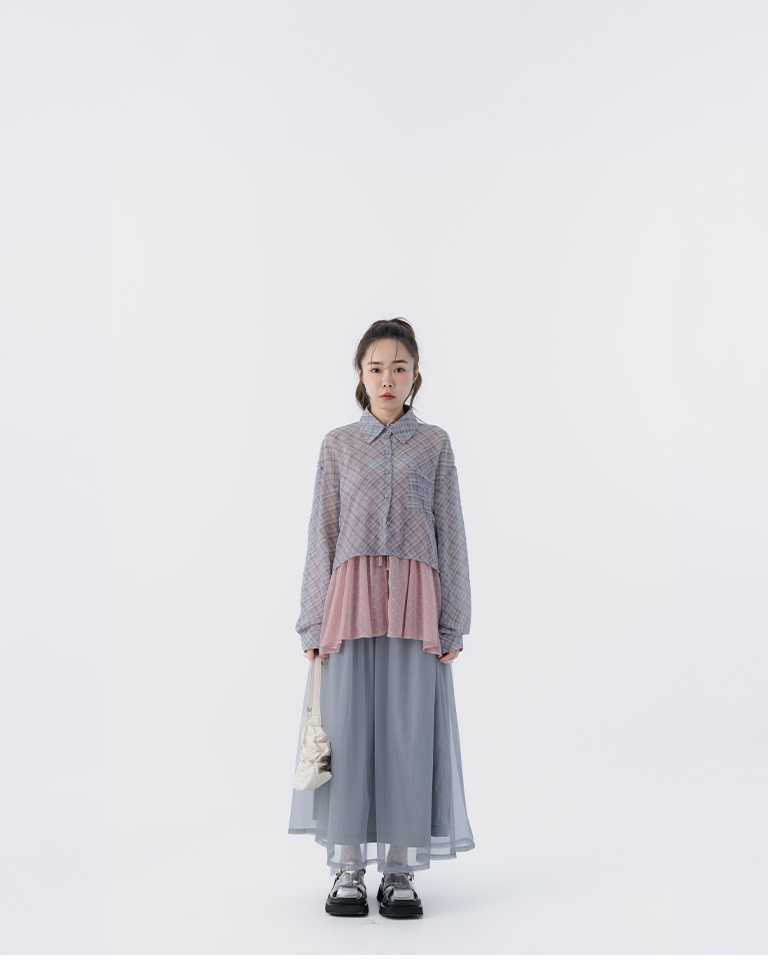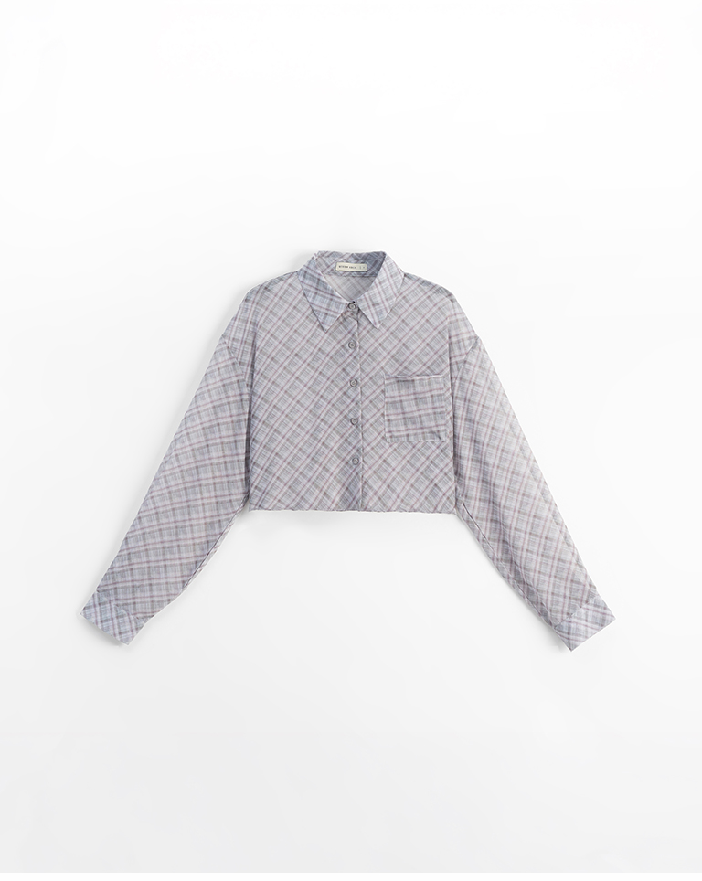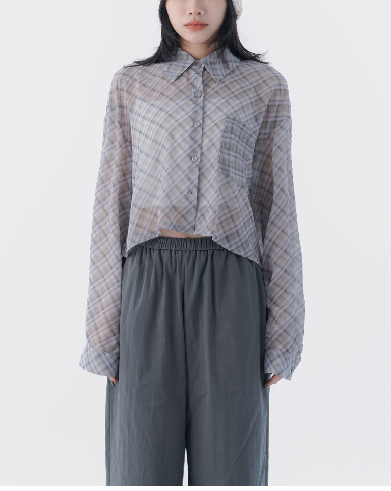 格紋透膚長袖短版襯衫