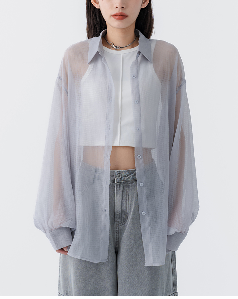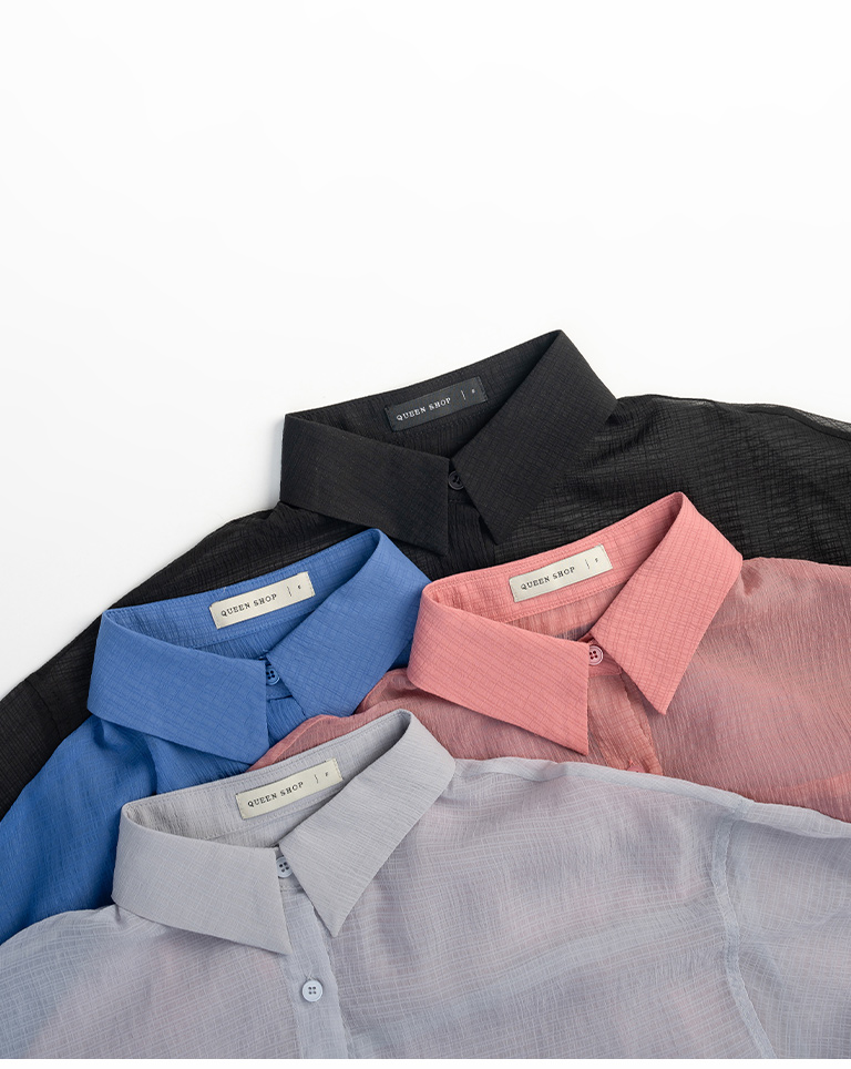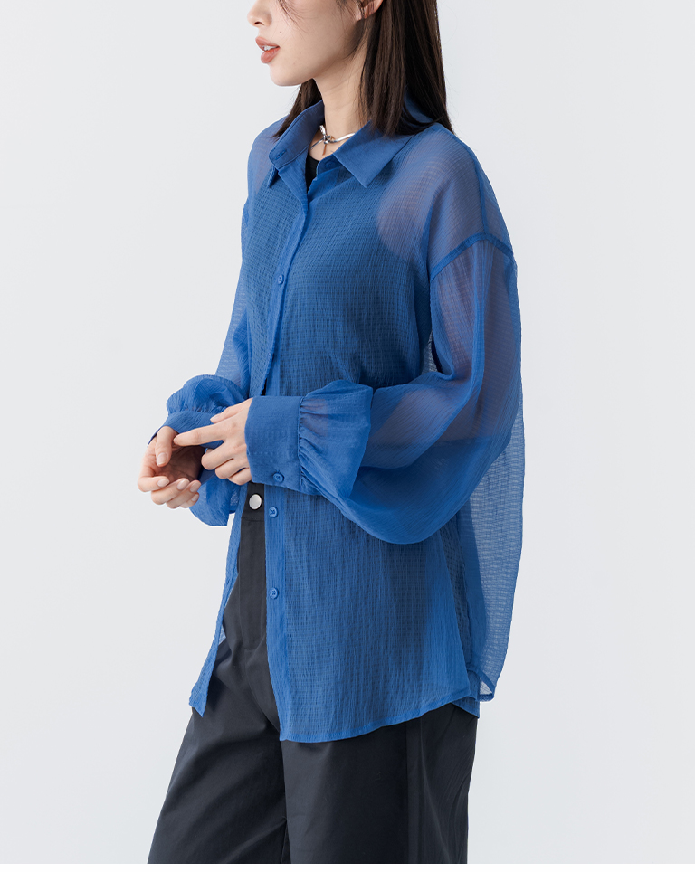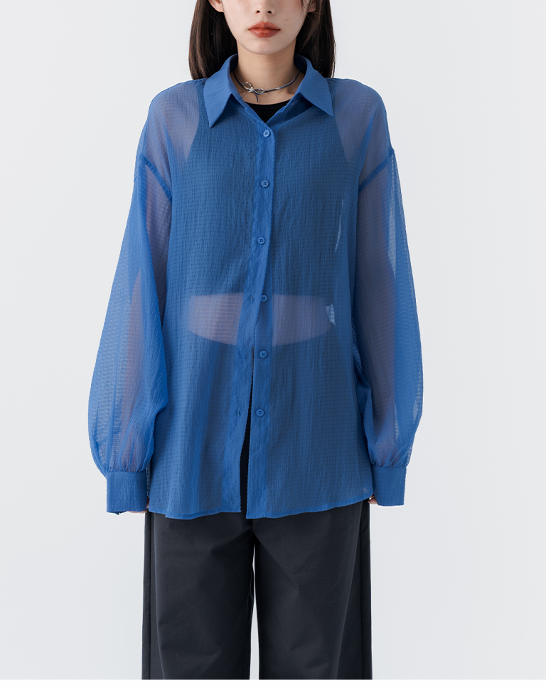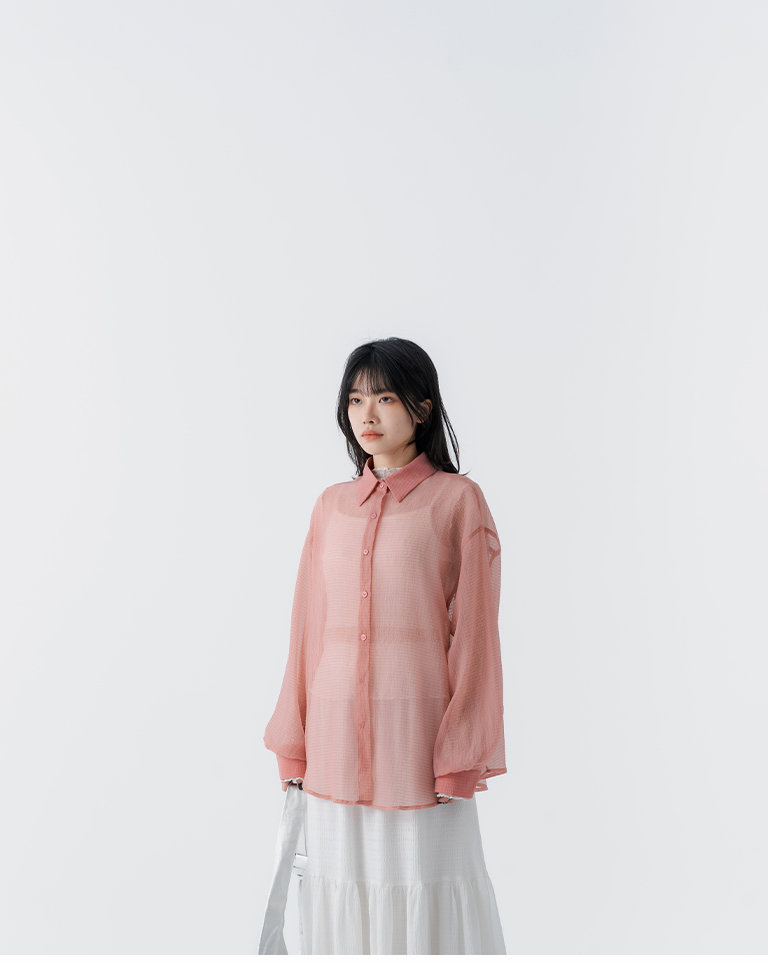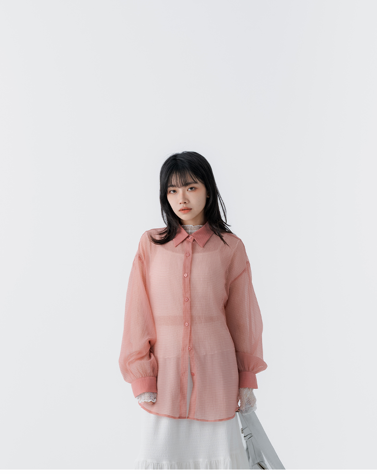 細褶格紋紋理透膚長袖襯衫 四色售
