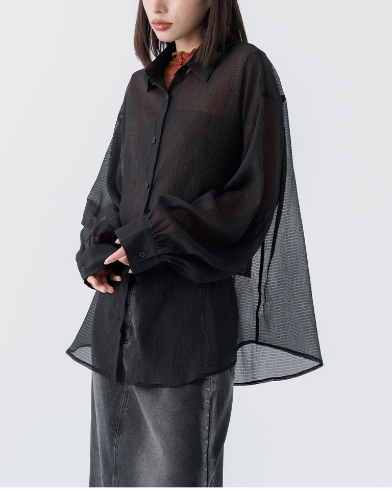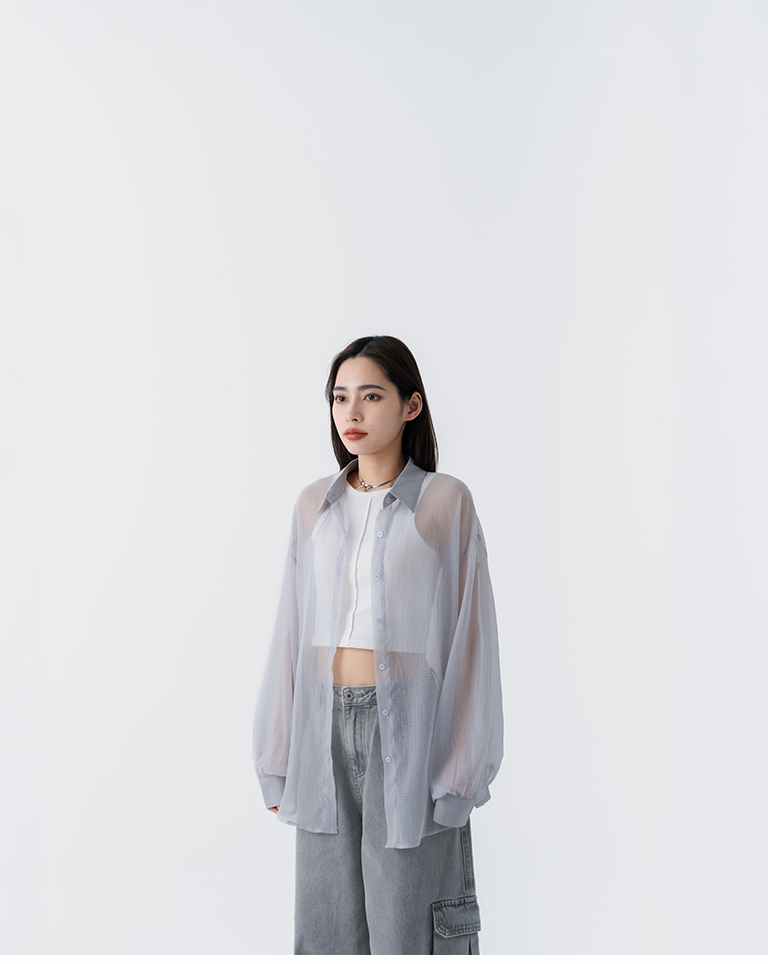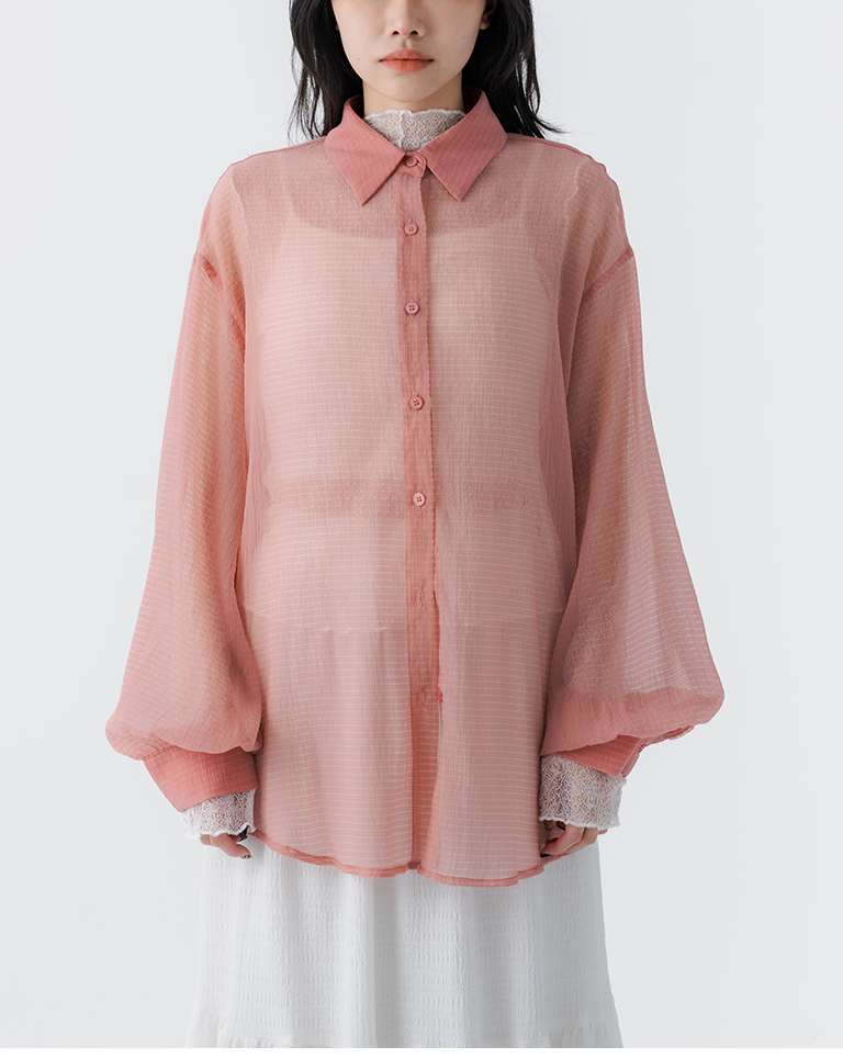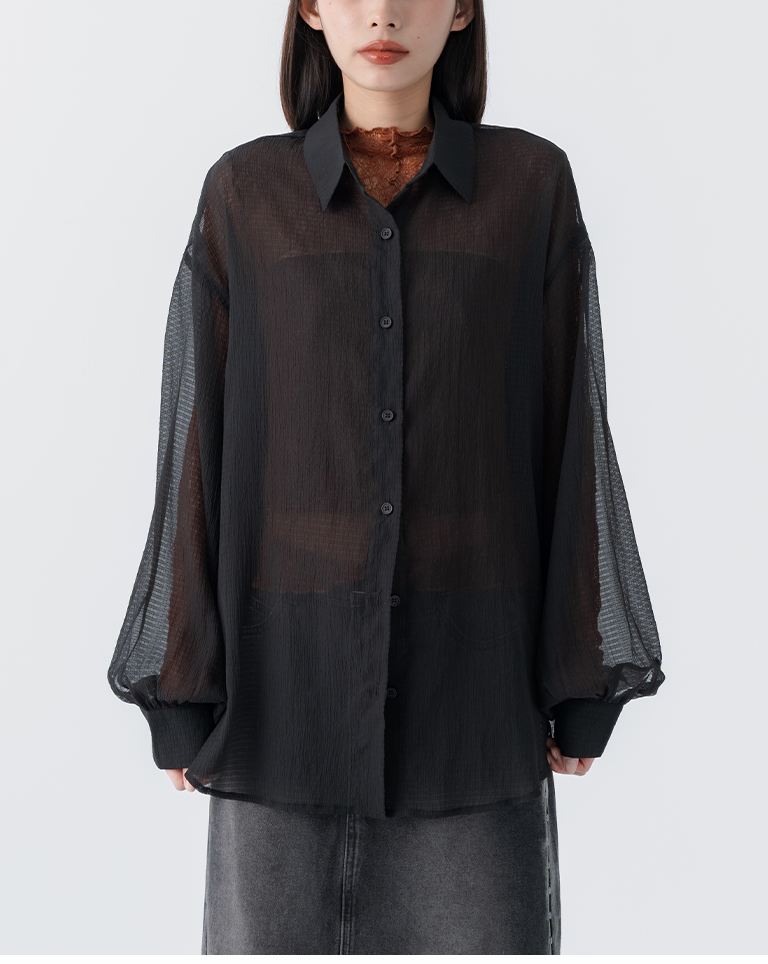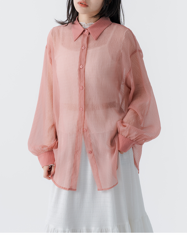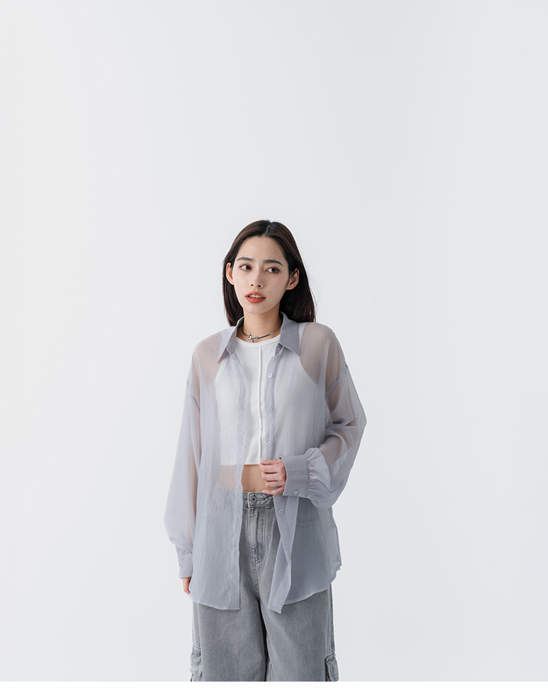 細褶格紋紋理透膚長袖襯衫 四色售