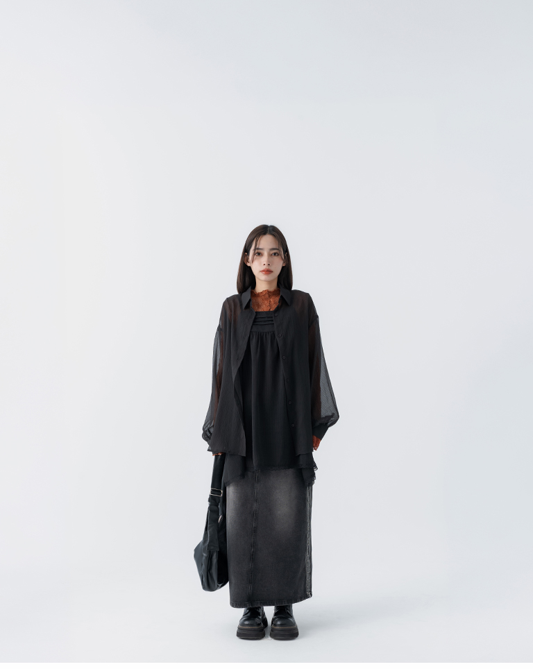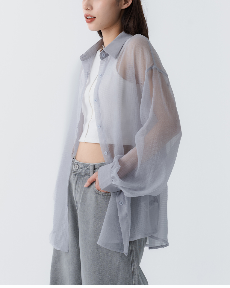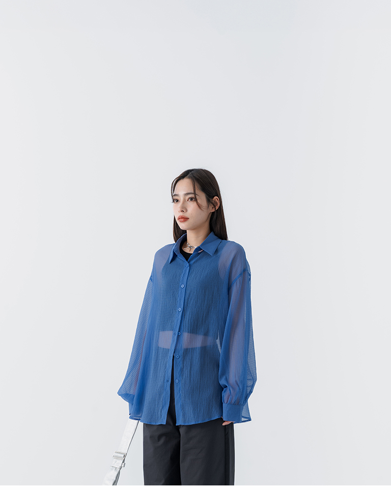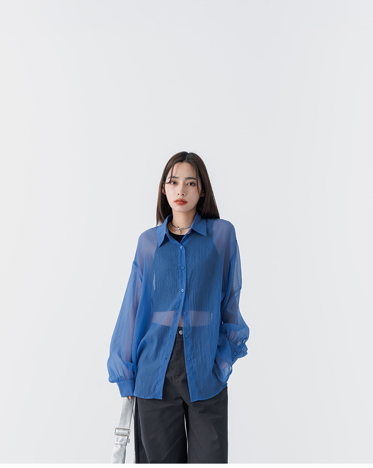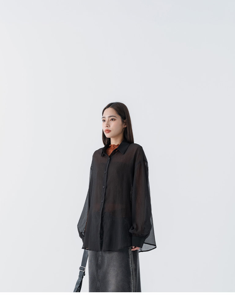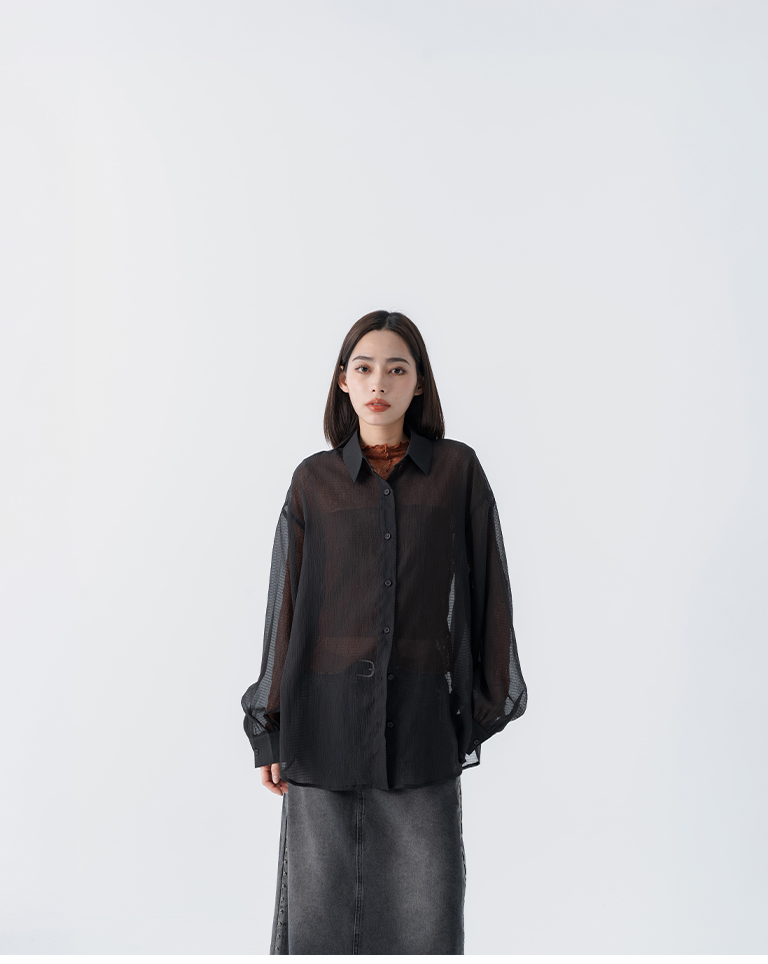 細褶格紋紋理透膚長袖襯衫 四色售