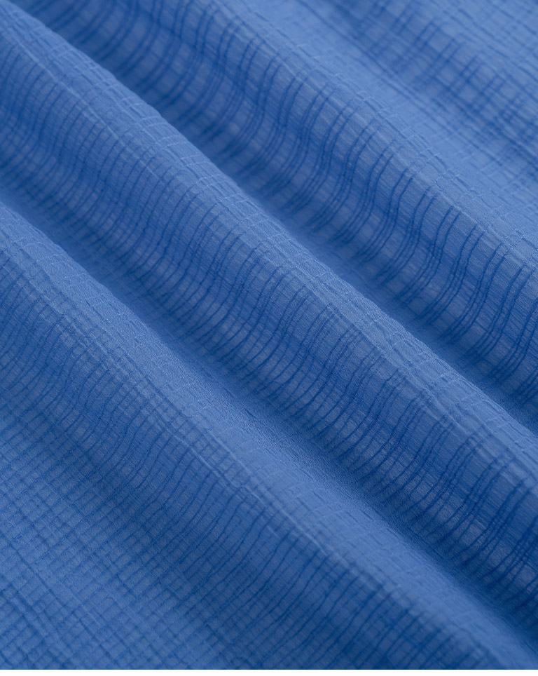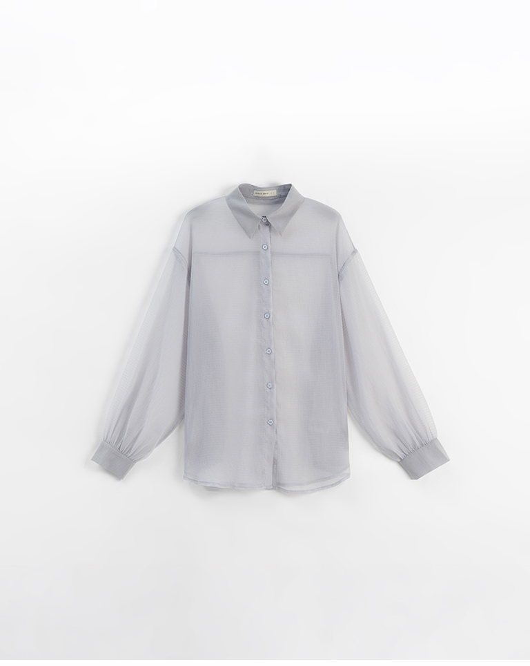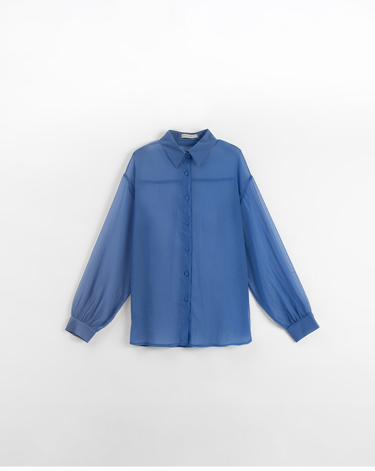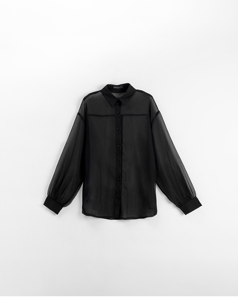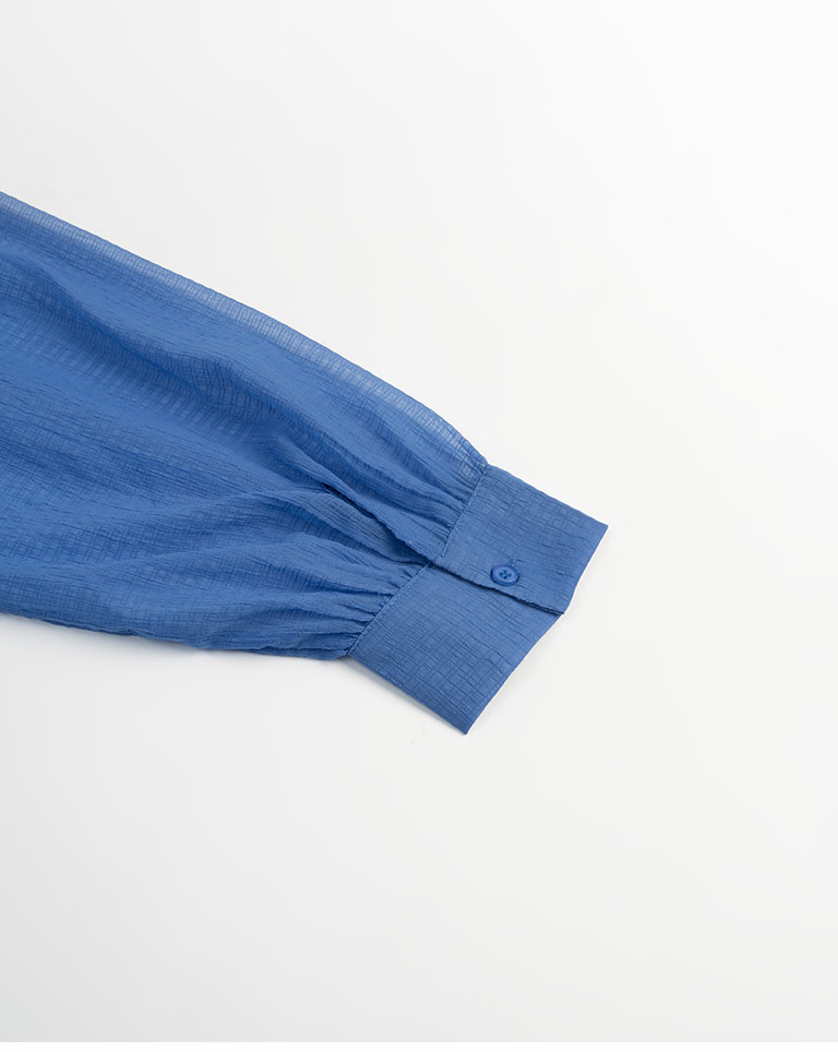 細褶格紋紋理透膚長袖襯衫