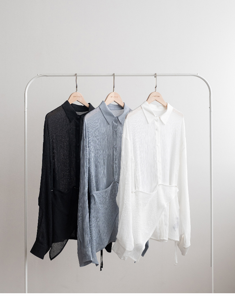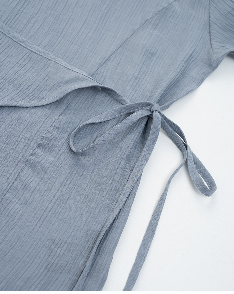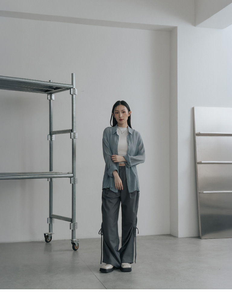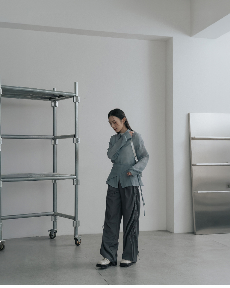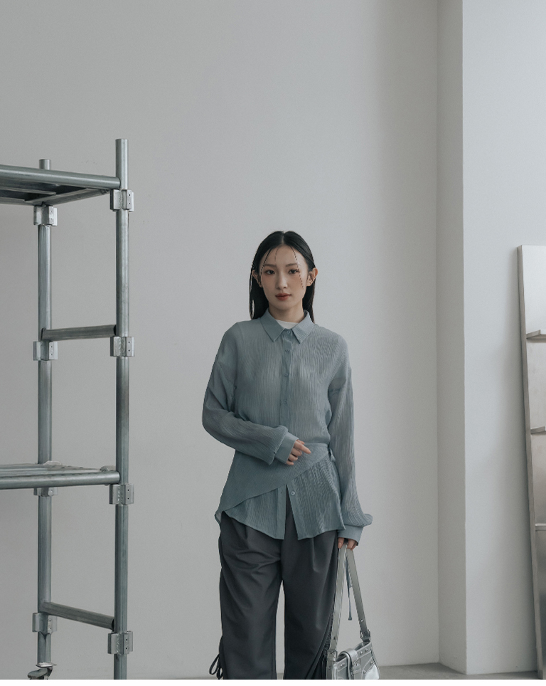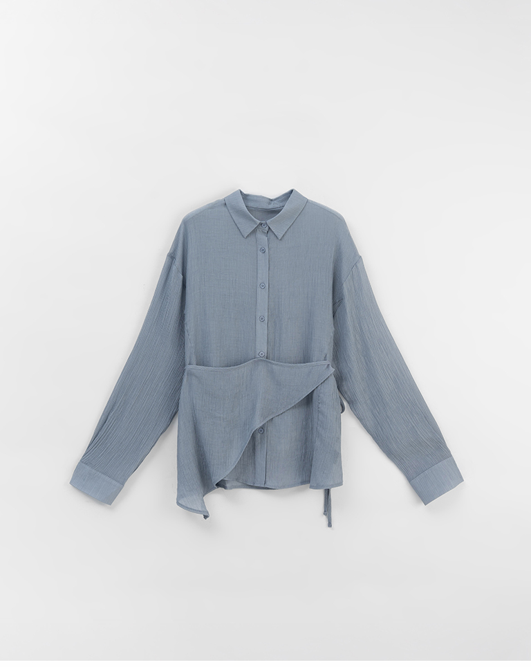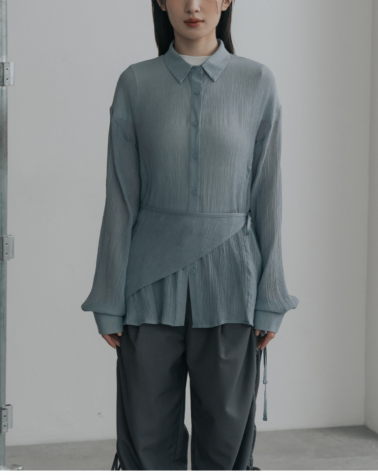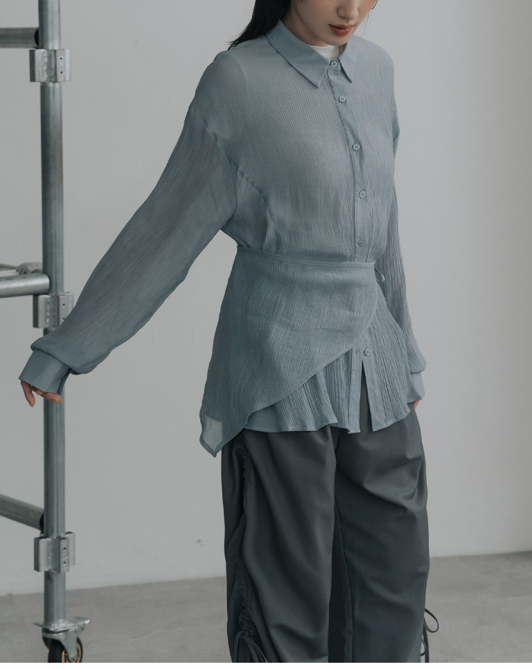質感細褶紋理透膚附裙簾襯衫-灰藍
