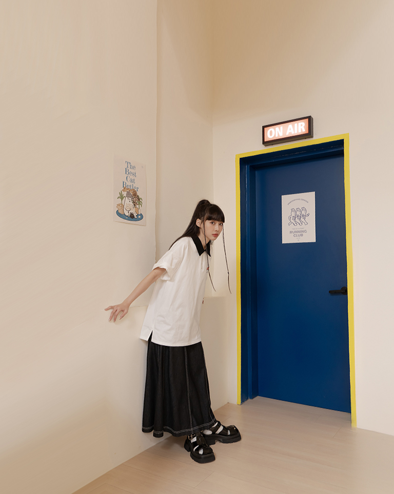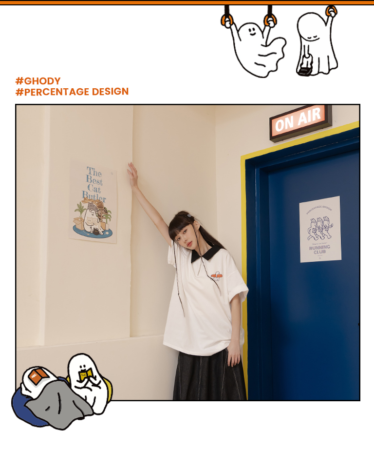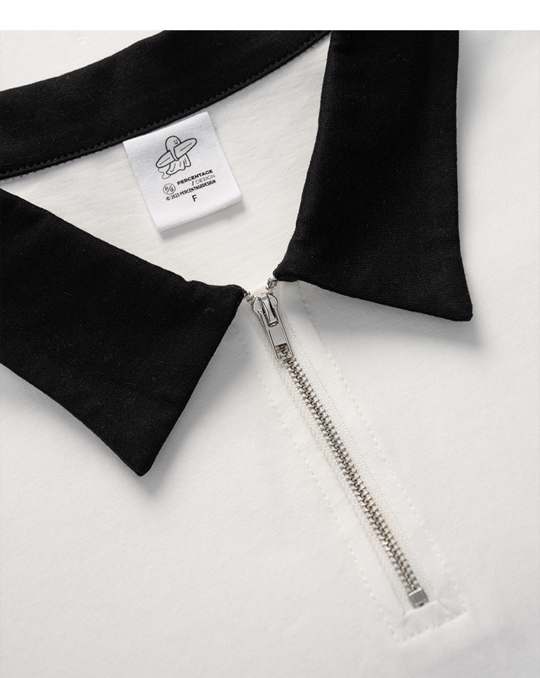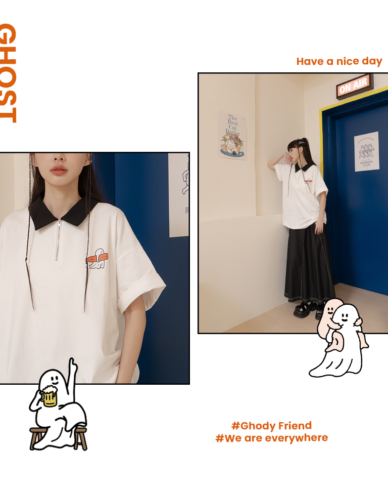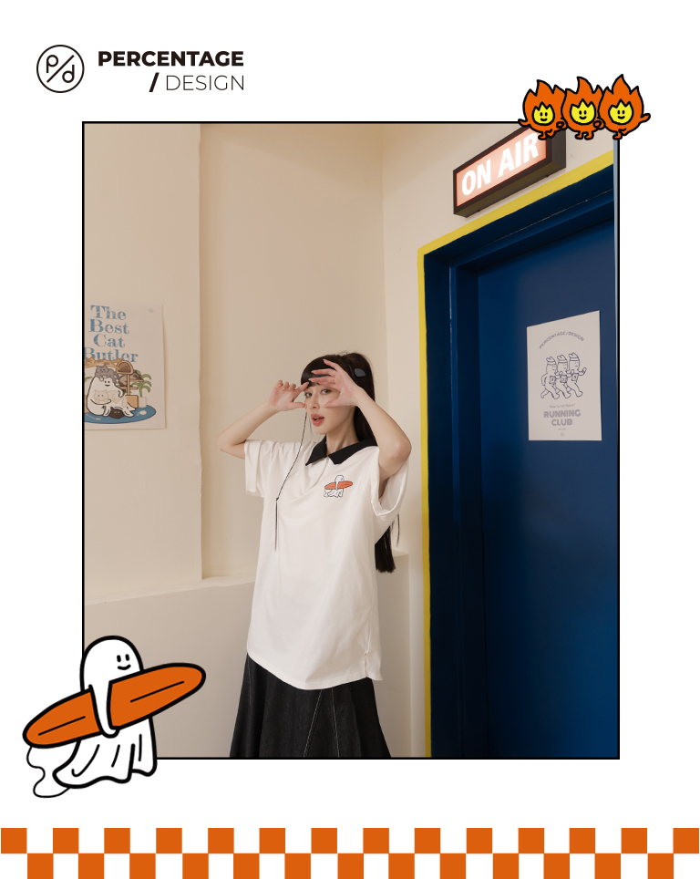 P/D幽靈 撞色領片半門襟印圖寬版上衣