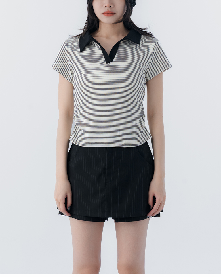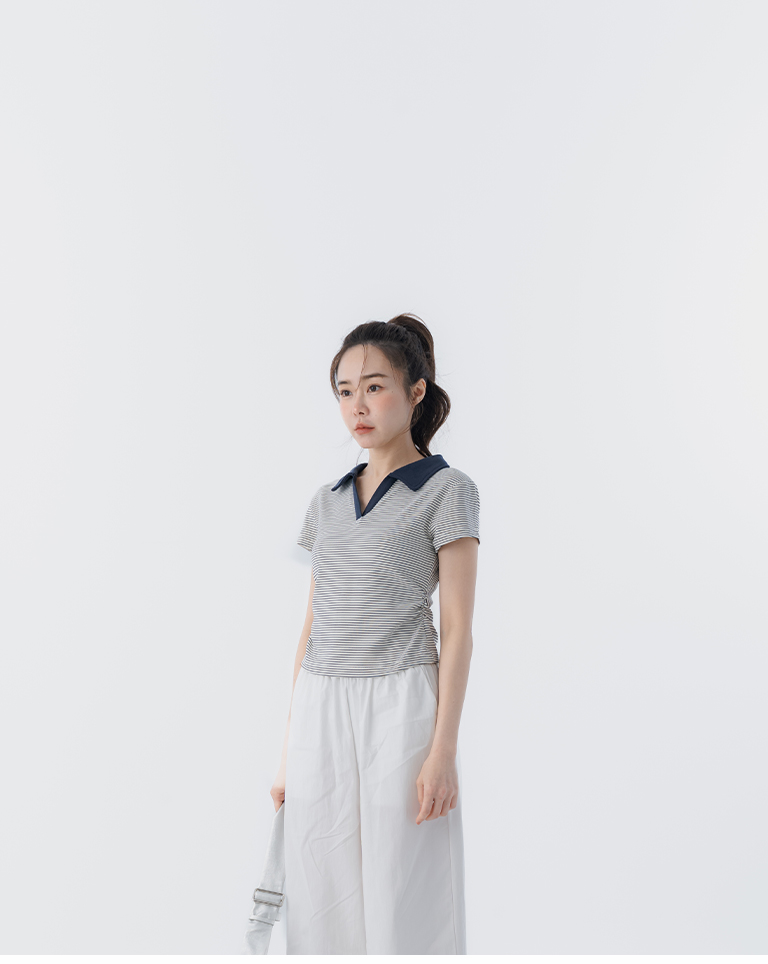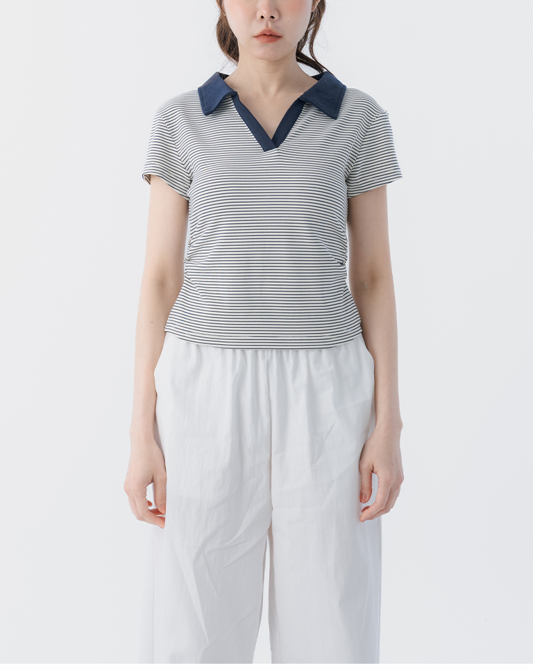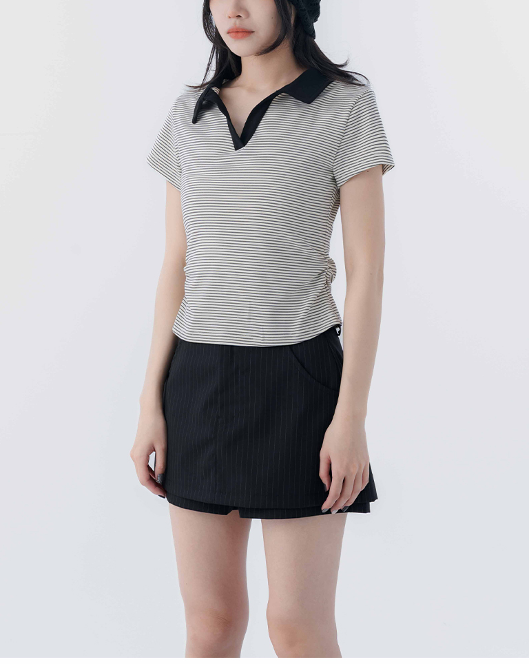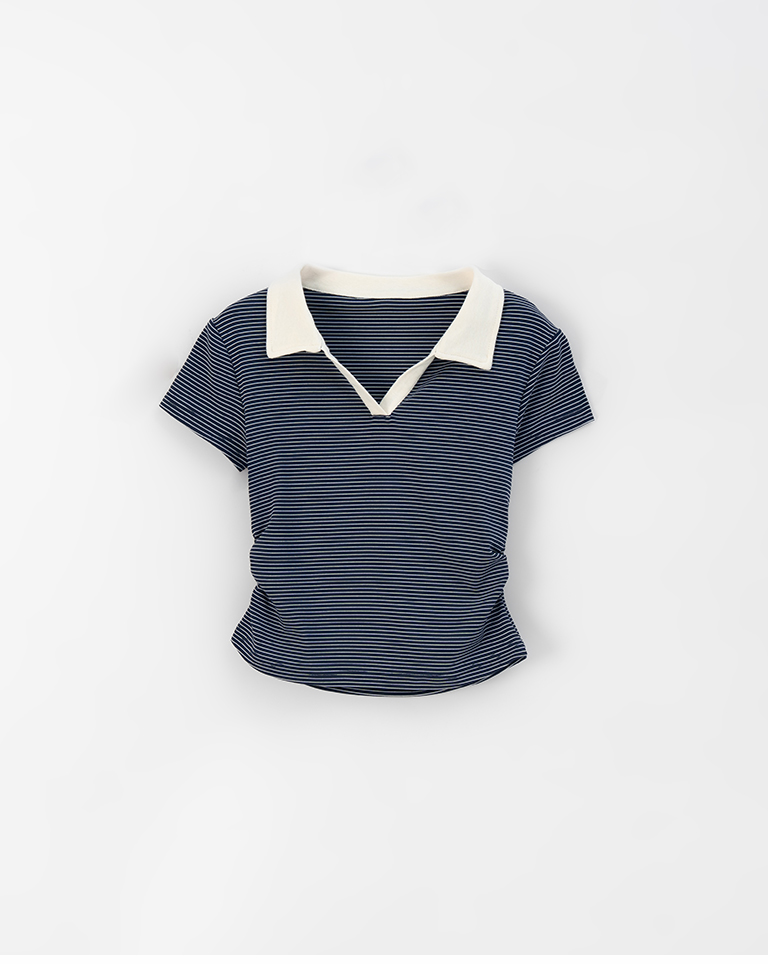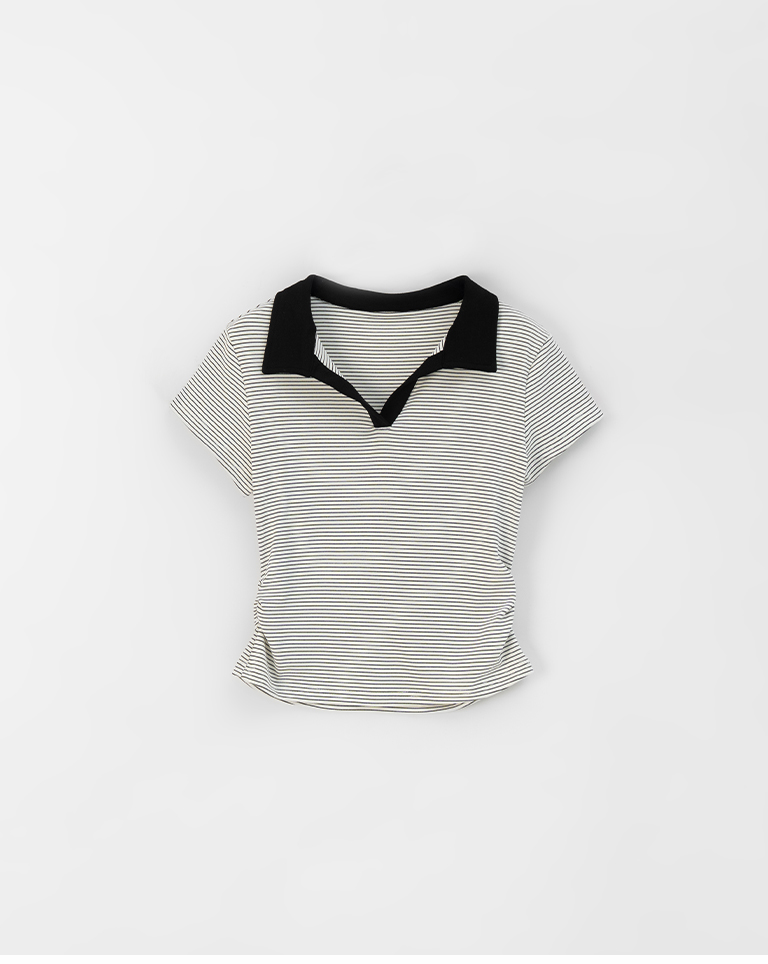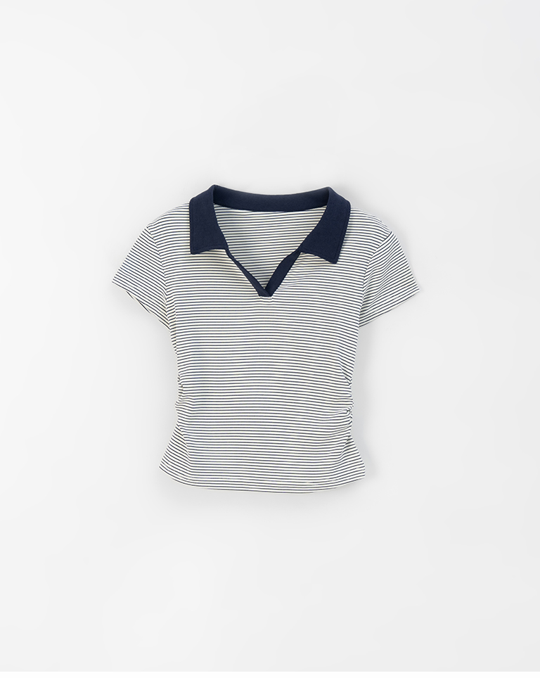 條紋polo領側抓皺短袖上衣