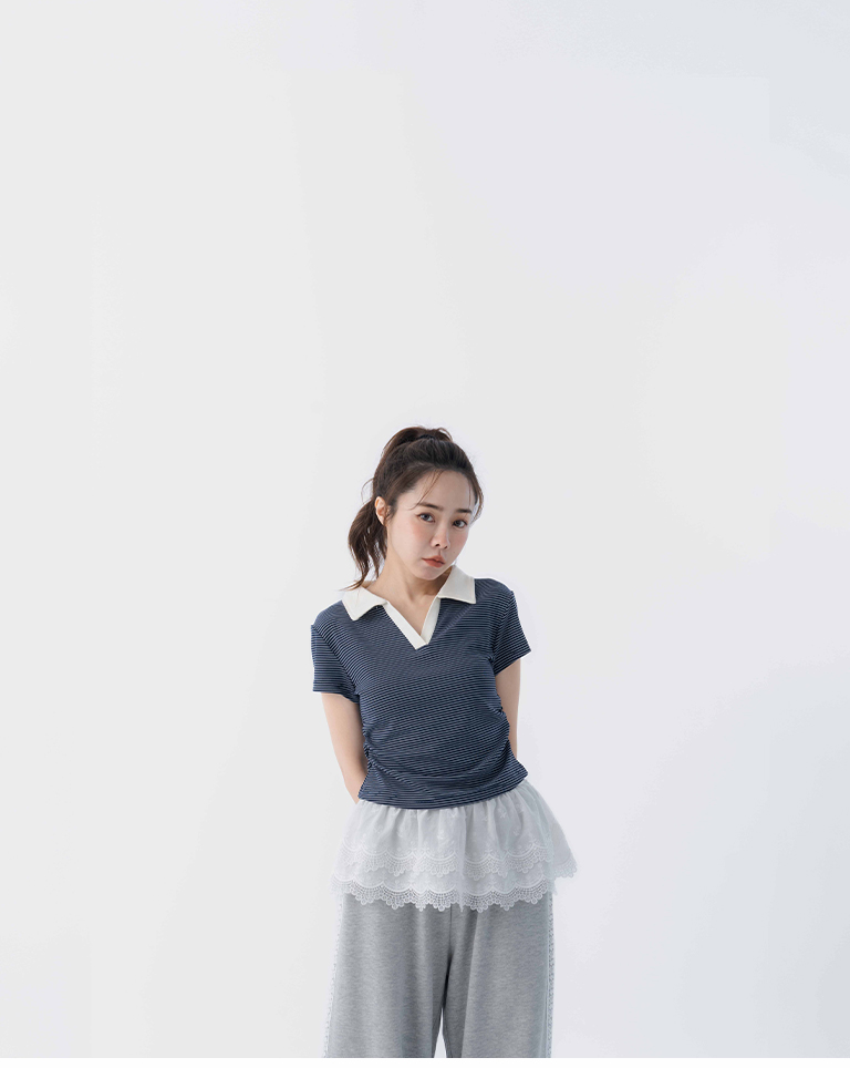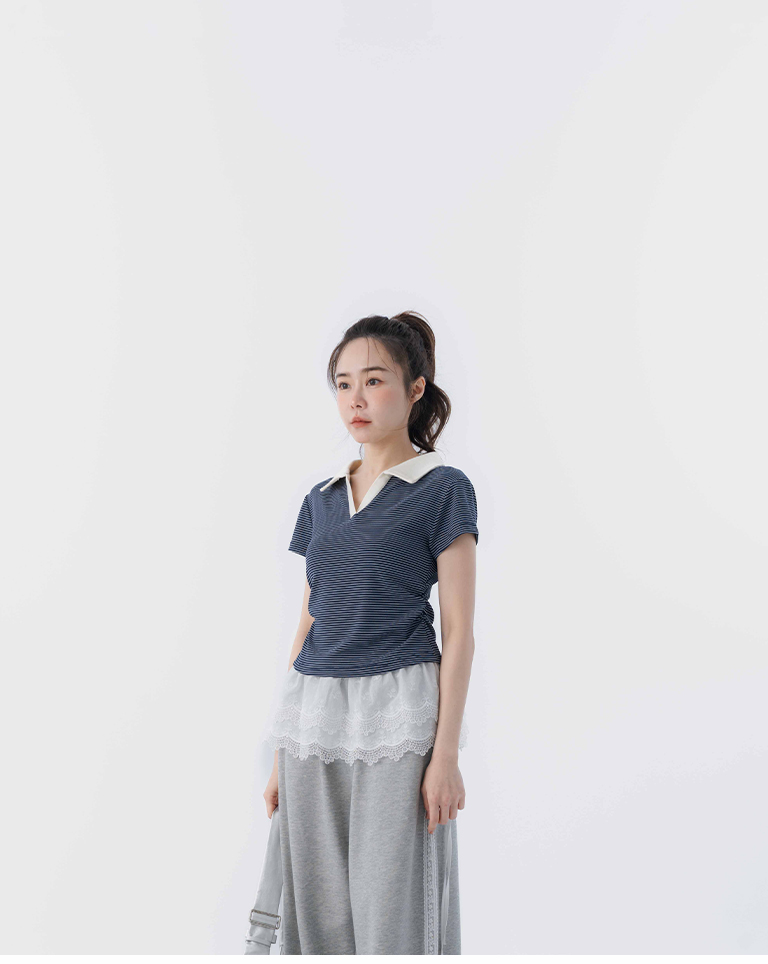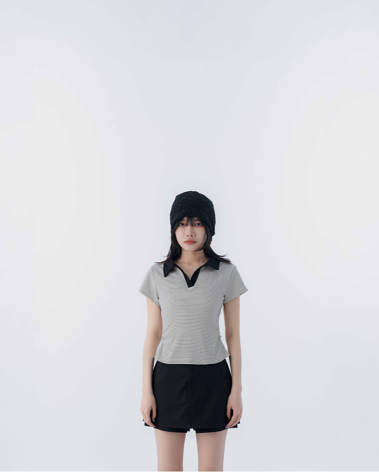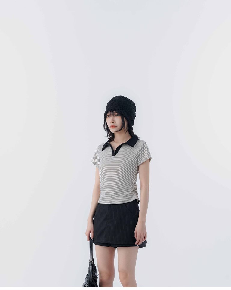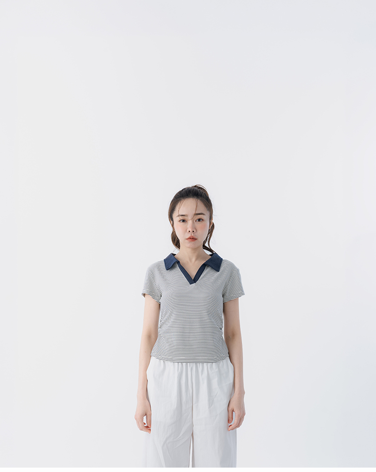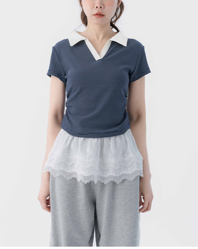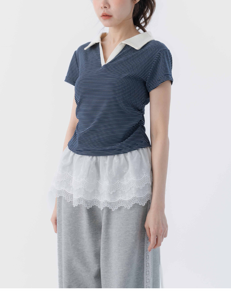 條紋polo領側抓皺短袖上衣