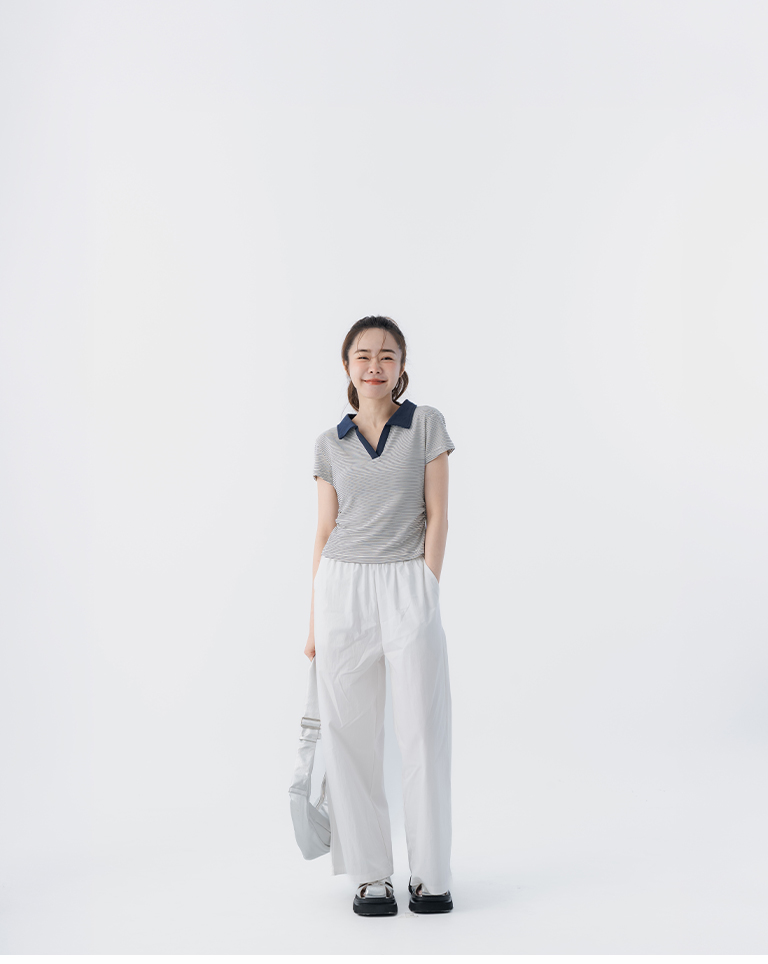 條紋polo領側抓皺短袖上衣 三色售