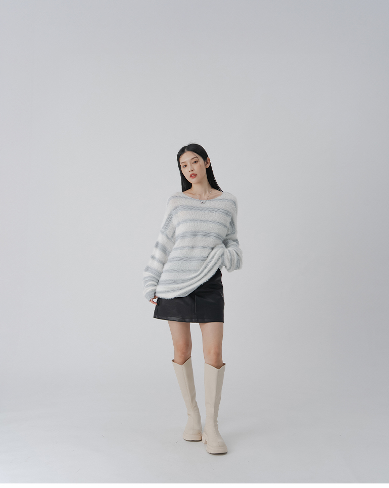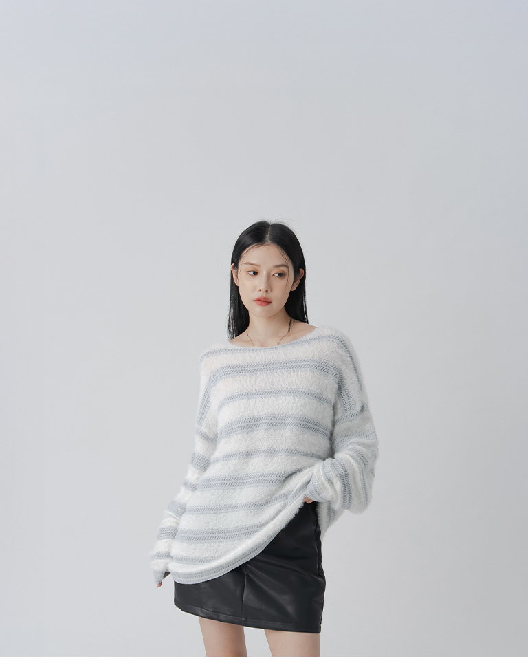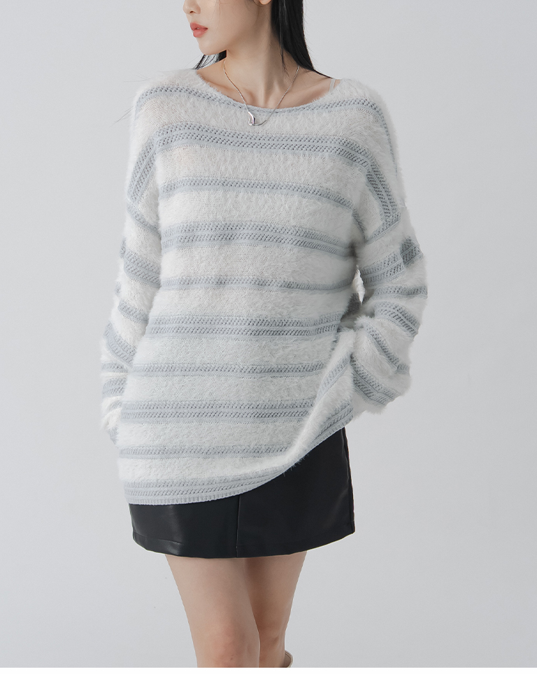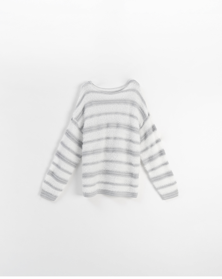 配色條紋毛絨剪接針織毛衣-灰