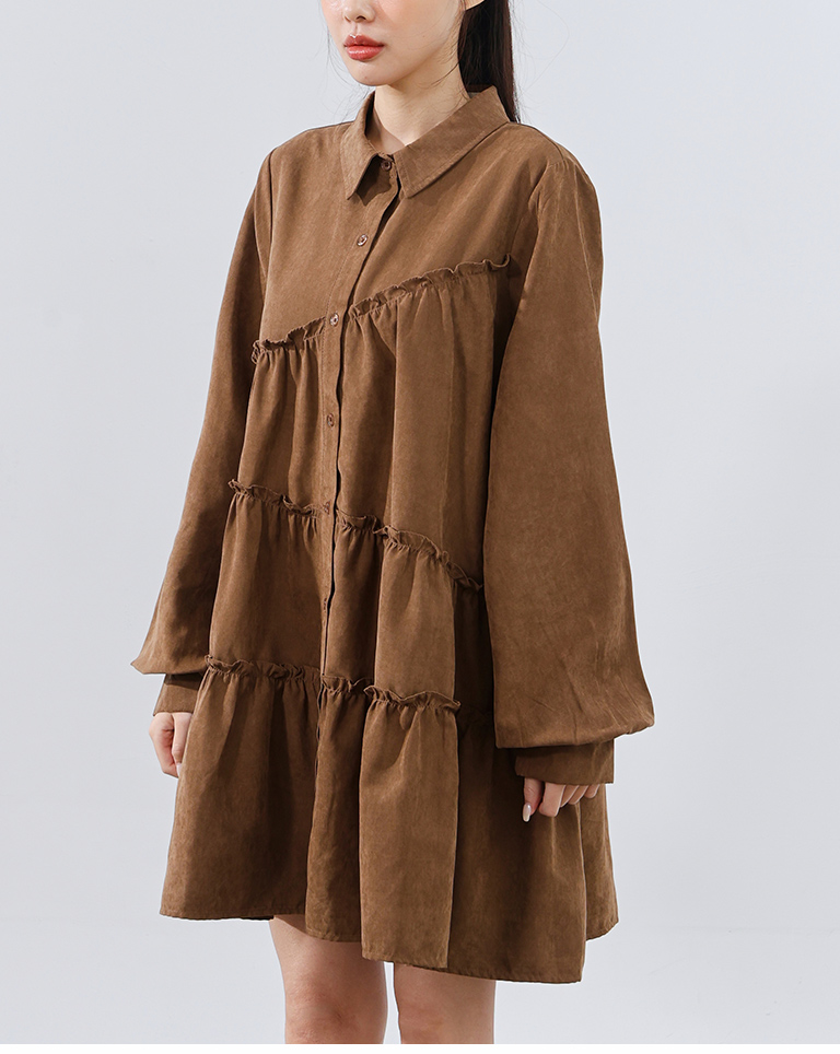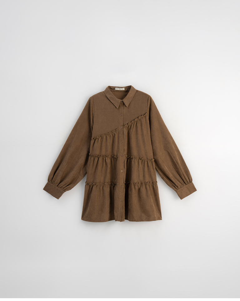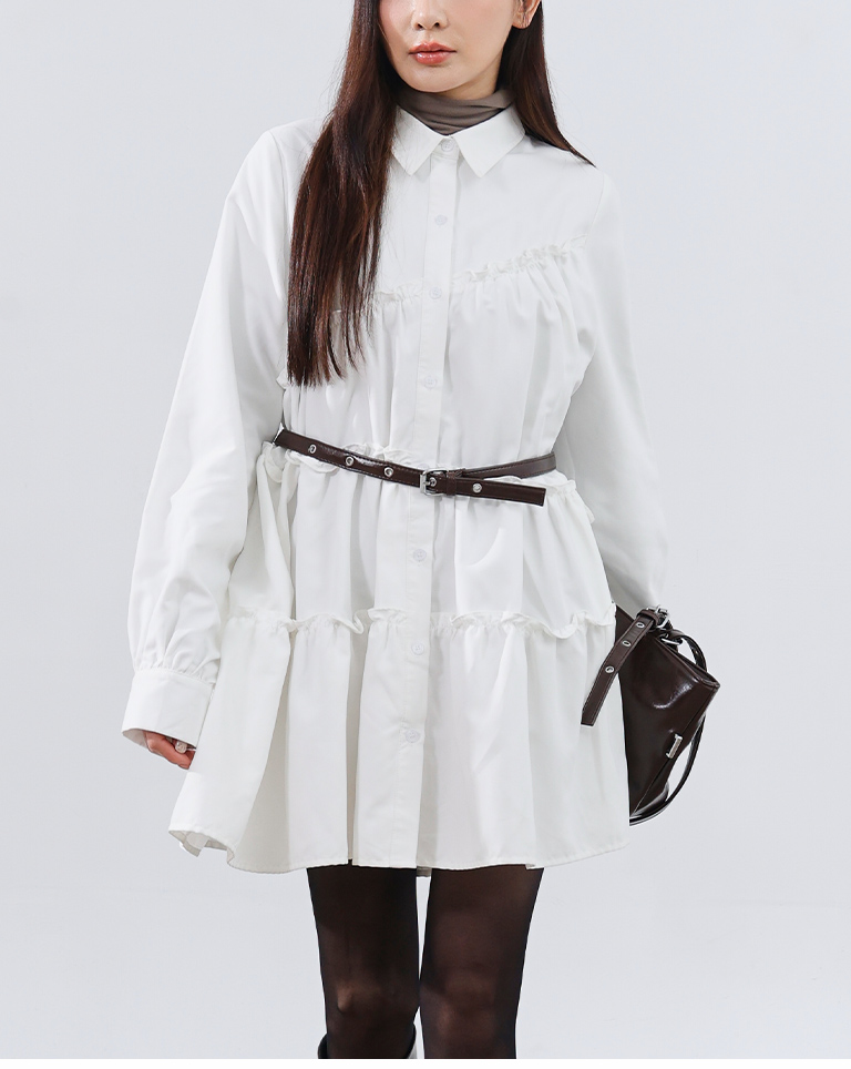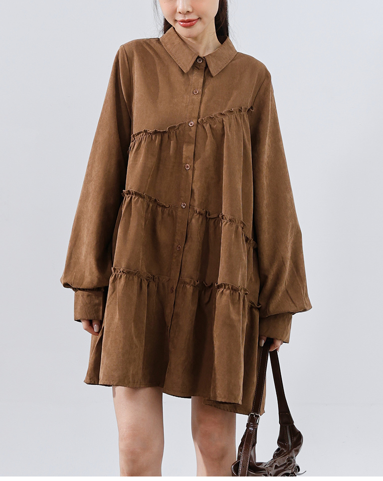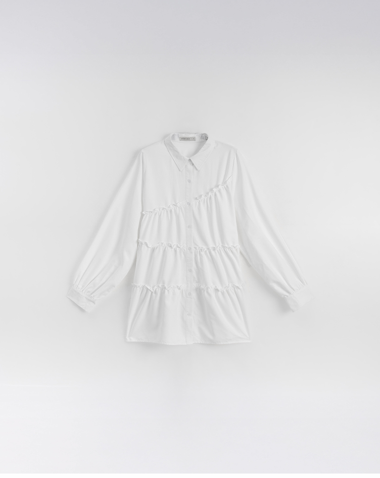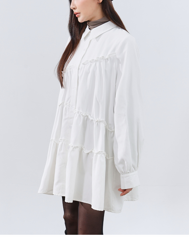 不對稱荷葉剪接襯衫短洋裝