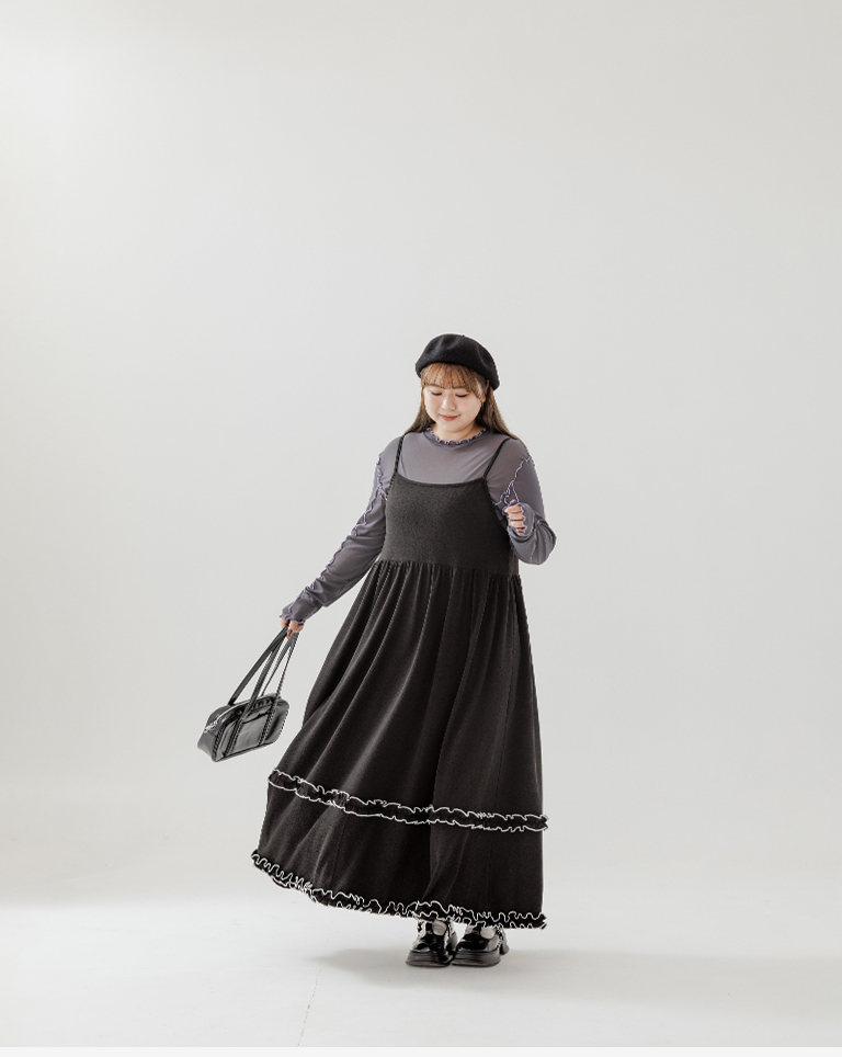 棉花糖 撞色木耳邊傘襬細肩長洋裝 M/L/XL