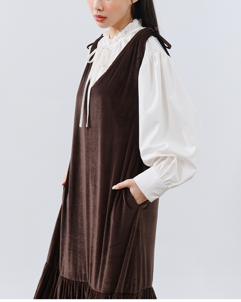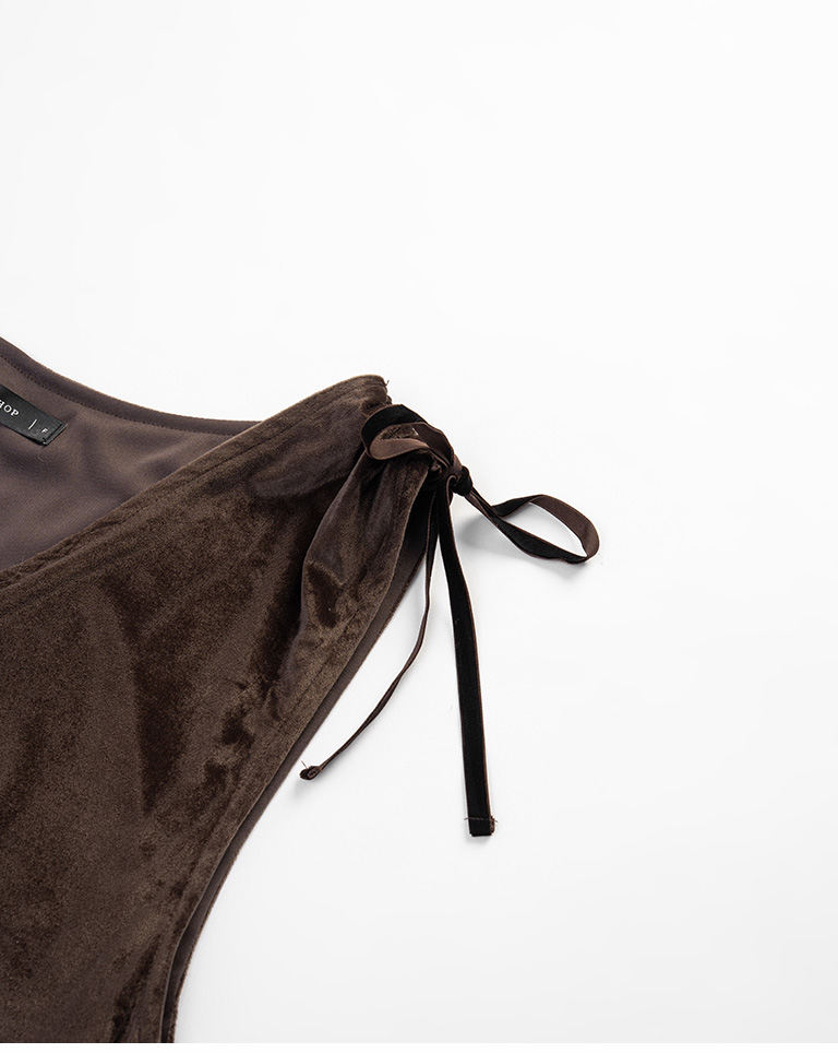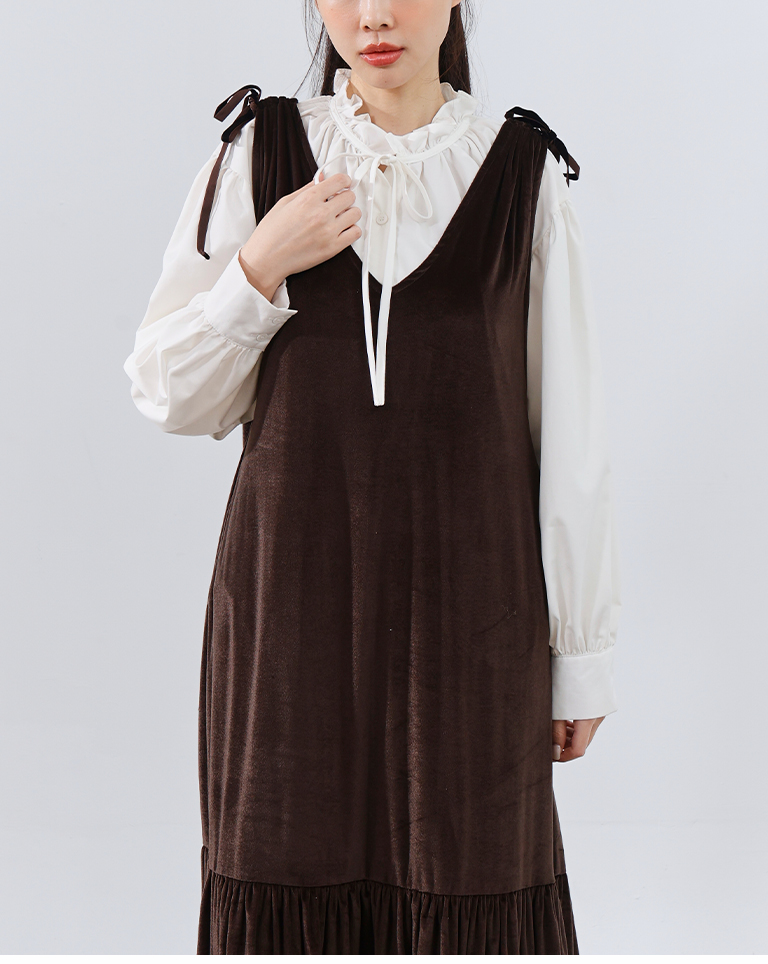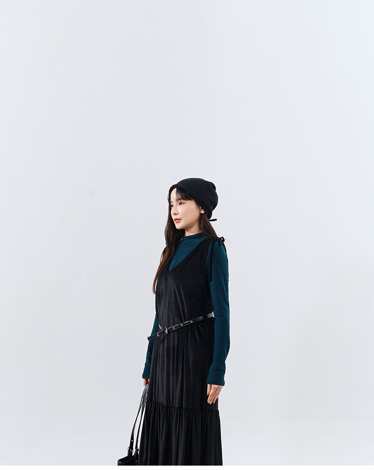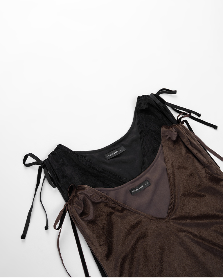 微光澤絨面V領肩綁帶長洋裝 兩色售