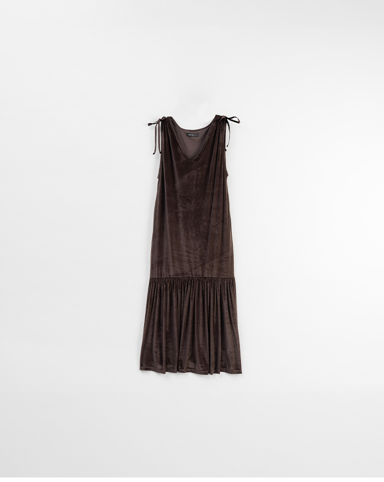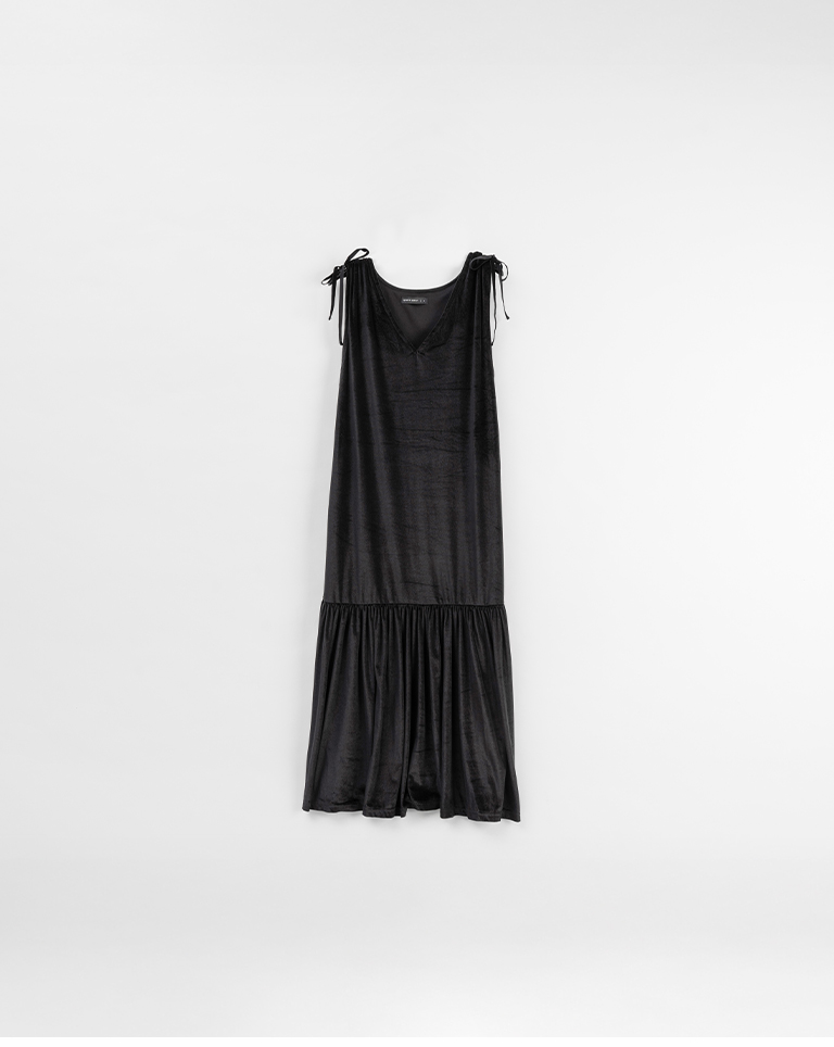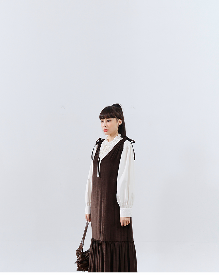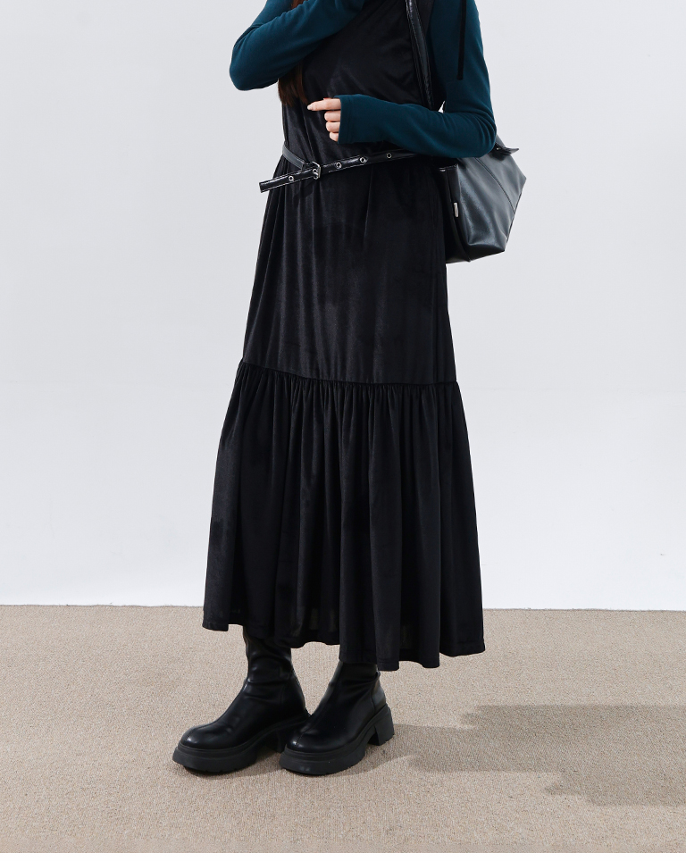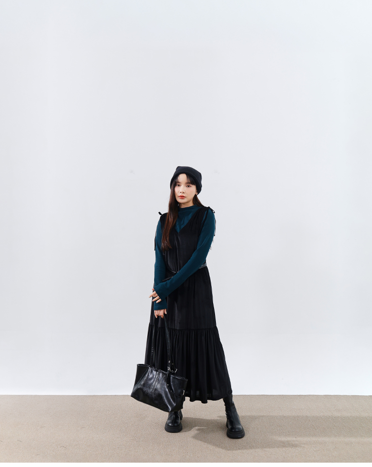 微光澤絨面V領肩綁帶長洋裝 兩色售