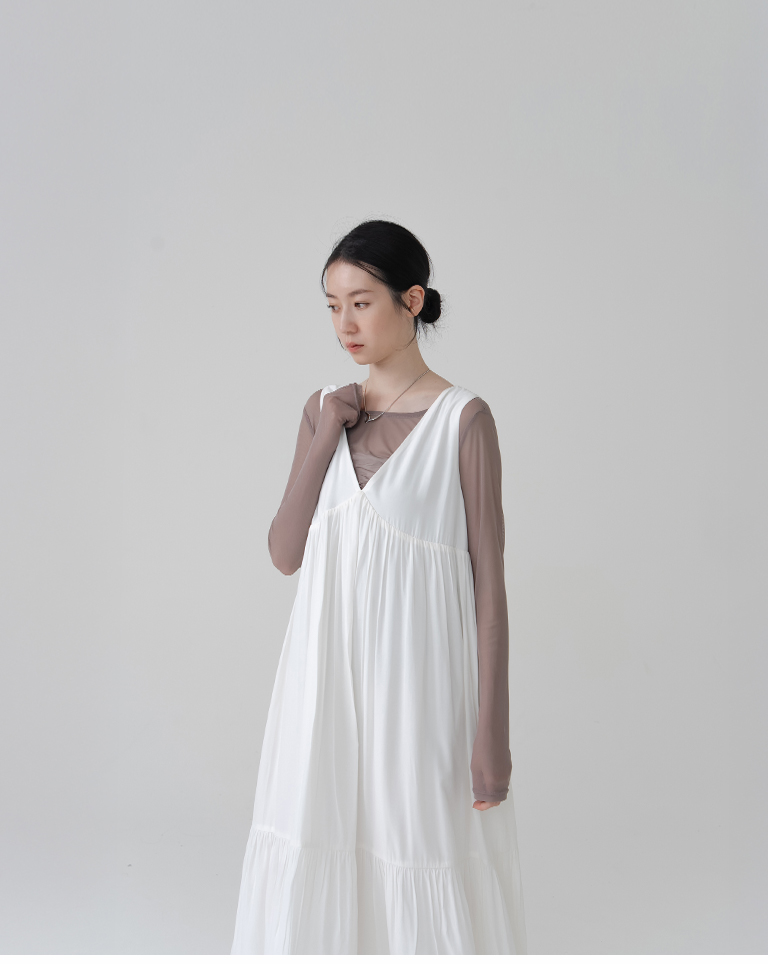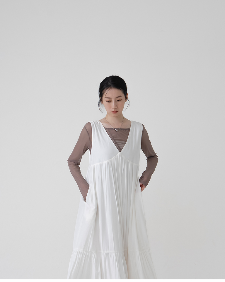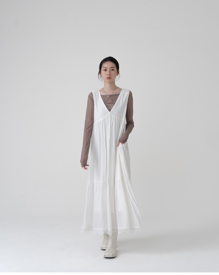 剪接V領下擺蕾絲長背心洋裝-米白