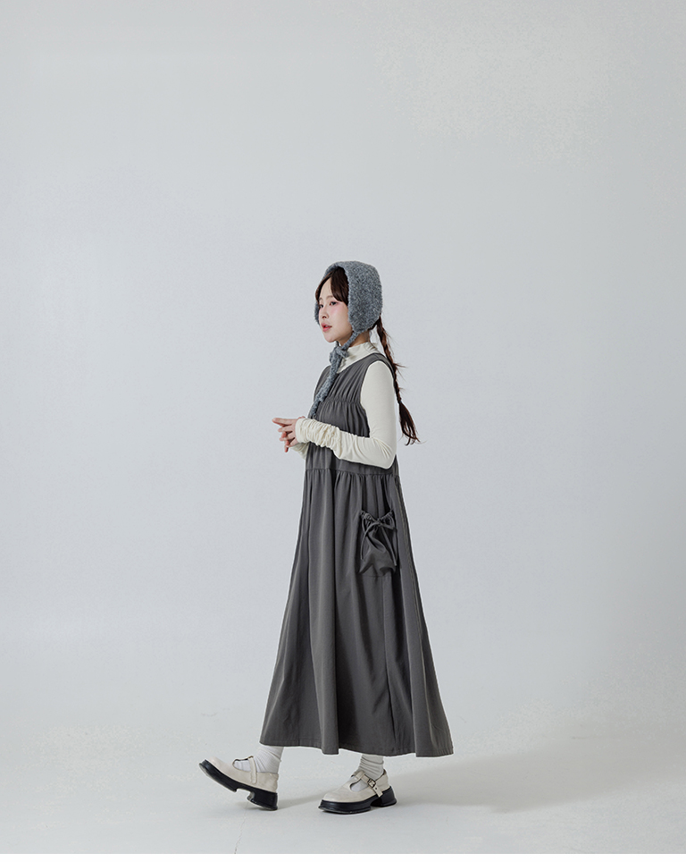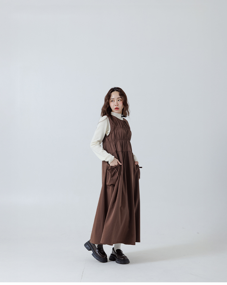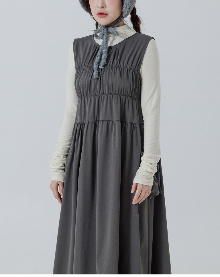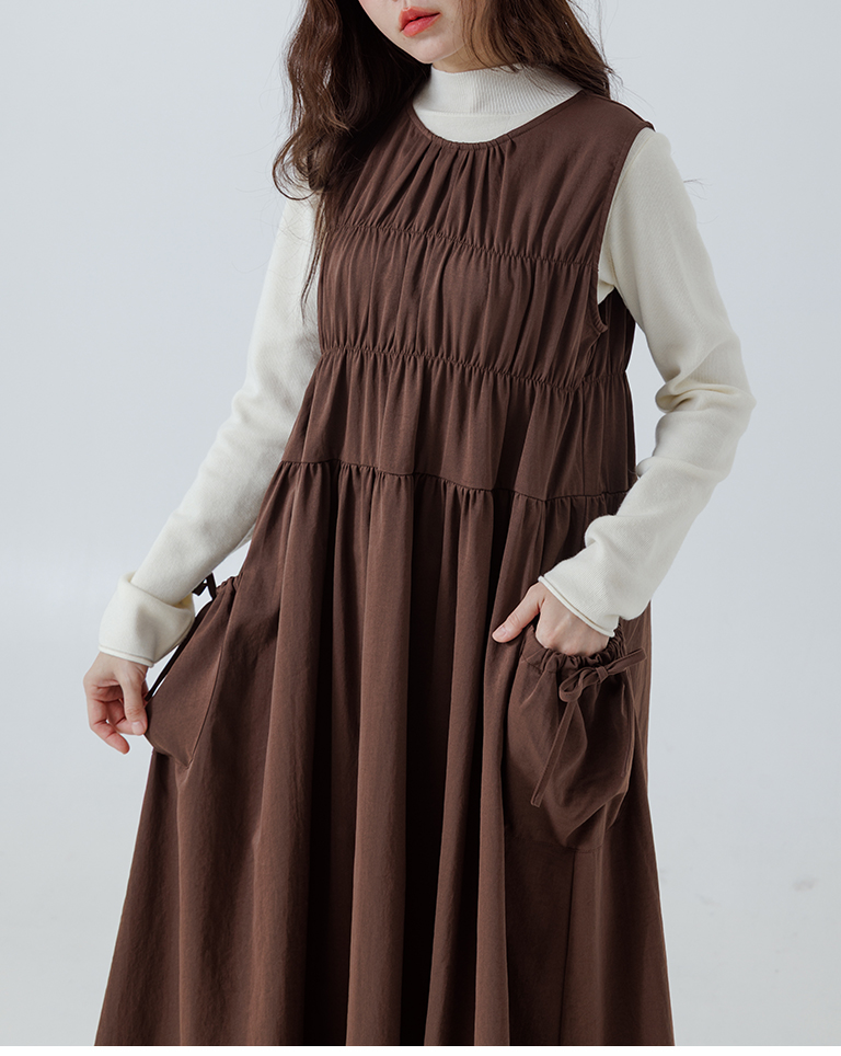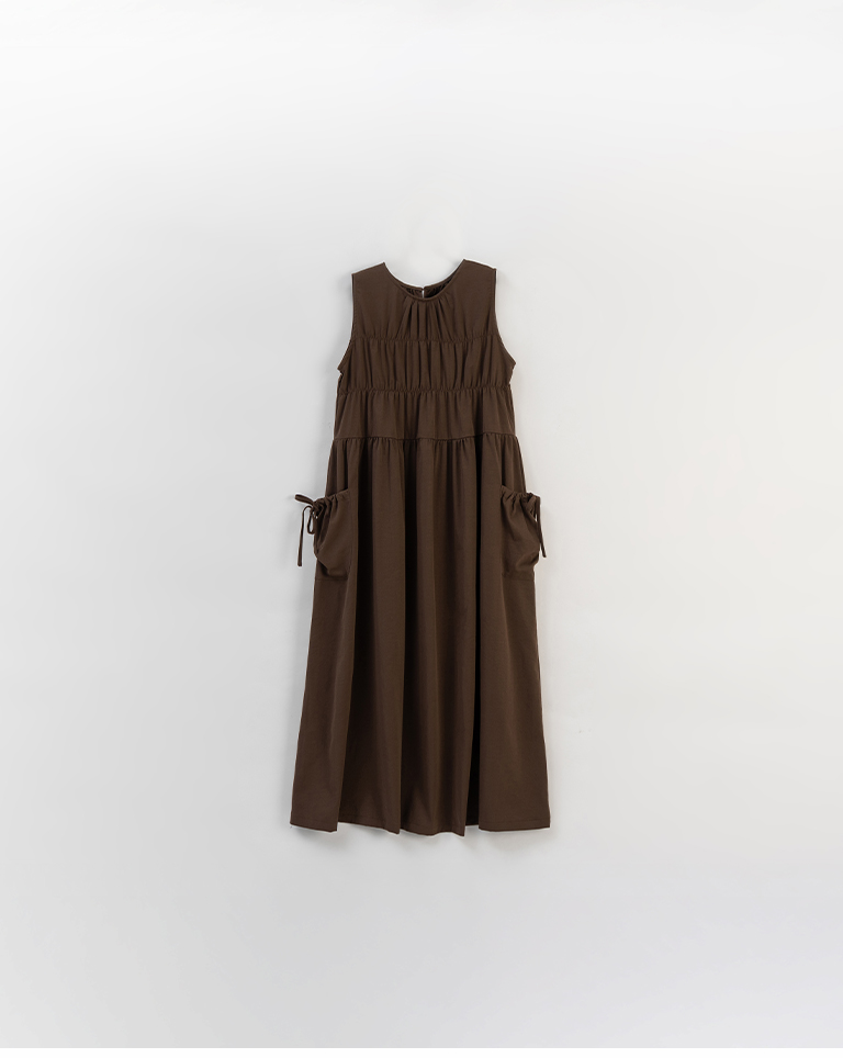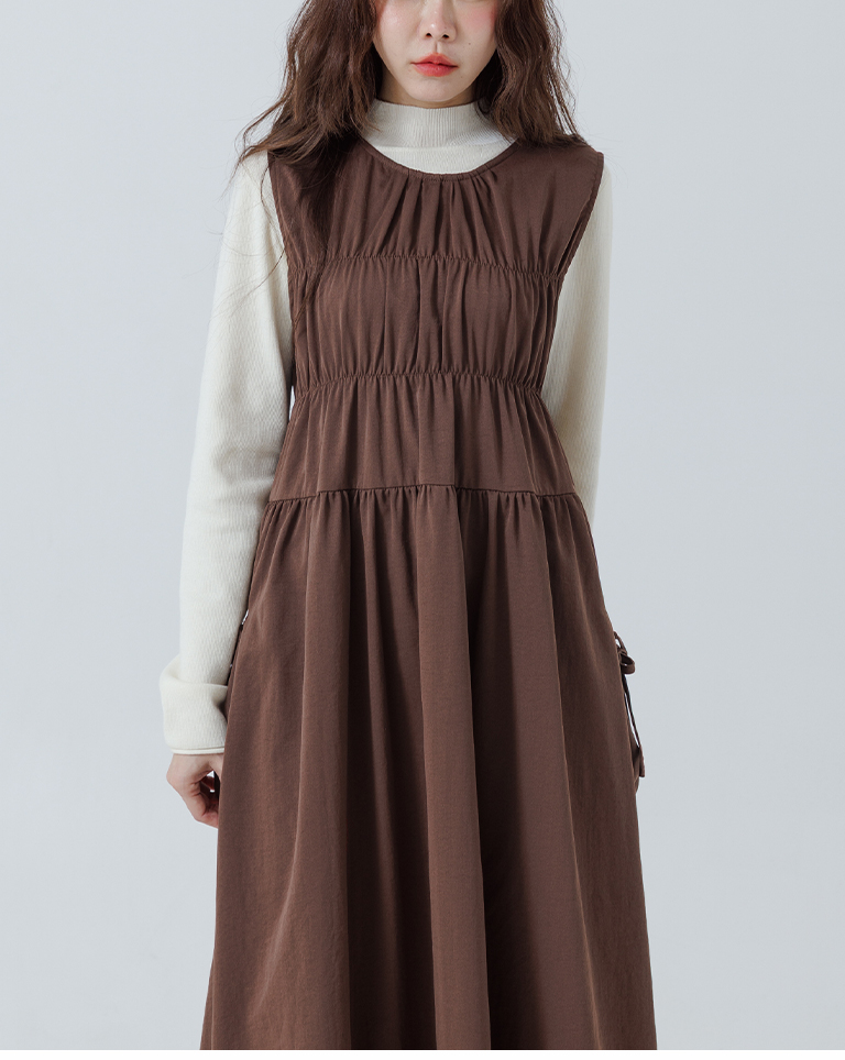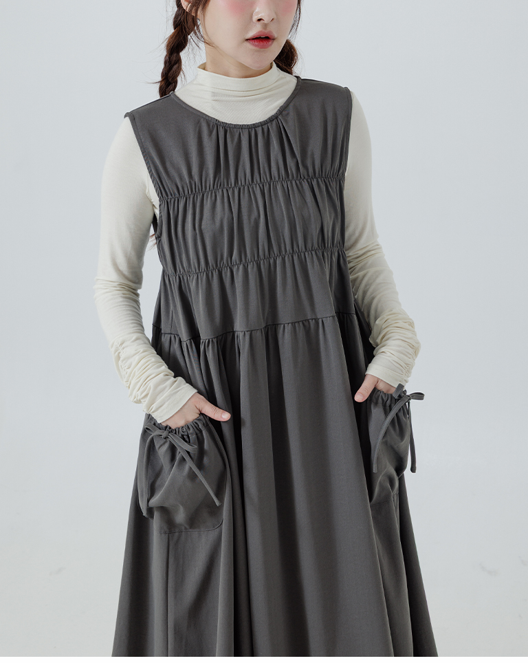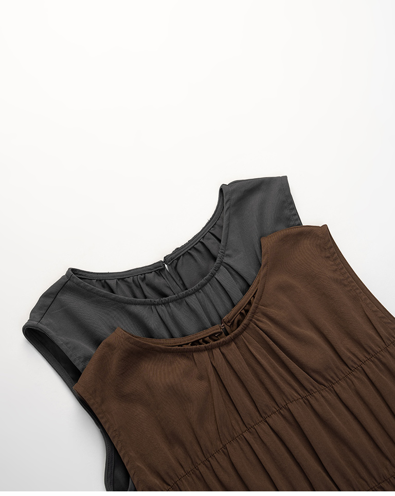 抓皺剪接綁帶背心長洋裝