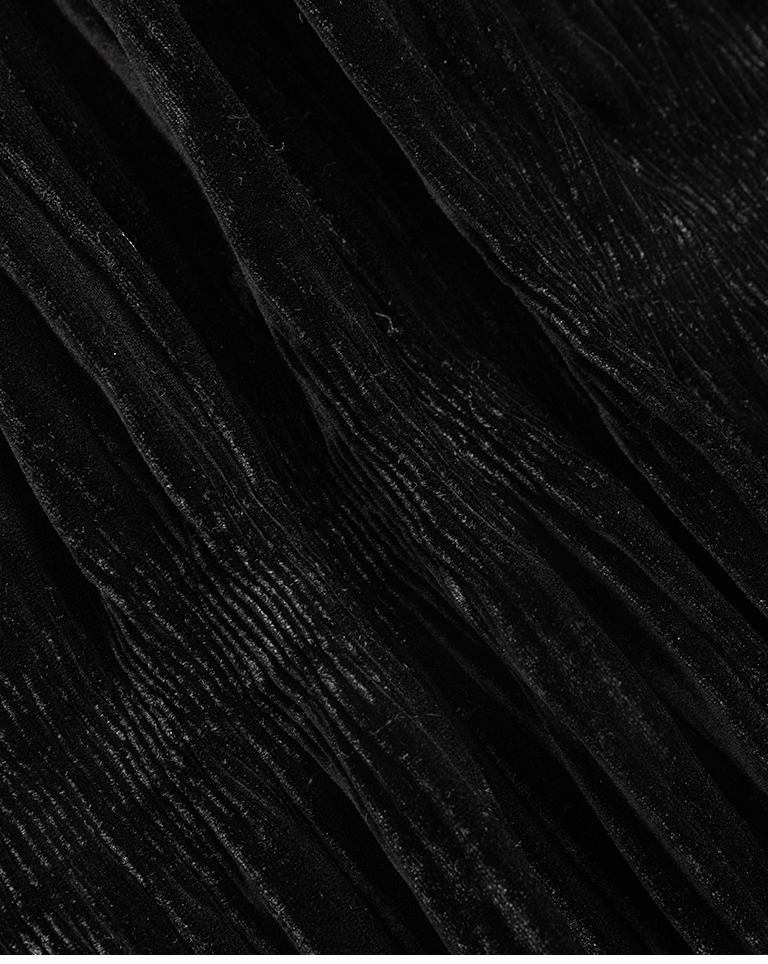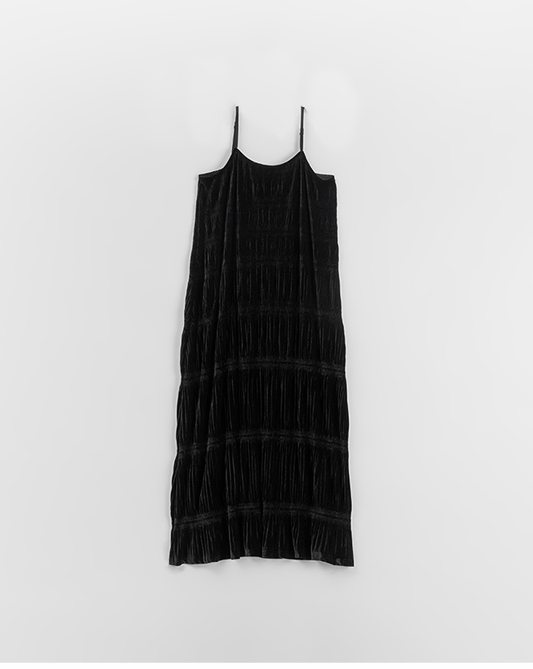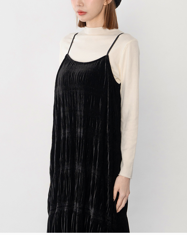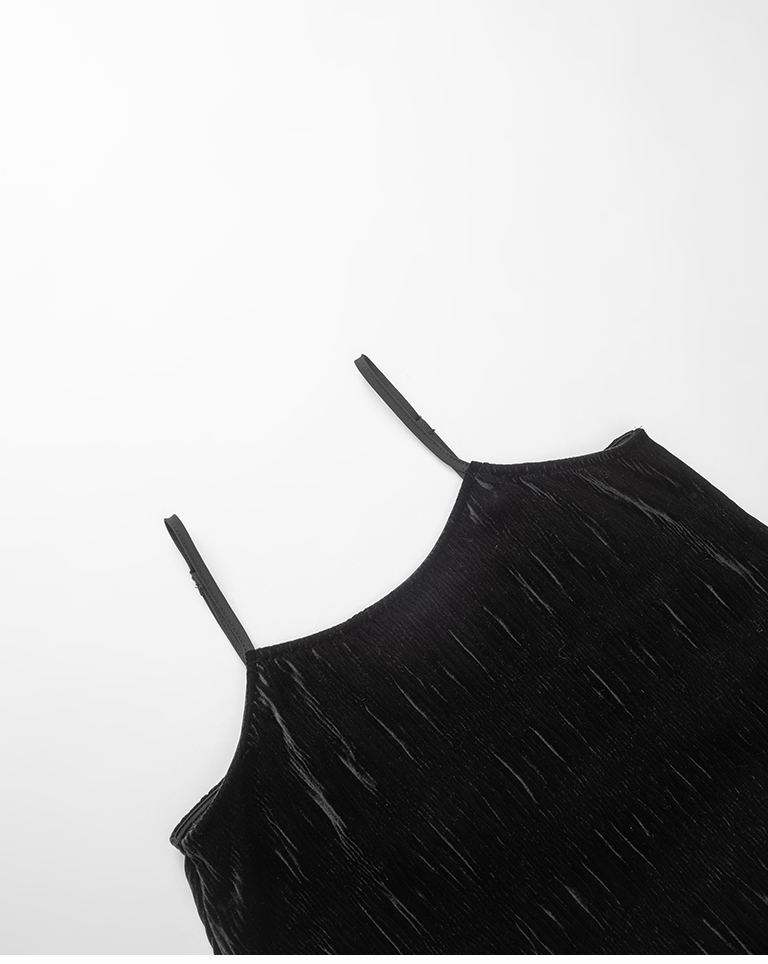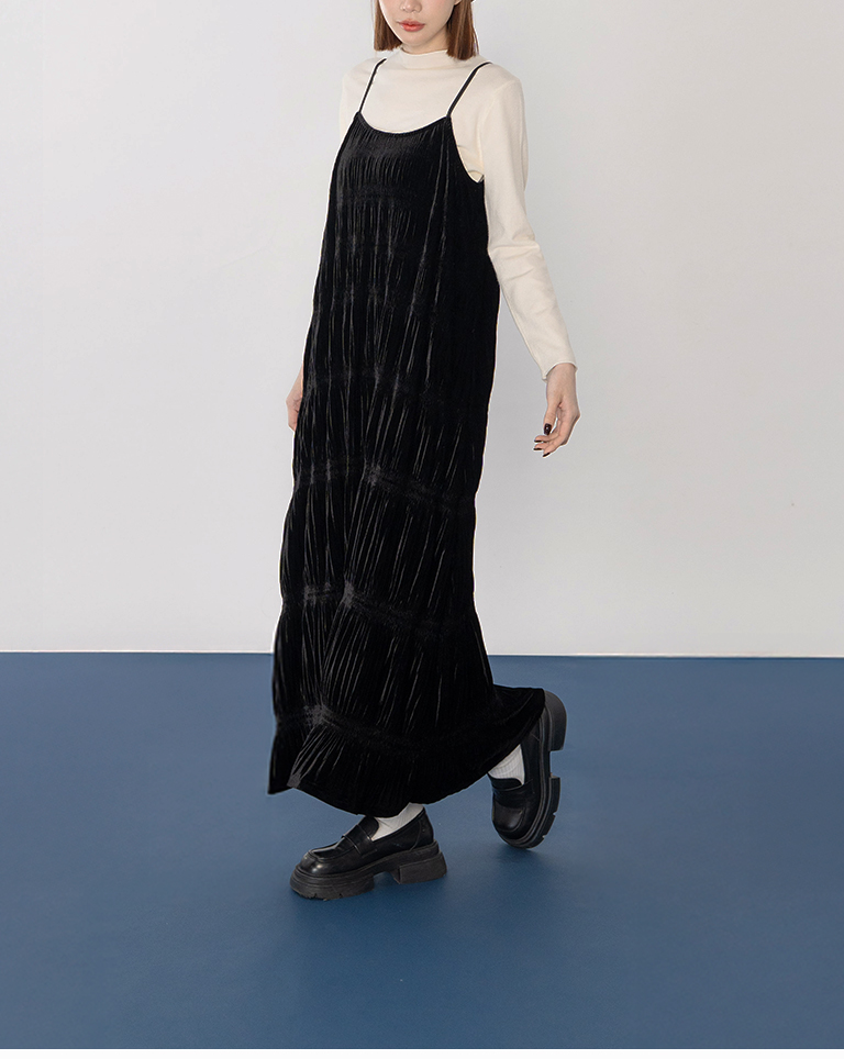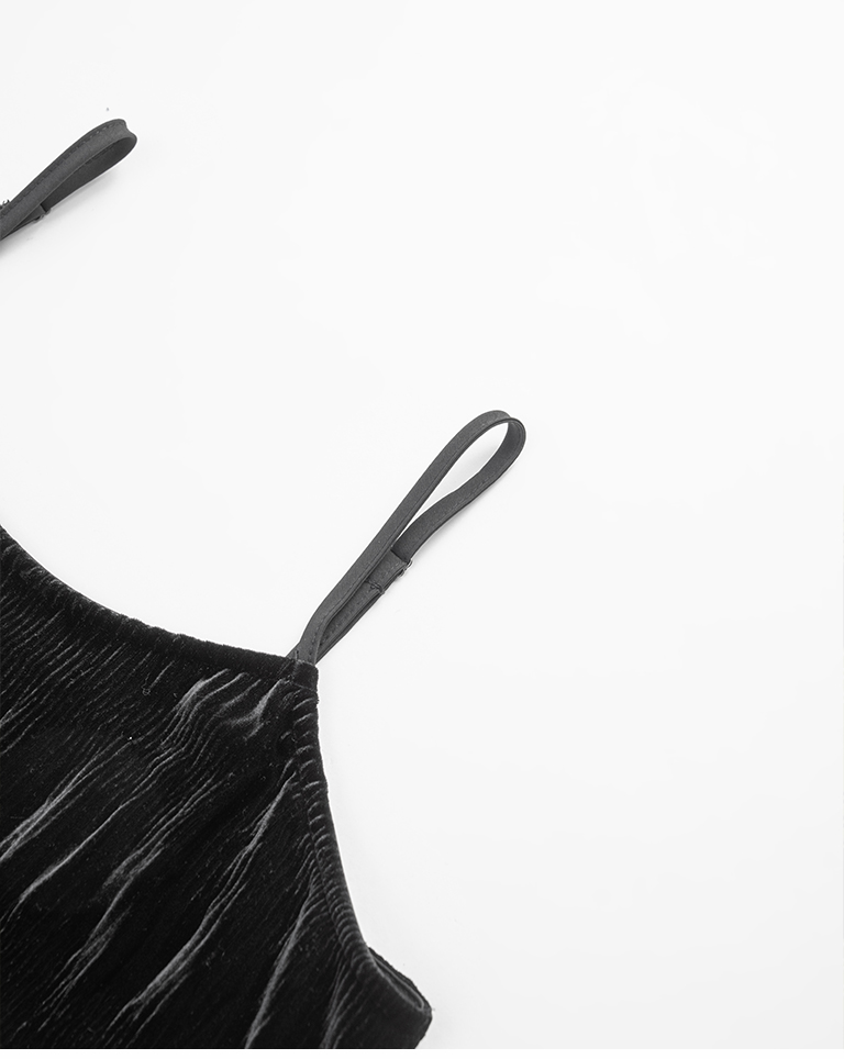 光澤絲絨壓褶細肩長洋裝