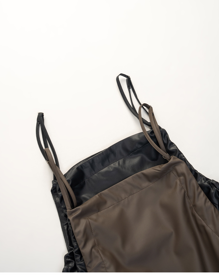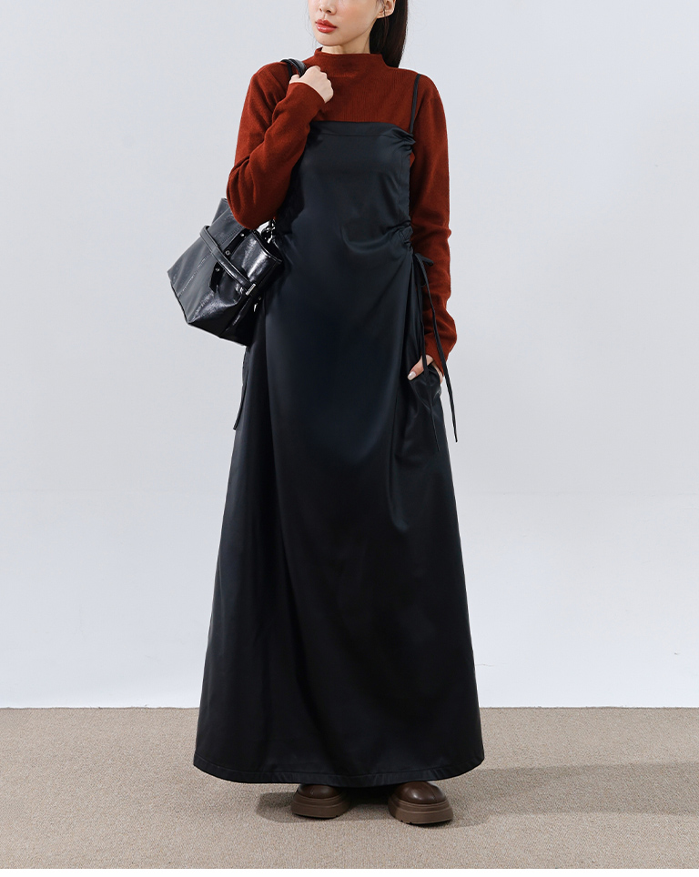 質感側抽皺綁帶細肩皮洋裝 兩色售