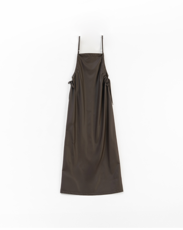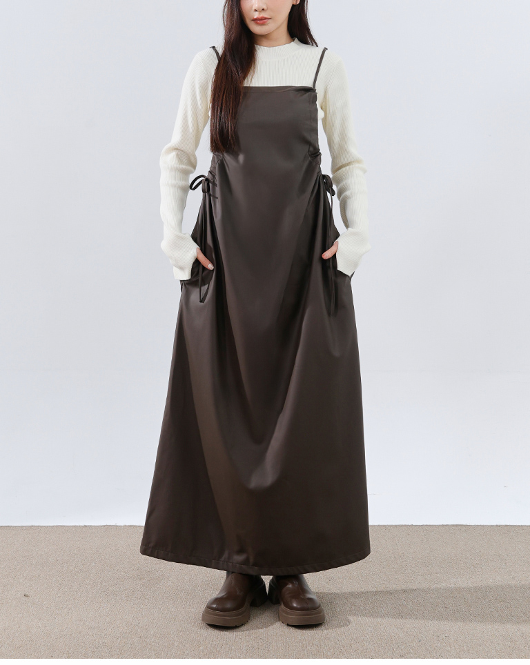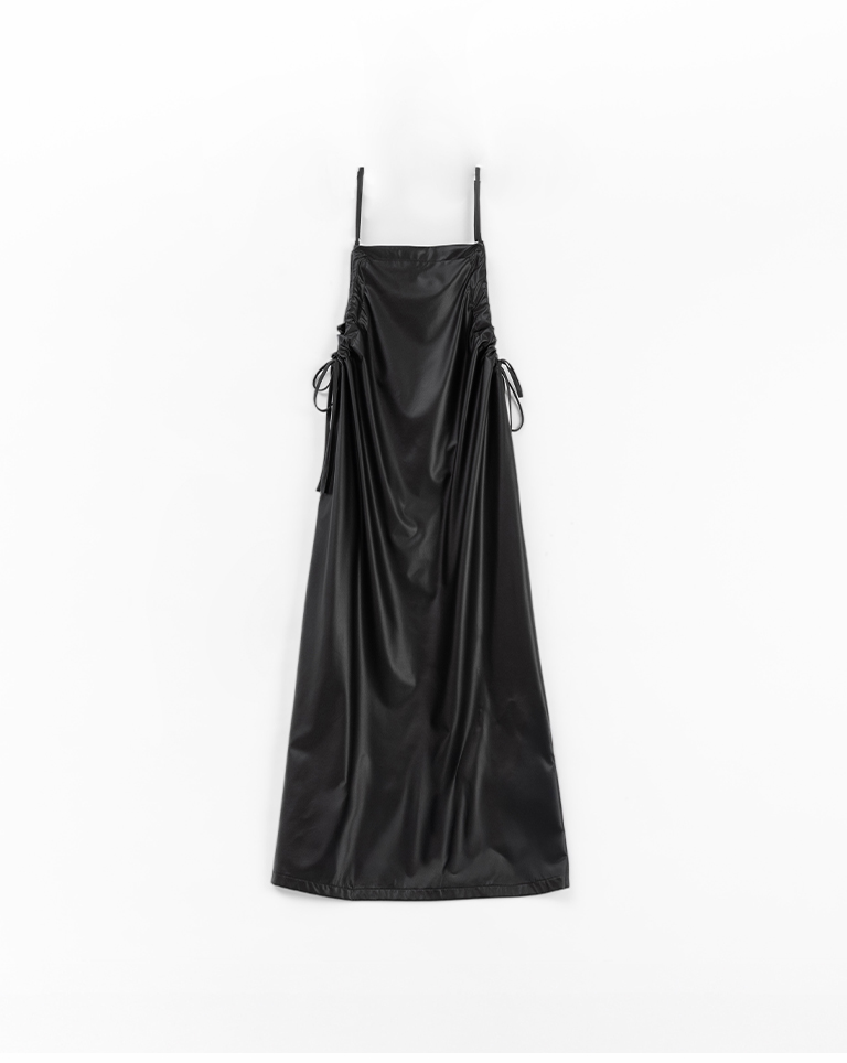 質感側抽皺綁帶細肩皮洋裝