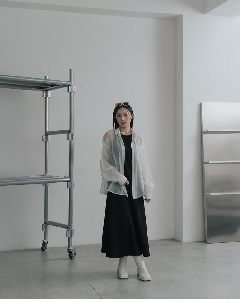 S~L身形實測!分尺寸皺皺木耳邊透膚高領長袖上衣