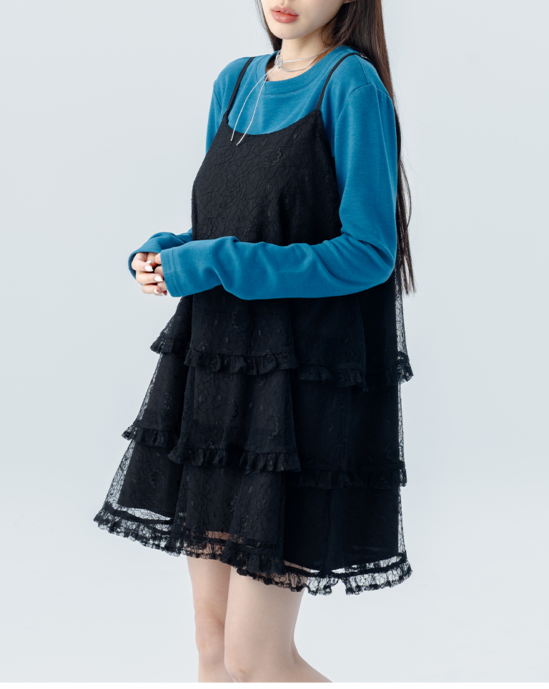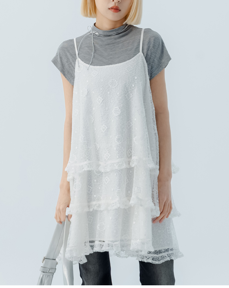 蕾絲荷葉蛋糕剪接細肩短洋裝