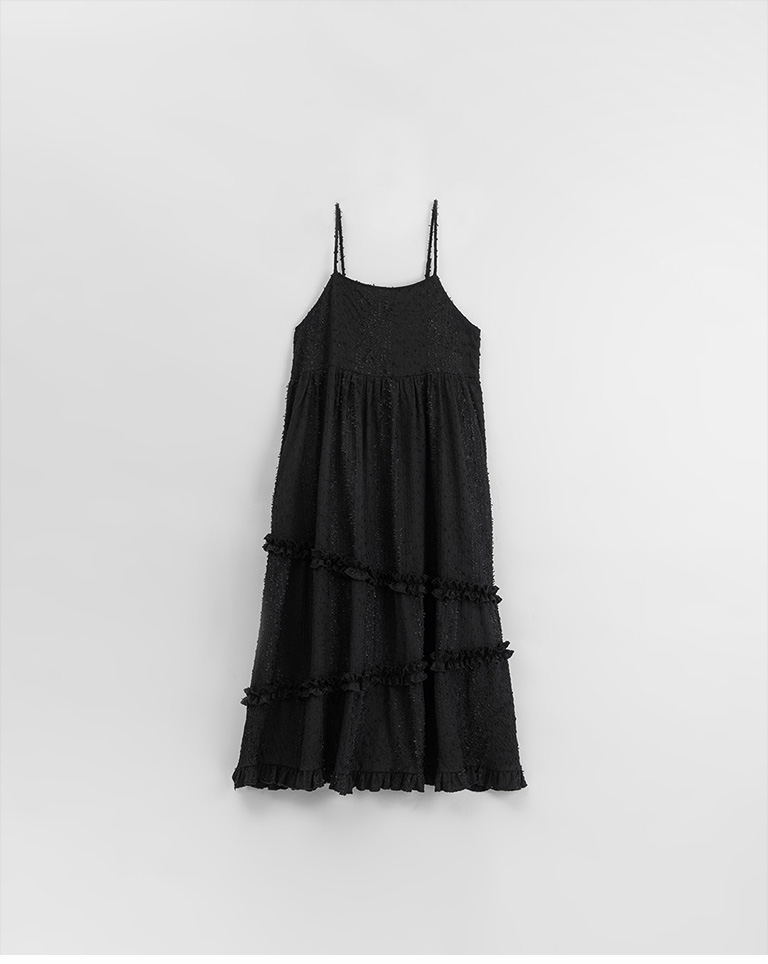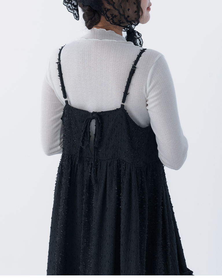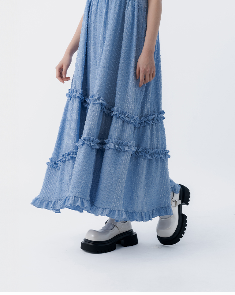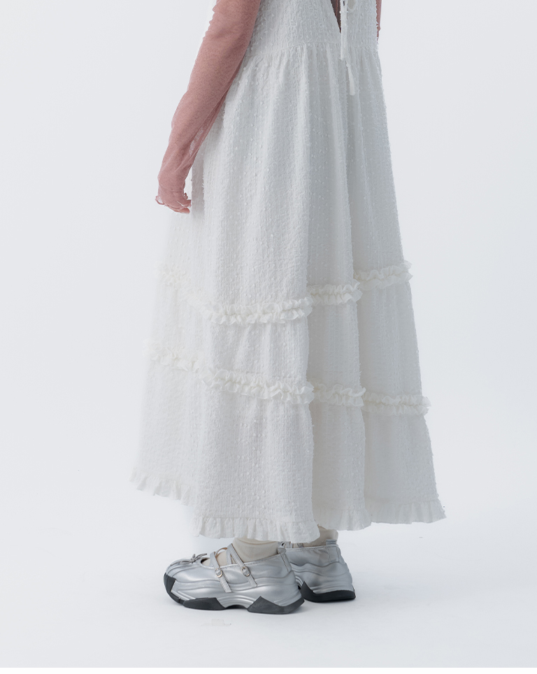 立體緹花荷葉邊綁帶長洋裝