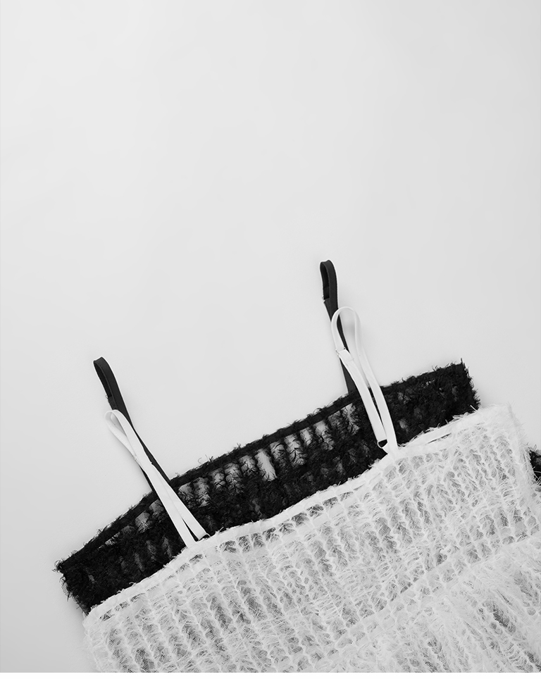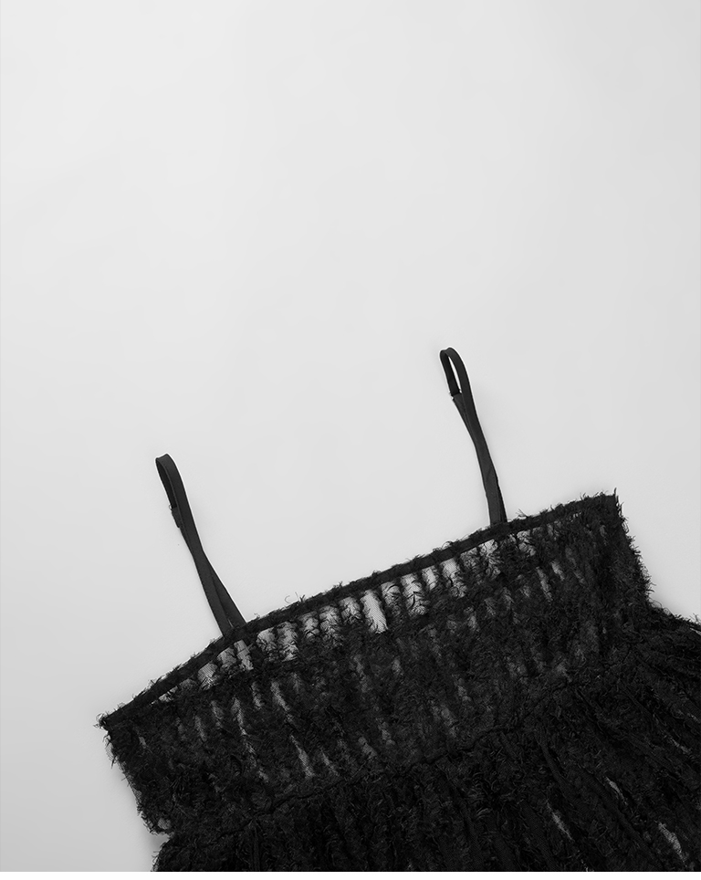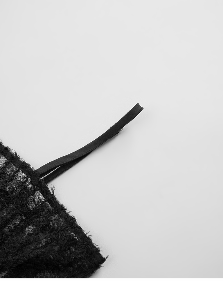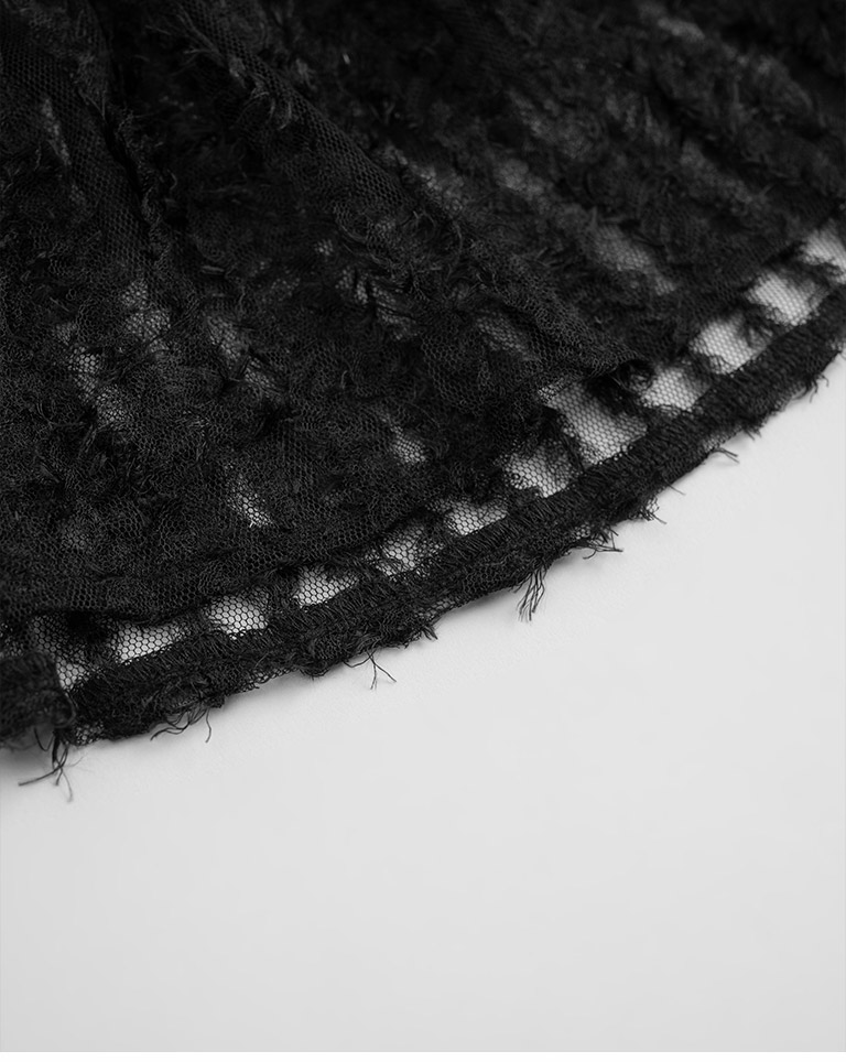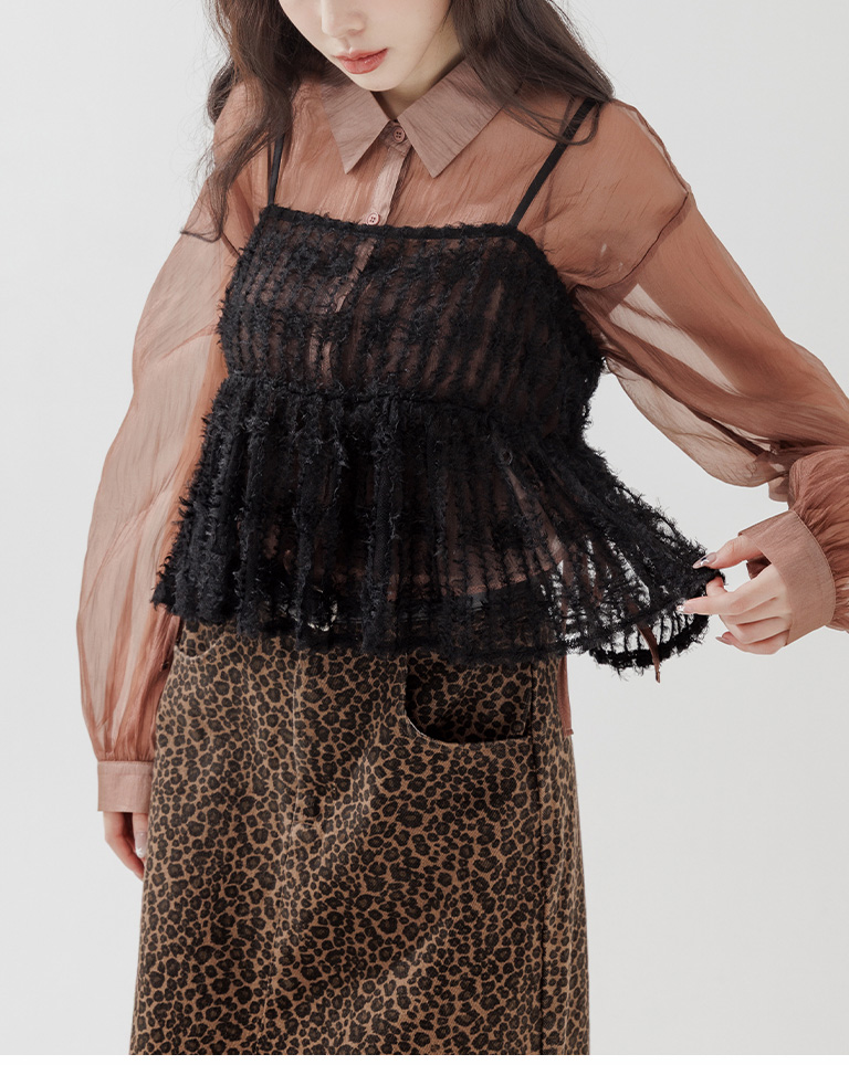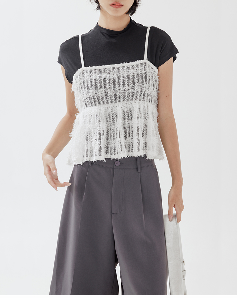 立體羽毛透膚細肩網紗罩衫 兩色售