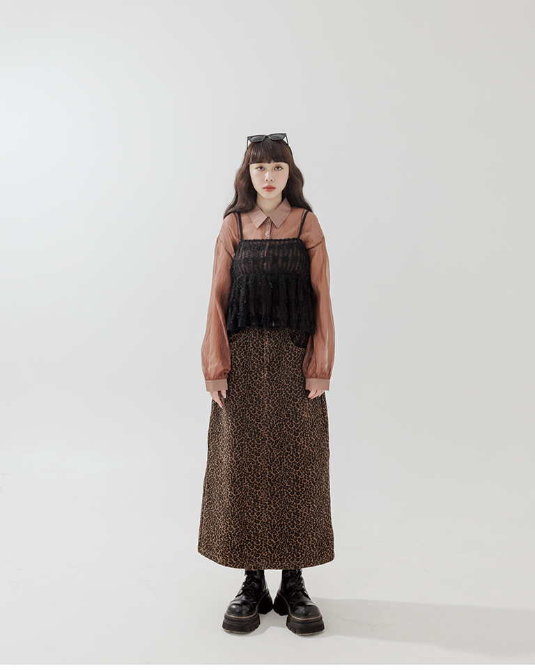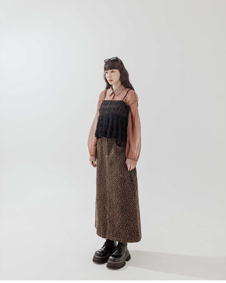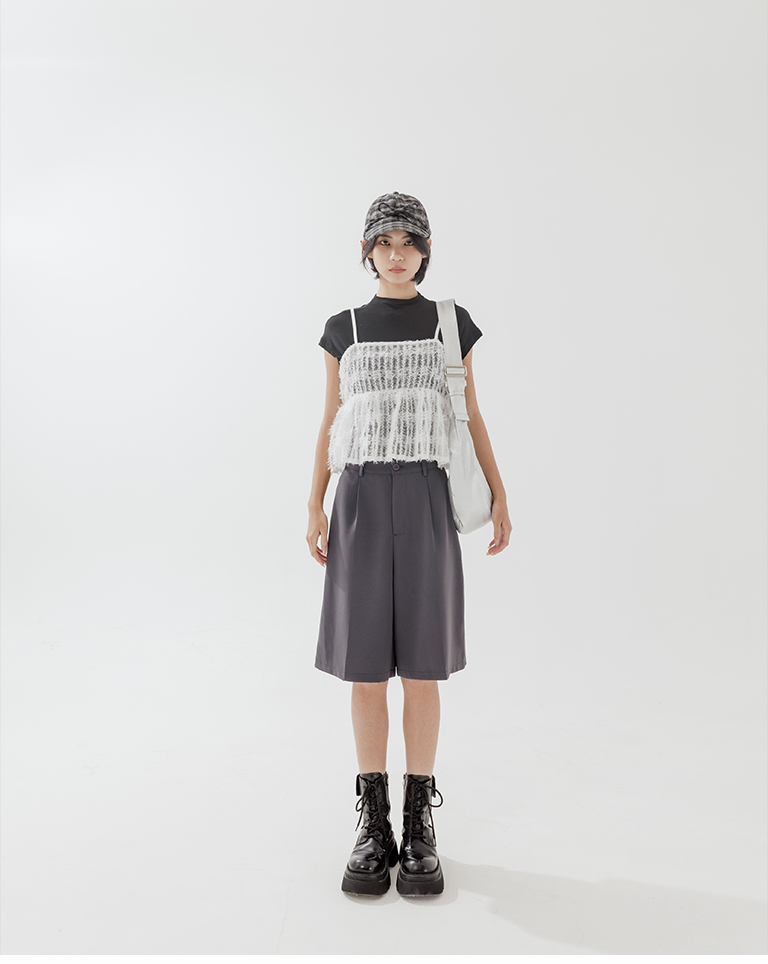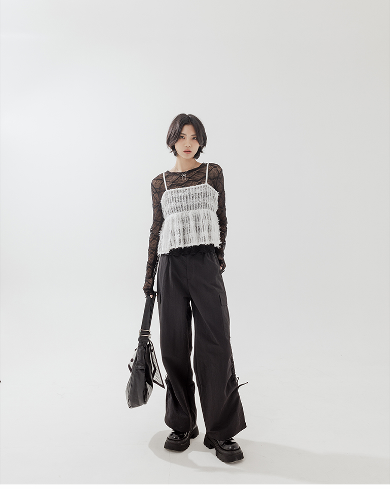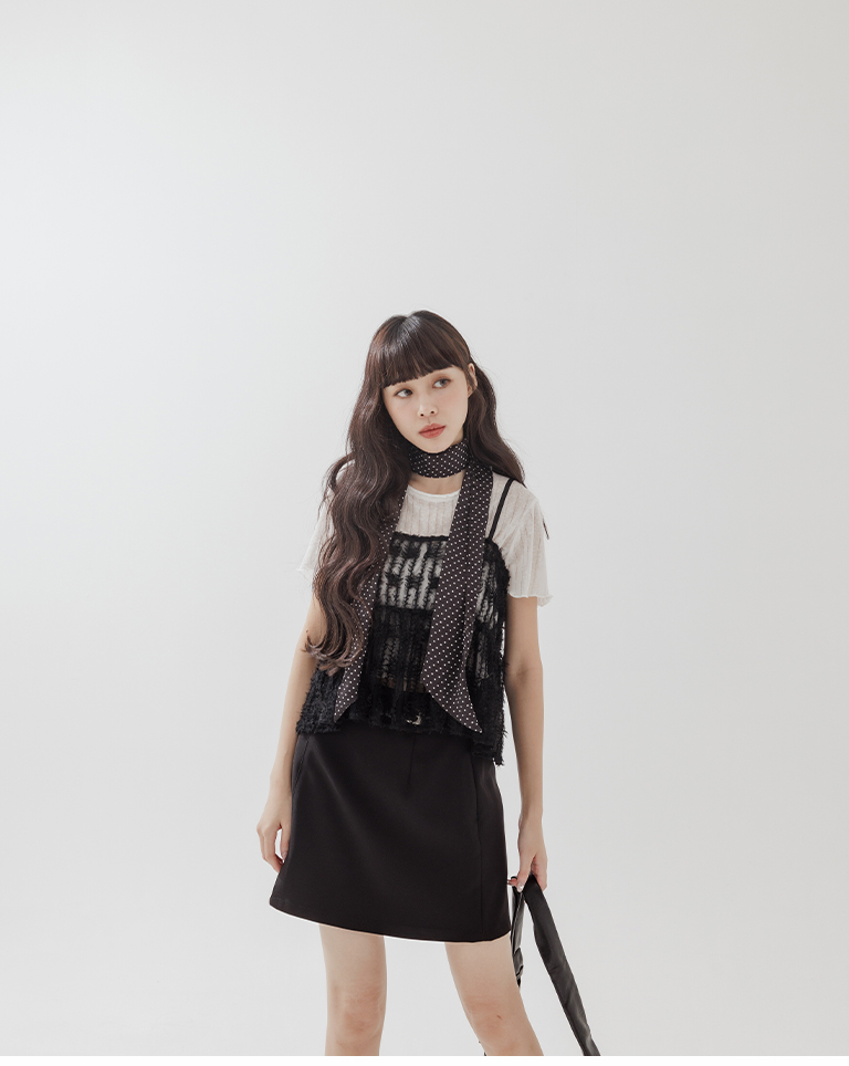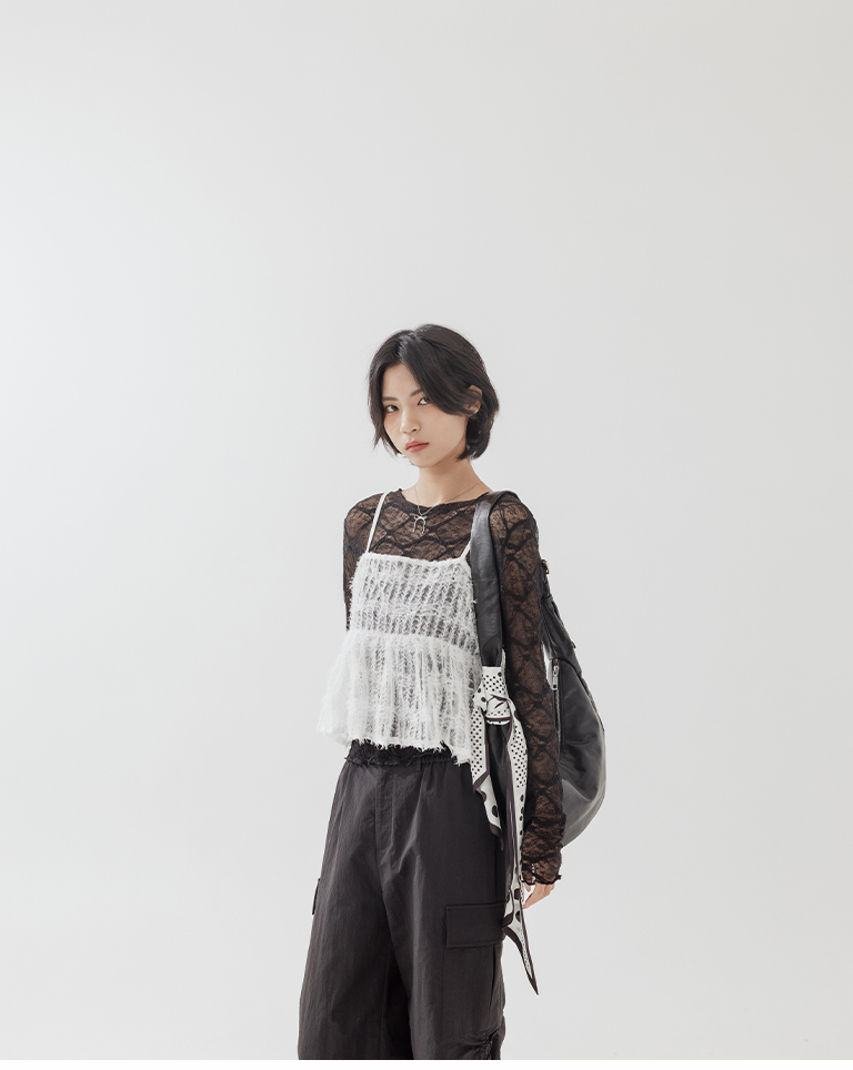 立體羽毛透膚細肩網紗罩衫 兩色售