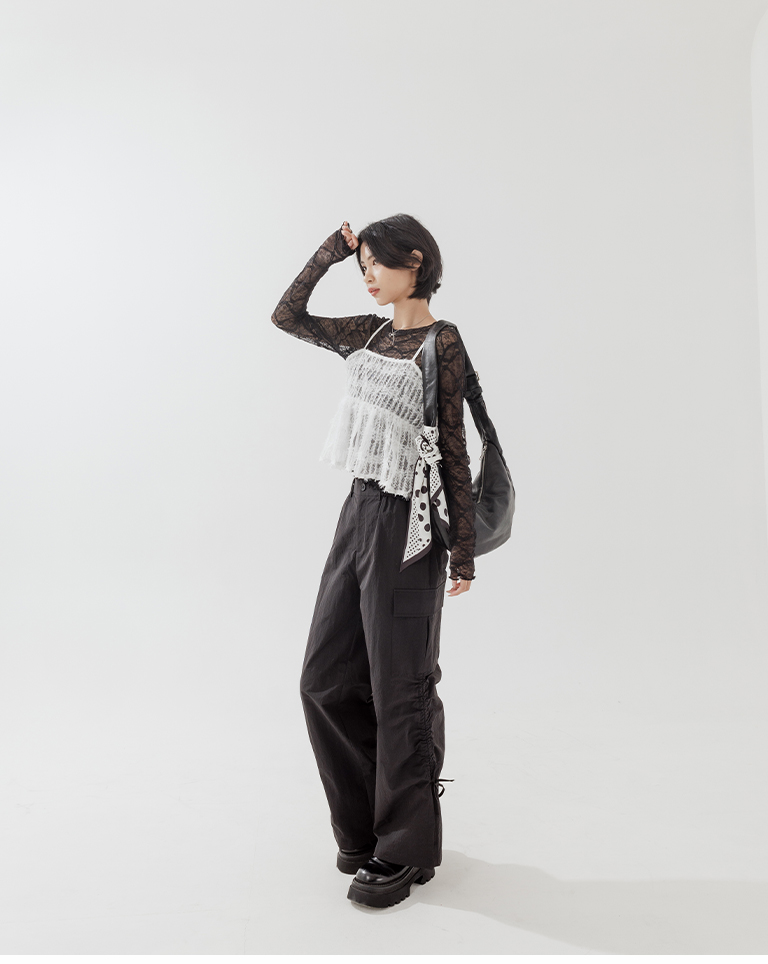 S~L身形實測!分尺寸皺皺木耳邊透膚高領長袖上衣