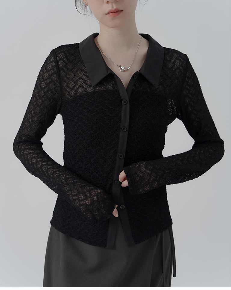 S~L身形實測!分尺寸皺皺木耳邊透膚高領長袖上衣
