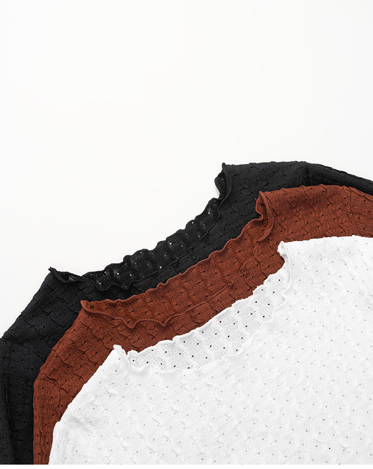 S~L身形實測!分尺寸皺皺木耳邊透膚高領長袖上衣