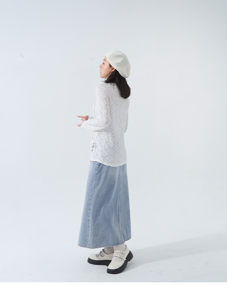 S~L身形實測!分尺寸皺皺木耳邊透膚高領長袖上衣