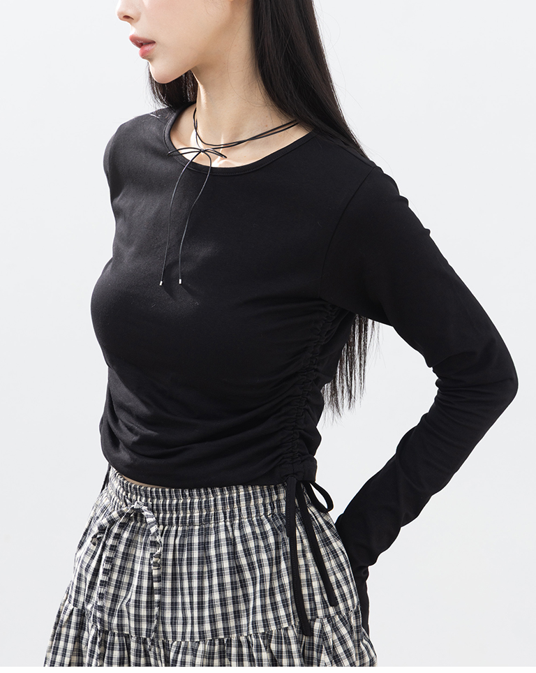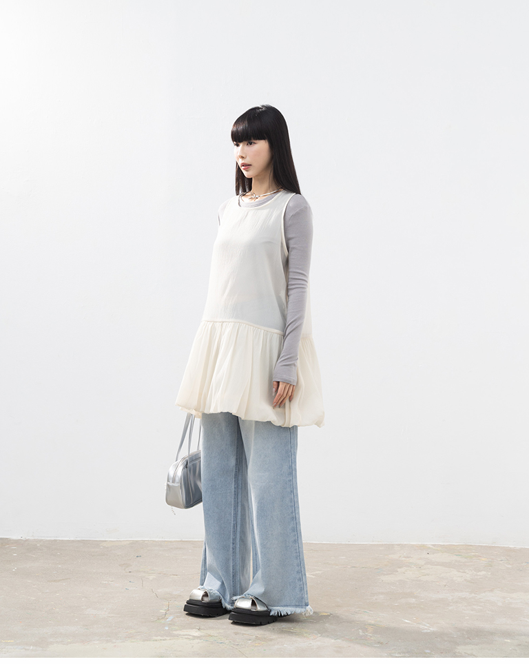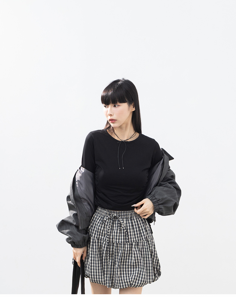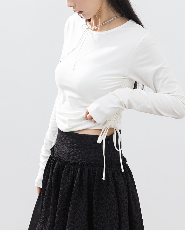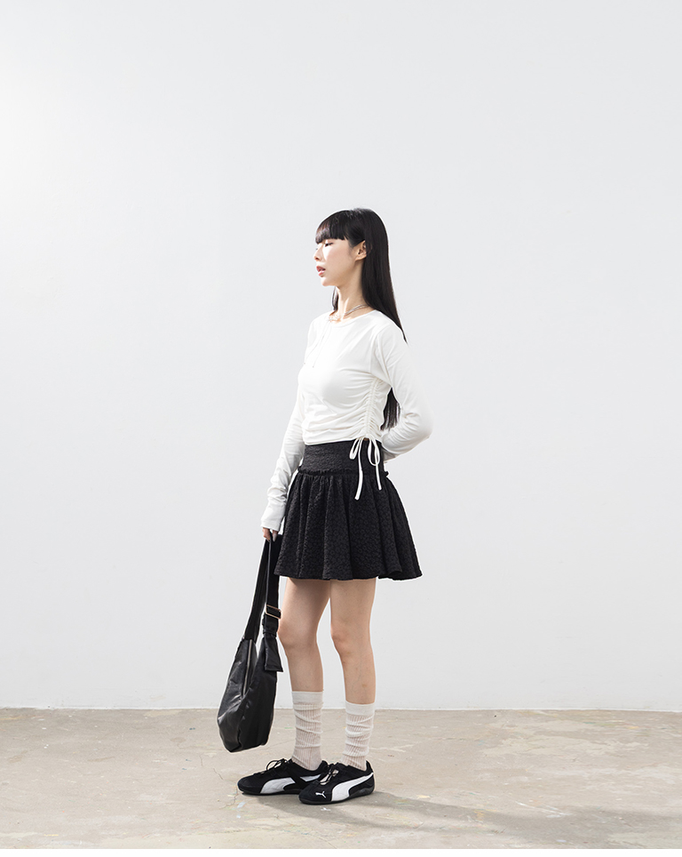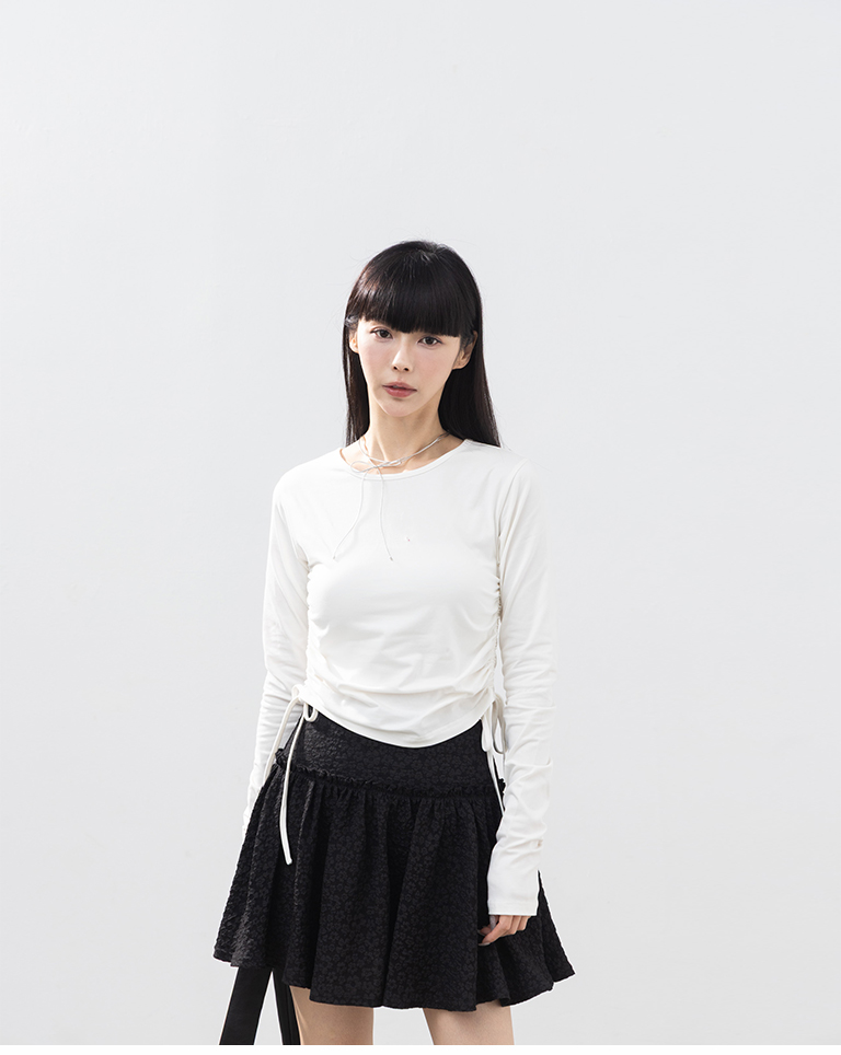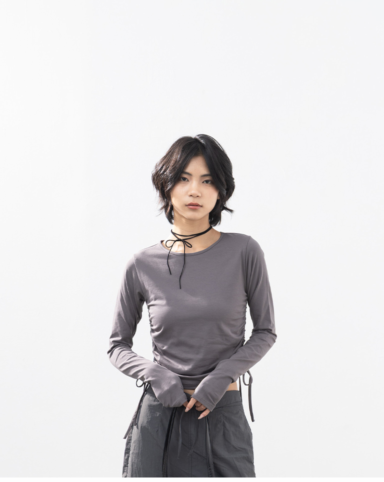 S~L身形實測!分尺寸皺皺木耳邊透膚高領長袖上衣