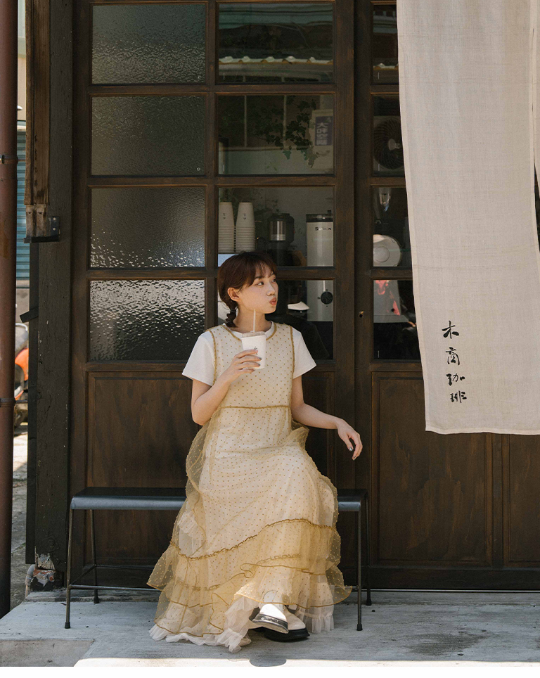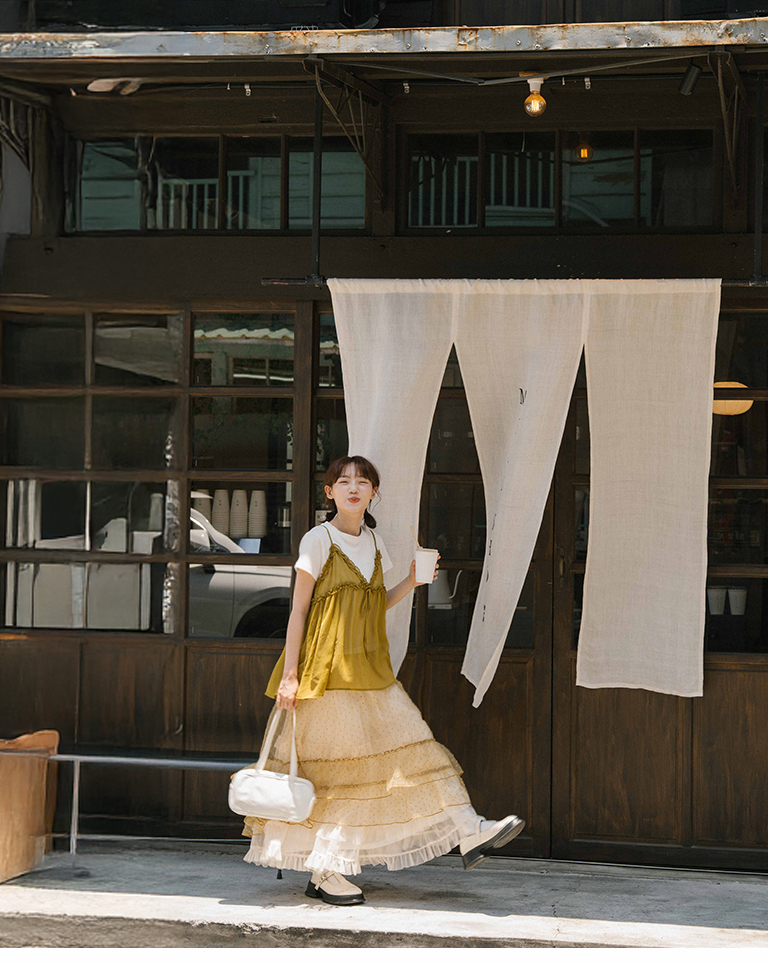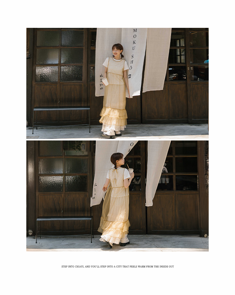 立體點點蛋糕下擺透膚綁帶罩衫-芥黃
