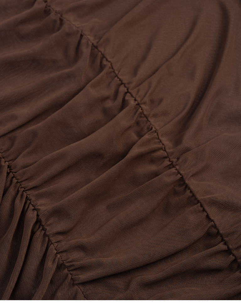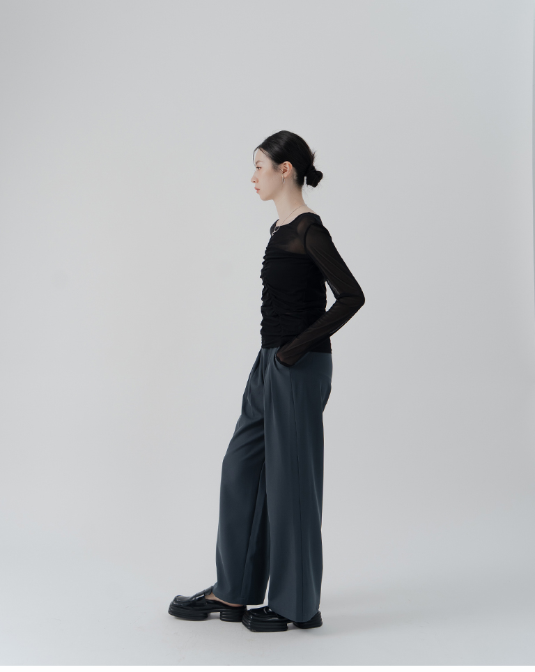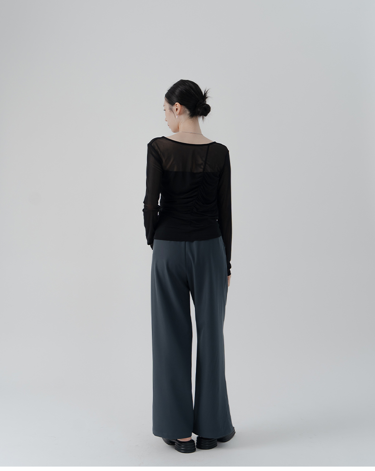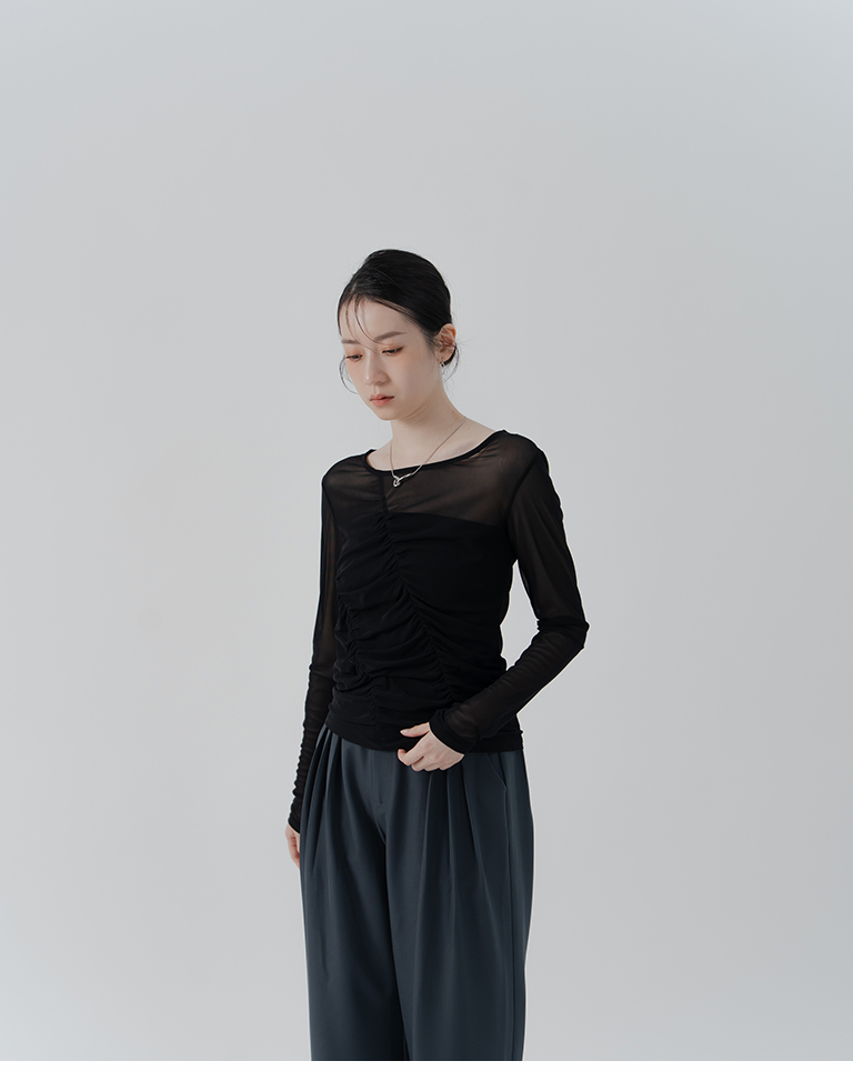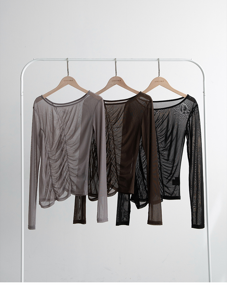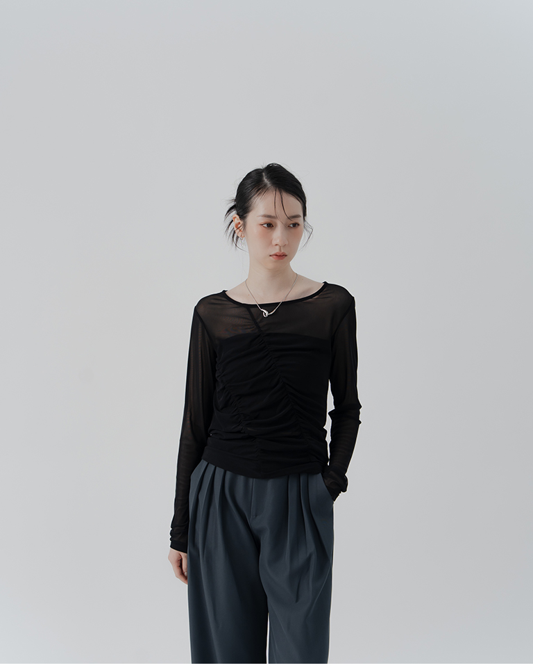 S~L身形實測!分尺寸皺皺木耳邊透膚高領長袖上衣