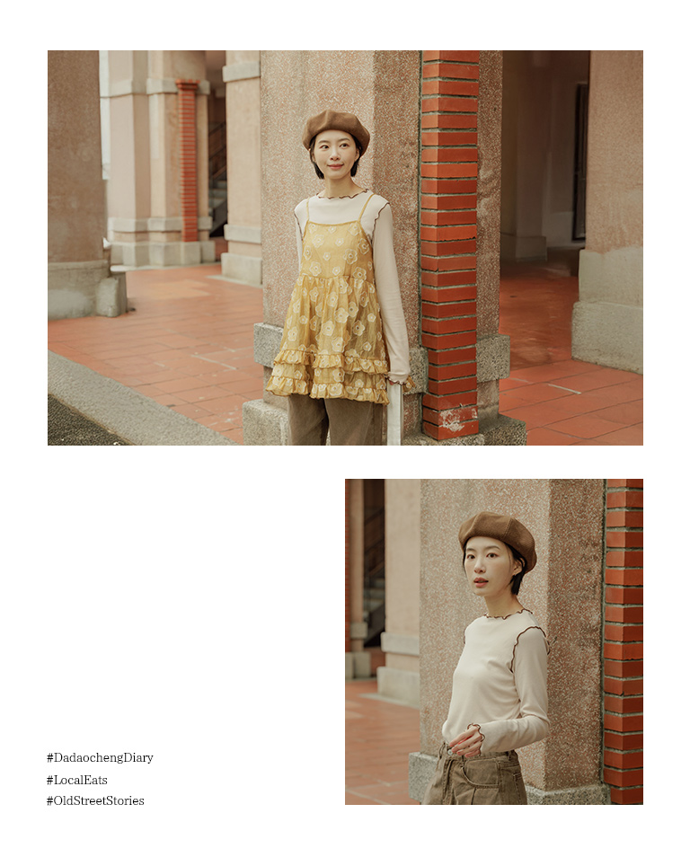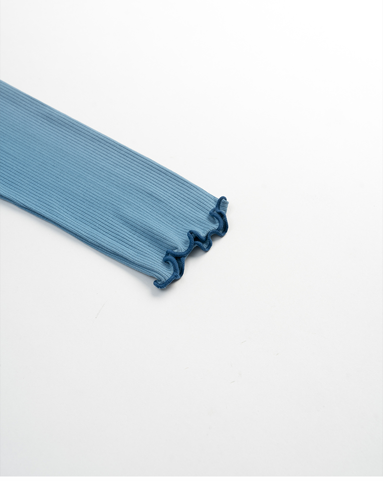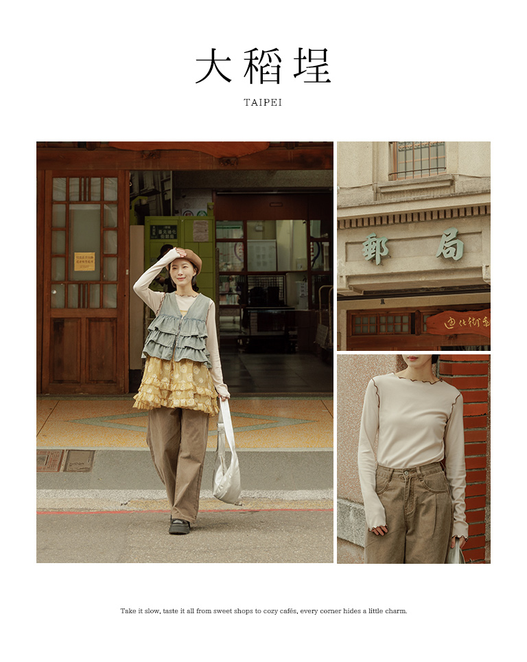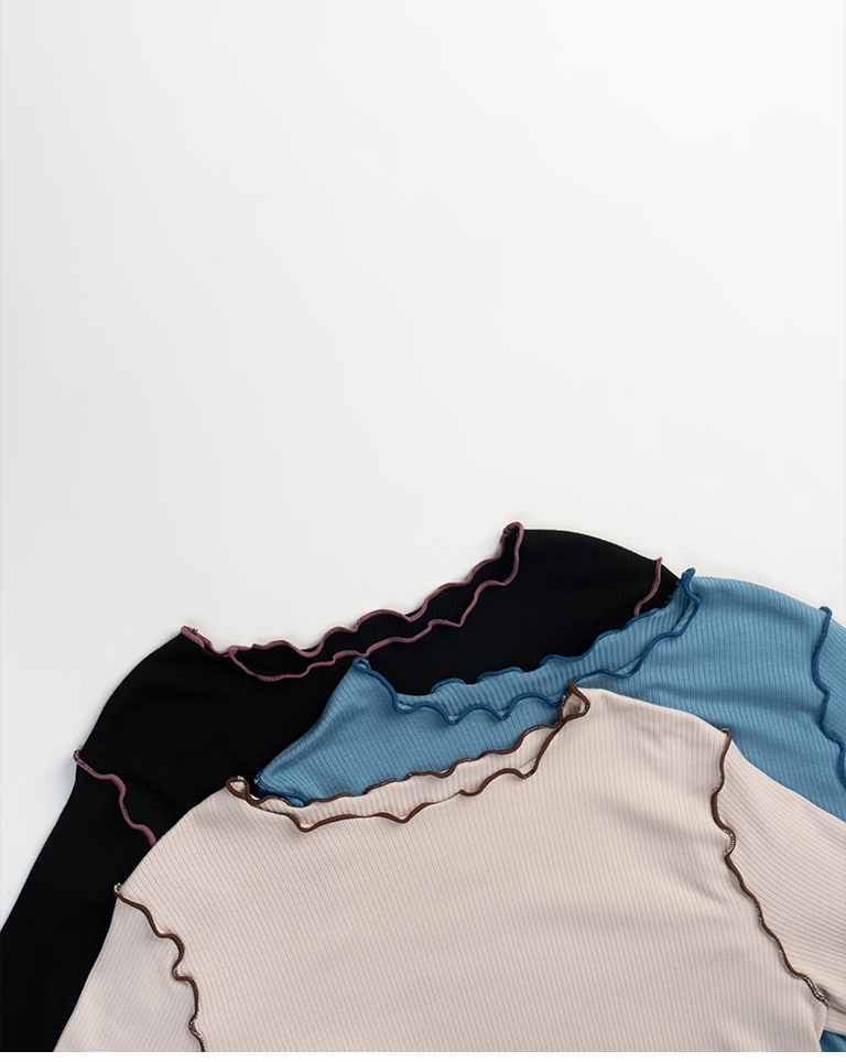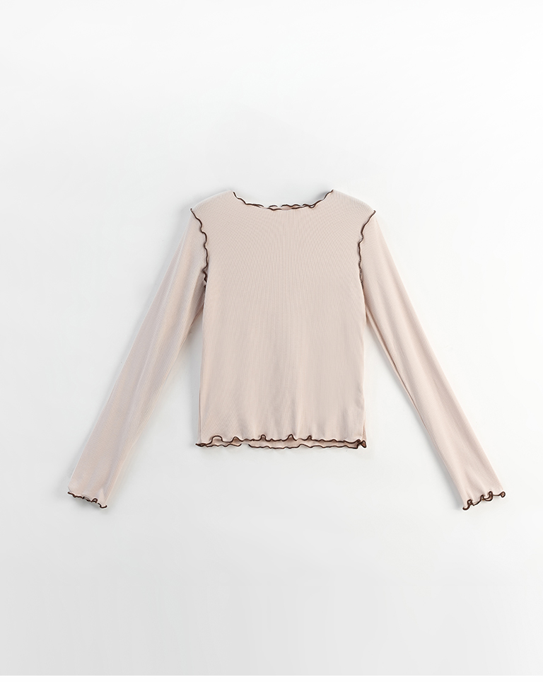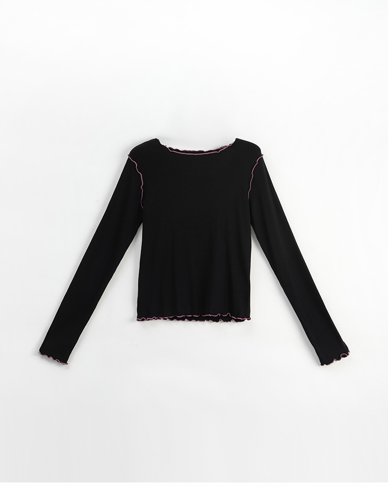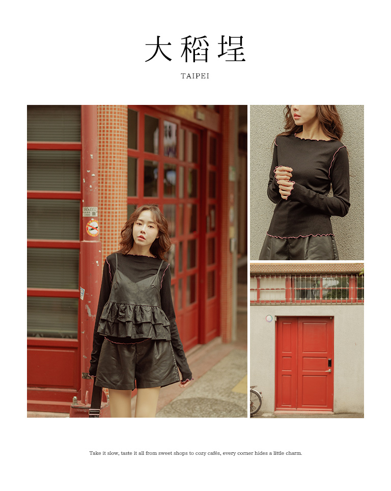 領口、袖口與下擺配色木耳邊設計