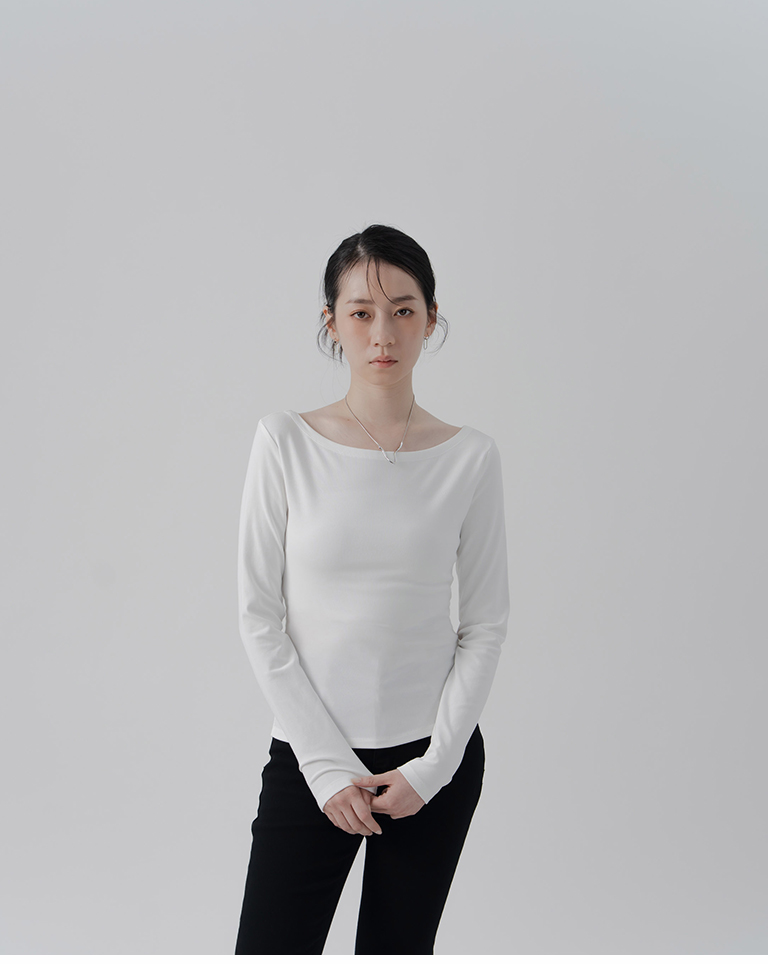 素色平領彈性設計長袖上衣-米白 S/M/L